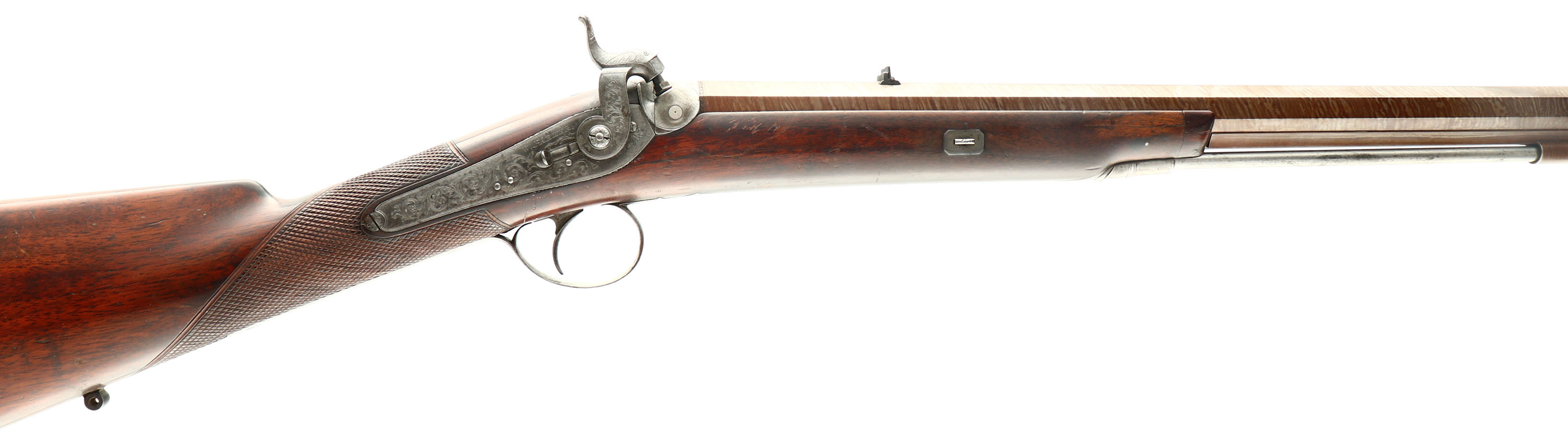 W.Parker, Boar Hunting Rifle, CAL: 54, MFG: late 1830's, SN: 8388, Percussion Muzzleloader, 30 1/4'' barrel. This gun was made by William Parker of 233 High Holborn, London 1793-1841. Parker was Gunmaker to the Duke of Kent, Prince Edward & William IV. The top of the barrel is marked ''W.Parker'' & ''Maker To His Majesty. Holborn.London''. The side plate is marked ''W.Parker''. The side plate, hammer, upper tang, trigger guard, buttplate, screws & metal accent components are all tastefully hand engraved with floral/ornamental scroll patterns. The checkered & beaded cheek straight grip wood stock is very good & solid. There are contusions, dings, scratches & scrapes, with protective oils added over time, contributing to some areas darkening. The laminted steel pattern on the barrel is crisp & the browned finish is excellent. The side plate, hammer, upper tang & trigger guard are all left-in-the-white. Bore is good & bright, with deep grooves, & intermittent roughness/pitting. 2-tier folding leaf rear sight & bead front sight. Bayonet bar on right side of barrel. Smooth metal buttplate. Original steel cleaning rod. Sling provisions on belly of stock & under barrel. An excellent example of the high quality craftsmanship they could produce in the 1800's. Blackpowder, No FFL Req. - Value: 1000 to 2000