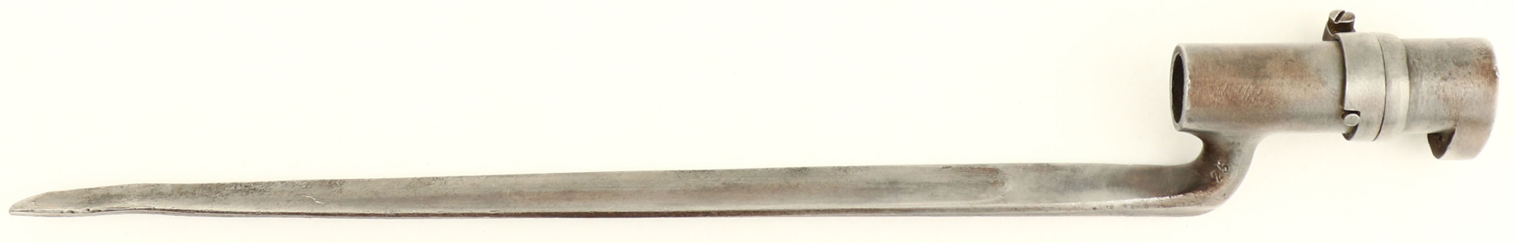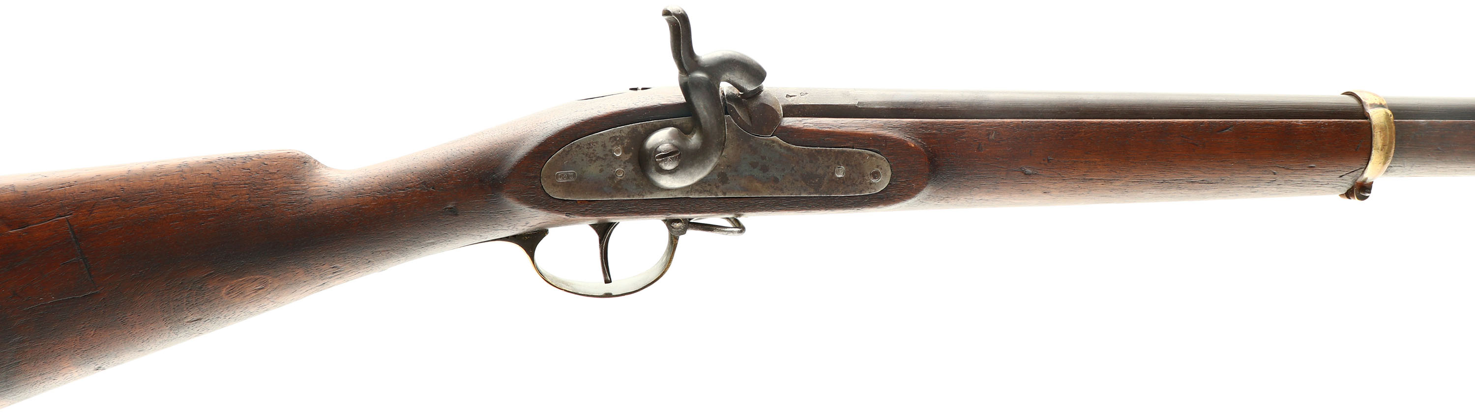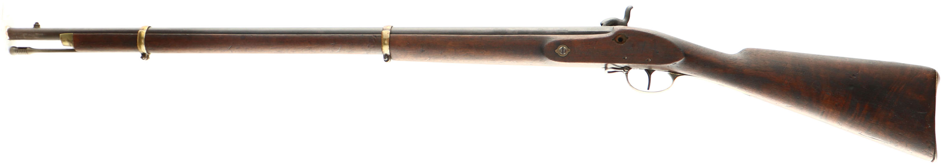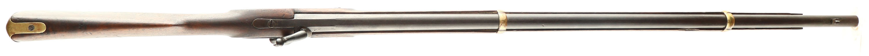 Lambin & Theate, Copy of ''The Little Enfield'', CAL: 47, MFG: 1886-94, SN: NONE, Percussion Muzzleloader, 27 7/'' barrel. Originally, ''The Little Enfield'' muskets were made for Cadets in Brazil. Some examples made it north to America, where they were sold as ''American Civil War'' guns. Although that is inaccurate, it helped attract potential buyers. This example is made by Lambin & Theate (Belgium) from appx 1886-1894. The company was well-known for making copies of ''old'' style arms for export to Africa & South America, where cartridges may have been harder to come by. The barrel is marked ''L&T'' in a rectangle, with proofs on the left/right barrel flats. The side plate is also stamped ''L&T'' in a rectangle. The initials ''W.S.C'' are carved into the left stock flat & left side of buttstock. There may be a couple other non-legible letters throughout the stock. The wood stock is good & solid. There are numerous small contusions, dings, scotches & scrapes. The blued finish on the barrel has toned to a mix of remaining blue & brown patina. The case-hardened side plate retains visible case-colors. Brass hardware has an aged/orange patina. the rear lock plate/side plate screw is missing. Bore is poor, dark & rough. Blade front sight. Brass buttplate. the percussion nipple tip where the cap sit, has broken off, the base of the nipple still in rifle. Scaled down bayonet. This is a functional firearm. Black powder, No FFL Req. - Value: 600 to 1200