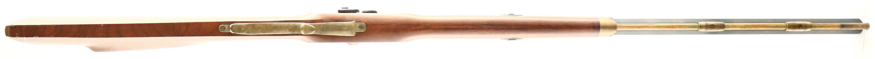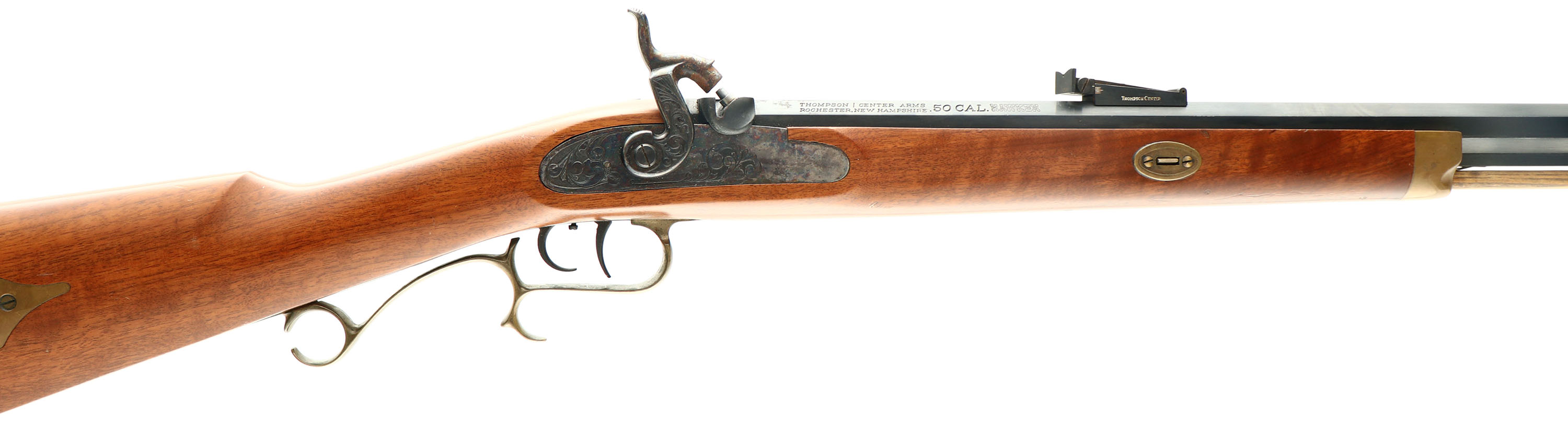 Thompson Center Arms, Hawken Rifle, CAL: 50, MFG: N/A, SN: 390502, Percussion Muzzeloader, 28'' barrel. Factory marking on barrel. Marked ''HAWKEN''. The cheeked straight grip wood stock is excellent. There are some dings & scrapes to the finish. The blued finish on the barrel rates 90%. The case-hardened side plate retains visible, but fading case-colors. Brass hardware has an aged patina. Bore is excellent. Adjustable rear sight & blade front sight. Double set triggers. Crescent metal buttplate. Blackpowder, No FFL Req. - Value: 250 to 450