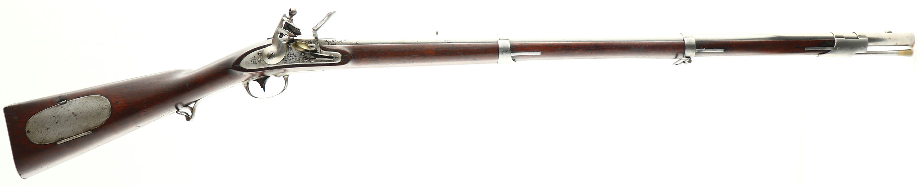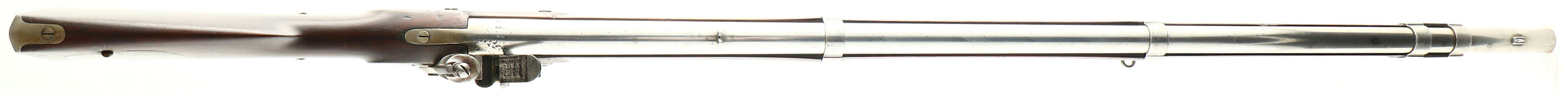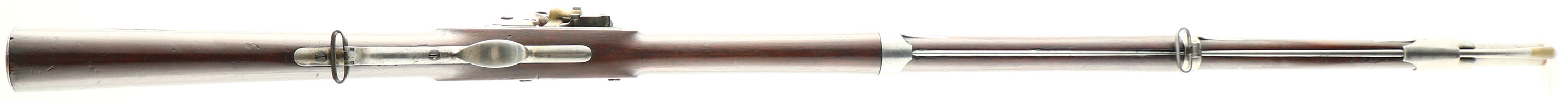 HISTORY: The story of the 1817 Rifle starts with the 1814 common rifle. The 1814 rifle designed by Robert T. Wickham & was produced by Henry Deringer of Philadelphia & R. Johnston of Connecticut. Wickham sent the pattern to Deringer with a contract for 1000 rifles. One of Deringer's rifles was then sent to R. Johnson to be duplicated, with a contract for 1000 more. The military liked these rifles & wanted more. They tweaked a few minor details & made up the 1817 common rifle. Harpers Ferry would produce a couple patterns of the weapon & send them out to multiple private contractors for them to copy & make. One of them was the Nathan Starr & Co. of Middleton Connecticut. They would make 10,200 total rifles from 1817-41. This rifle is from the contract of 1840 for 6000 rifles. These were some of the last flintlock guns made for the military as the US would soon adopt the Model 1841 Mississippi rifle, in 1841, that had a percussion lock & was rifled. Common rifle came from 1840 Ordnance Department records to differentiate between the muzzleloading rifles, & the breech loading Hall rifles. before this it was just called the 1817 rifle. Many of these rifles were converted to percussion, or left with the flintlock & used in the civil war. These were a lot higher value & more favored than many other flintlocks since they were rifled, not smoothbore. 5,000 US M1817 Rifles were in storage at the Benicia Arsenal in San Francisco in 1861, and many of these rifles were issued to the 1st California Volunteer Cavalry, who fought in the far western theater against Confederate forces in New Mexico and Arizona. Even as late as March of 1863, Common Rifles were showing up in Confederate arsenal inventories. This rifle has been bored to .62 Cal & made into a smoothbore, unknown when but it was mostly likely done after the Civil war by a gunsmith to fix a worn out bore.