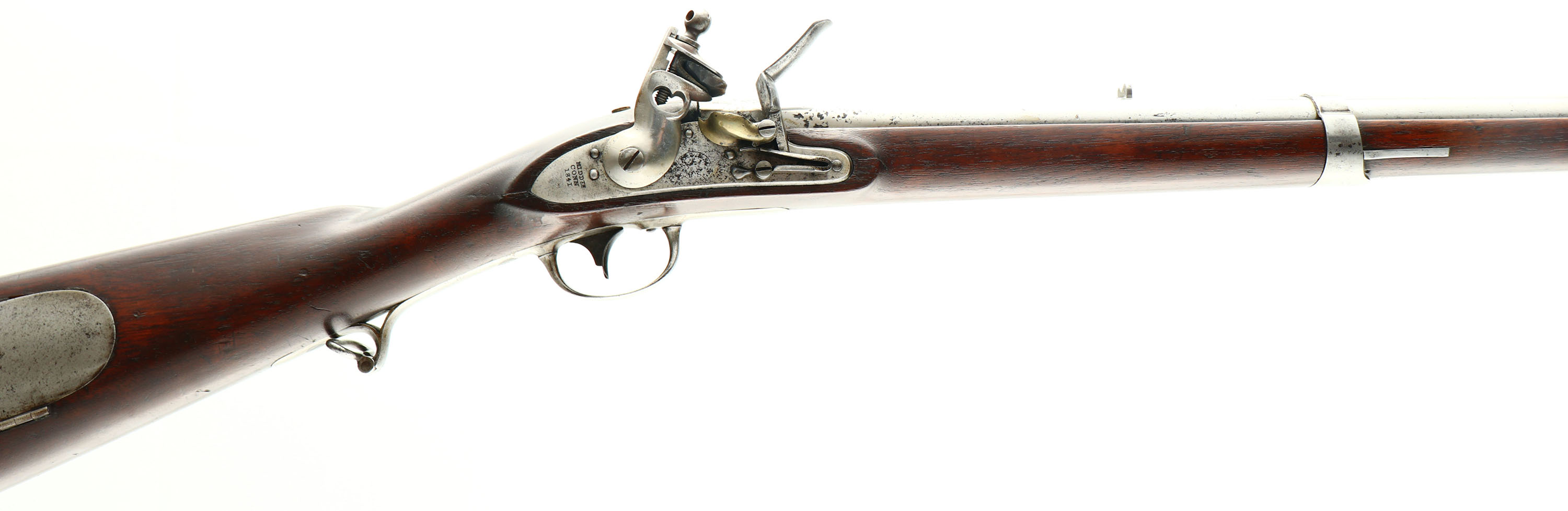 CONDITION: The straight wrist walnut stock is very good with various nicks, dings, & scratches from use/age. The top of the wrist has a old tight repaired crack, runs 2'' down the wrist & double backs to the left flat of the stock. A couple small cracks around the lock plate cut out. Buttplate is proud to the wood at the toe. Two worn inspectors cartouches on the left flat of stock. Metal patch box in the right cheek of the stock. The metal has been cleaned & polished with some roughness/pitting scars on the lock plate, rear & muzzle of the barrel. The rear of the barrel is marked U''S'' over ''JH'' over P'''' in circle. The rear left flat of the barrel stamped ''H''. The ''JH'' is the inspectors initials for John Hawkins, he's listed as inspector for Starr M1817 rifles & waters M1836 pistols from 1841-44. The barrel tang is marked ''1841'' The lock plate is marked ''MIDDtn'', ''CONN'', ''1841'', & ''N.STARR & SON'' in a circle around a eagle, the round marking is partially worn away. Upper tang of the buttplate marked ''US''. Inspectors initials on the frizzen, cock & inside the patch box lid. The bore is fair. Its bright with a few spots of concentrated roughness & one spot of pitting. The barrel holds a worn-down barleycorn front sight with a V-notch rear sight. The stock carries a polished metal buttplate, has light roughness & patina. The rifle has both bottom sling loops & has an early brass tipped ramrod. Antique, No FFL Req - Value: 2000 to 5000