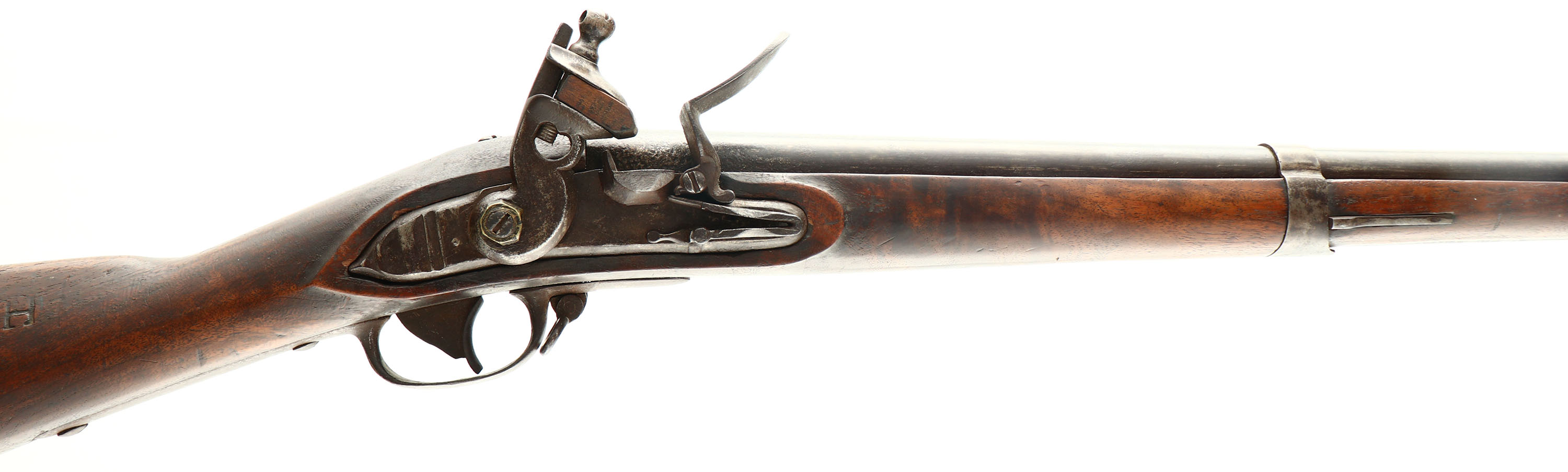 American/Prussian, .69 Cal Musket, MFG: early 1800s, S/N: None, Flintlock musket, 42'' barrel. The straight wrist walnut stock is good. The stock has a crack on the top of the wrist, one on the bottom of the stock between the side plate & trigger guard tang, one at the top of the side plate between it & the barrel, one on the left side of the forend between the middle & front barrel band, by the stock pin. More small cracks /grain pops by the buttplate. stock has various nicks, dings, & dents from use/age. The right cheek of the stock is marked ''M. P. FRENCH'', possible the name of the Militia man who used this musket or could have been added later for some unknow reason. The metal has toned to a mix of gun metal gray & brown patina with areas of roughness & cleaned pitting. The rear of the barrel is marked ''P''. This is in the style/font of the Early American P proofs of this era. The top mounted bayonet lug is marked with a faded ''U''. the side plate is marked with two worn symbols that appear ''da''. The lock has no markings but appears to be a Prussian made lock from the Late 1700s. Hammer has a crew & brass nut holding it on. the bore is poor. Dark with rust, roughness & pitting. Front barrel band mounted brass front sight blade. The stock carries a iron/steel buttplate with rust & patina. The musket has both bottom sling loops & a ramrod. This musket presents as a pieced together gun made for the militia or just for utilitarian purposes back in the very early 1800s. Musket does appear like a early Springfield model besides the Prussian lock. Antique/Muzzleloader, No FFL Req. - Value: 400 to 800