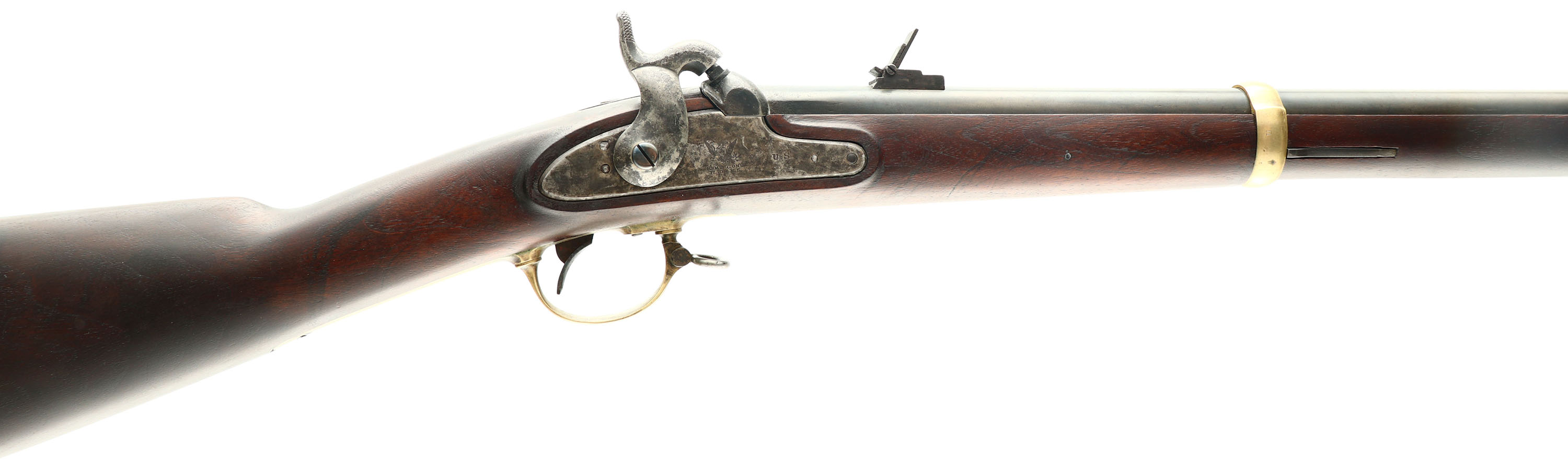 CONDITION: The straight wrist walnut stock is excellent with a couple minor scratches & scuffs around the stock flats. brass patch pox in right cheek, has extra nipple inside. The metal appears to have a old re-finished with some roughness under the finish on the lock & by the percussion nipple. the blued finish rates 85% with areas of thinning & spots starting to tone brown. the rear of the barrel is marked ''1863'', ''US'', over ''V'' over ''P'', eagles head. The rear left flat of the barrel is marked ''STEEL'', ''G.P''. The lock plate is marked ''1863'', a American great eagle over ''REMINGTONS'', ''ILION N.Y.'', ''U.S.''. upper tang of buttplate marked ''US''. both barrel bands marked ''U'', front band marking is faded. The bore is fair. Has roughness & spots of pitting, but is bright with strong rifling. The barrel holds a barleycorn front sight with a flip up three leaf, U-notch rear sight. The stock carries a brass buttplate, has light wear & patina. The rifle has both bottom sling loops & has a ramrod. Antique/Muzzleloader, No FFL Req - Value: 2000 to 4000