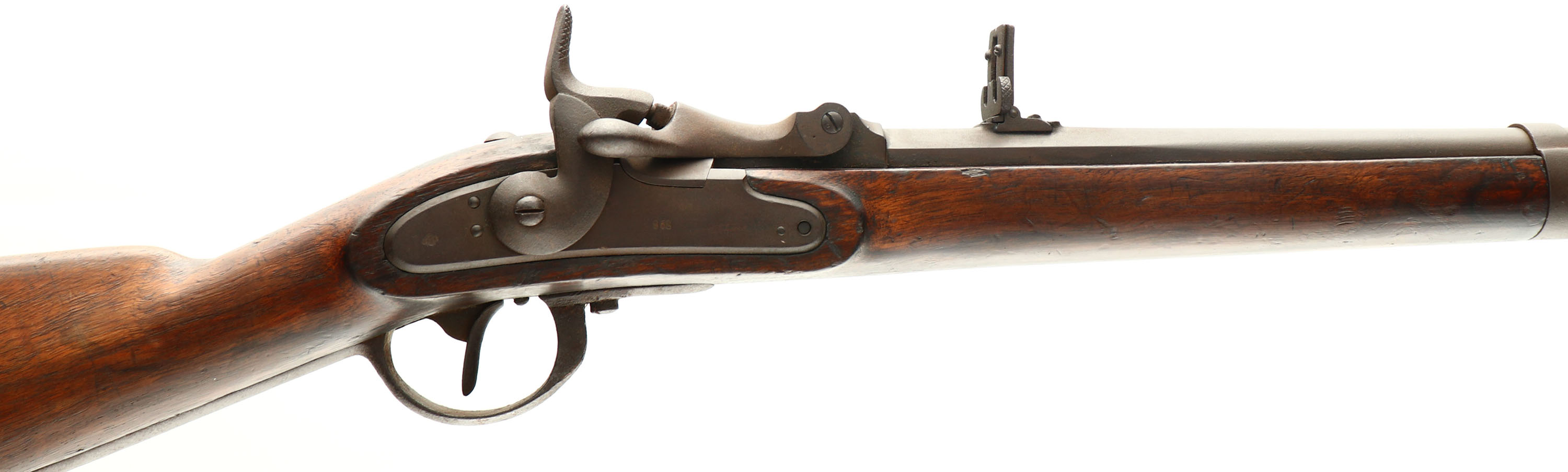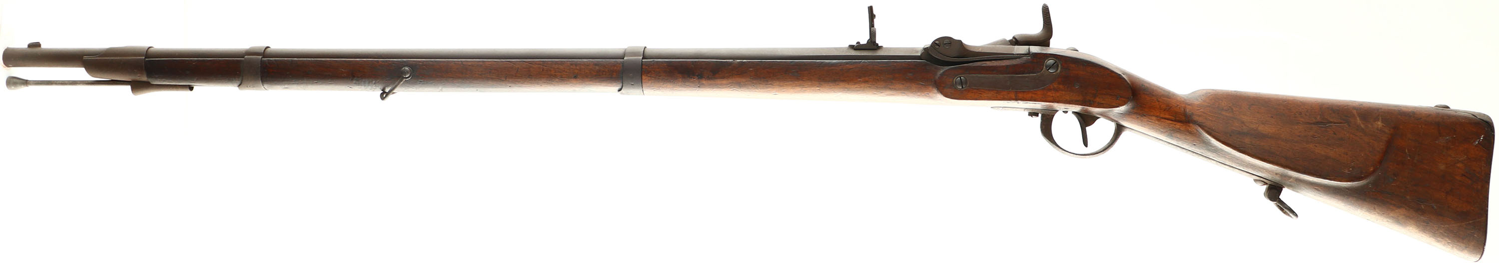 CONDITION: The straight wrist cheeked walnut stock is very good with various nicks, dings, scuffs, & scratches from use/age. The right cheek of the stock is marked ''R.HAMERTON 126'', ''VNC'', ''CHINA'', ''1900''. The metal has completely toned to an even brown patina with light roughness. the trigger guard & sling swivels have rust pitting. The breech tang is stamped ''OHLIGS UND SOHN'' this is in Vienna where it was converted with the Wanzel system. Breech tang also marked with a small ''N'' proof. The top rear flat of the barrel marked ''W'' over ''69'', a worn circle proof, tow more worn proof, & a ''T'' in front of the rear sight. The lock plate is marked with a Austrian proof, & the last three digits of the MFG date, this one is marked ''858''. The rear barrel band is marked ''B'' & with two proofs. The middle barrel band is marked ''26'', & the front barrel band is marked ''44''. The inside of the breech block is marked ''62''. The bore is Poor to fair. Has proud riling but has lots of roughness throughout the bore, no deep pitting though. The barrel holds a small blade front sight with a flip up ladder V-notch rear sight. Rifle has the updated M1862 style sling swivels. Rifle has the old ramrod as the cleaning rod. rifle also comes with a M1854 Lorenze socket bayonet. Antique, No FFL Req - Value: 1500 to 3000