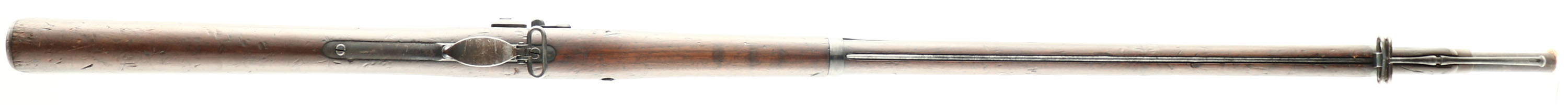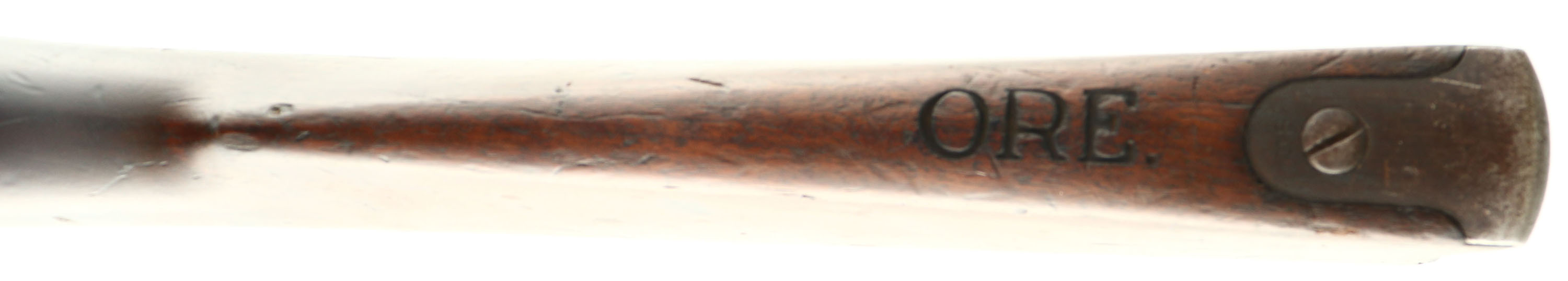 Springfield Armory, Model: 1884 trapdoor Oregon state militia marked, Cal: .45-70, MFG: 1888, S/N: 411021, Single shot trapdoor rifle, 32 1/2'' barrel. The straight wrist walnut stock is very good with various nicks, dings, dents, & scratches. The comb of the stock is marked ''ORE.'' This is the mark of the Oregon state militia. No viable inspectors stamp & acceptance year. Metal has a old arsenal refinish with spots of roughness under the finish. The barrel retains about 20% blue around the stock line & chamber, with most of the metal toned brown or worn gray. Barrel has some ding & tool marks. The receiver has complete toned brown. The breech block retains about 35% of the case-hardened finish. The lock plate retains about 50% blue with spots of wear & brown patina. The top of the breech block is marked ''US'', ''MODEL'', ''1873''. The rear of the receiver is stamped with the S/N. the rear of the barrel is marked V over ''P'' over a eagles head, ''P'', ''R'', ''A''. barrel markings are faded from wear. The lock plate is marked with a American Great eagle stamp, ''U.S.'', ''SPRINGFIELD''. Upper extension of the buttplate marked ''US''. Both barrel bands marked ''U''. Oval knurling on hammer, serrated trigger, & has the ''three-click'' action. The bore is fair. Its bright but with thinned rifling, roughness & spots of light pitting. The barrel holds a small blade front sight with a Buffington, U-notch ladder rear sight. The stock carries a blued steel buttplate, worn gray with patina. The rifle has both bottom sling swivels & the third stacking swivel. The rifle has the cleaning/clearing rod. Antique, No FFL Req. - Value: 1000 to 2500