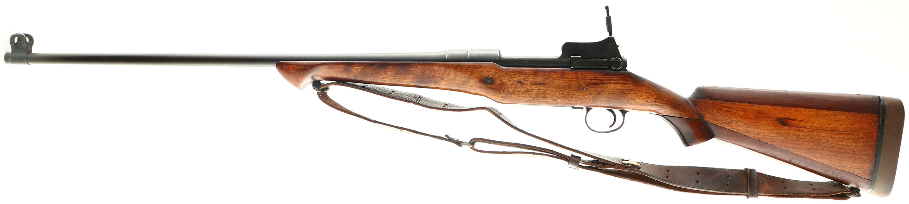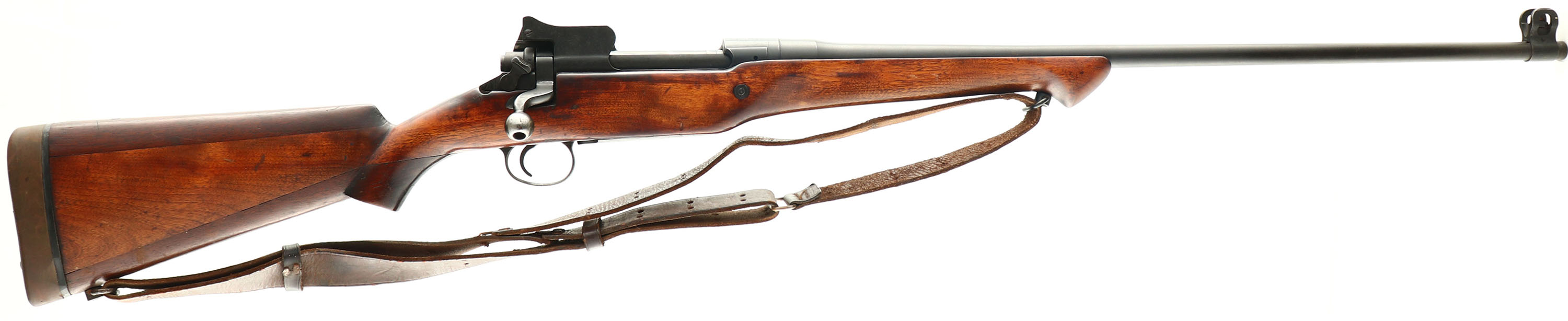 Remington Model: M1917 Enfield, Cal: .30-06, MFG: September 1918, S/N: 423764, Bolt action rifle, 26'' barrel. The aftermarket, semi-pistol grip wood stock is very good with various nicks, dings, dents, & scratches from use/age. The top of the comb & the belly of the stock are separate pieces from the main stock & have been nailed together with the nail holes visible. The metal was refinished when it was refurbished by the military. The metal finish rates 90% overall with spots of light thinning & patina speckling. The top of the receiver is marked ''U.S.'', ''MODEL OF 1917'', ''REMINGTON'', & the S/N. the left receiver flat is marked with the US flaming bomb, & two faded eagle head proofs. The end of the barrel is marked with a faded ''J.A.'' over a flaming bomb. The barrel also has a few other small proof marks. This rifle is a mix of Remington & Eddystone parts, typical of a rebuild rifle. The bolt has been converted to be cock on open, rather than to be cocked on close. The bore is very good. Its bright with light roughness throughout. The rifle has it original sights, a blade front sight with protective ears & a receiver mounted, elevation adjustable aperture rear sight. Rear sight ladder is marked 2 to 16. The stock carried a rubber recoil pad marked ''KICK EEZ''. The stock has both sling swivels & comes with a leather M1907 style sling. This was a Military refurbished M1917 Enfield, Evident by the mix MFG parts & also having A WW2 production Johnson Automatics Replacement barrel. A excellent hunting rifle or a nice project to ''un-Sporterized'', since the barrel has not been cut. FFL or C&R Req. - Value: 150 to 300