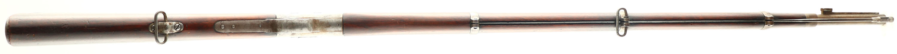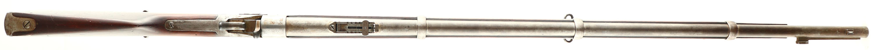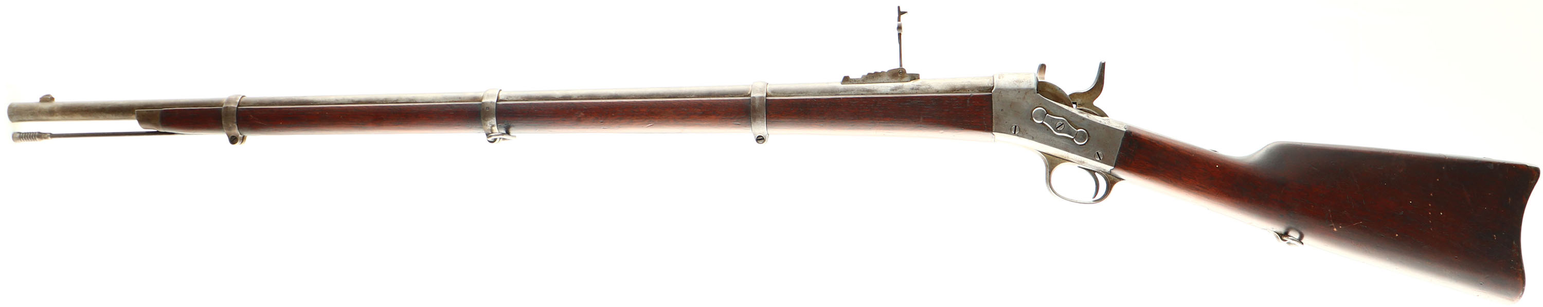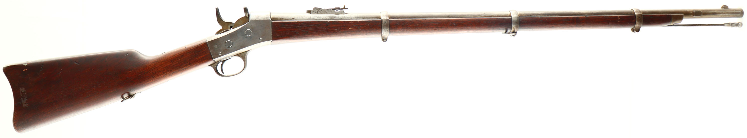 CONDITION: The two-piece straight wrist walnut stock is very good near excellent, but has some small nicks, dings, & scratches. The left side of the wrist is stamped ''H.B.H.'' in a box. The metal has mostly worn to a gun metal gray with the end of the barrel toning brown. metal has speckled patina, light rust, & parts have old caked on grease. The upper tang is marked ''E.REMINGTON & SONS'' their address & patent dates. The left side of the receiver & barrel are stamped ''H''. Bayonet lug stamped ''H'' as well. The three barrel bands are marked ''U''. The bore is very good near excellent. Its bright & shiny with proud rifling but has spots of roughness near the muzzle. The barrel holds a small barleycorn front sight with a stepped base/ladder V-notch rear sight. The base is marked 1 to 4, & the ladder is marked 6 to 9. The stock carries a steel buttplate, bare steel with speckled patina. The rifle has both sling loops & the cleaning/clearing rod. Antique, No FFL Req. - Value: 400 to 800