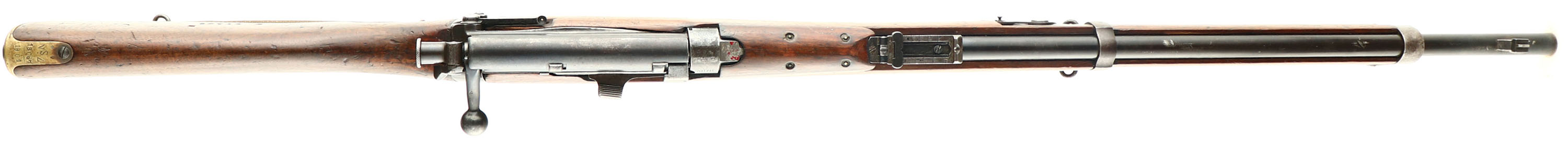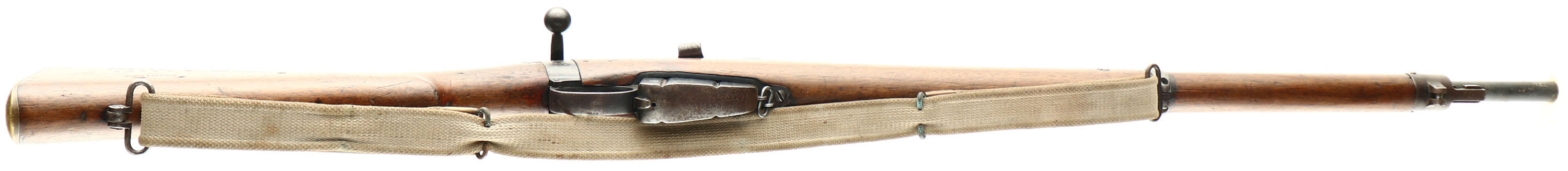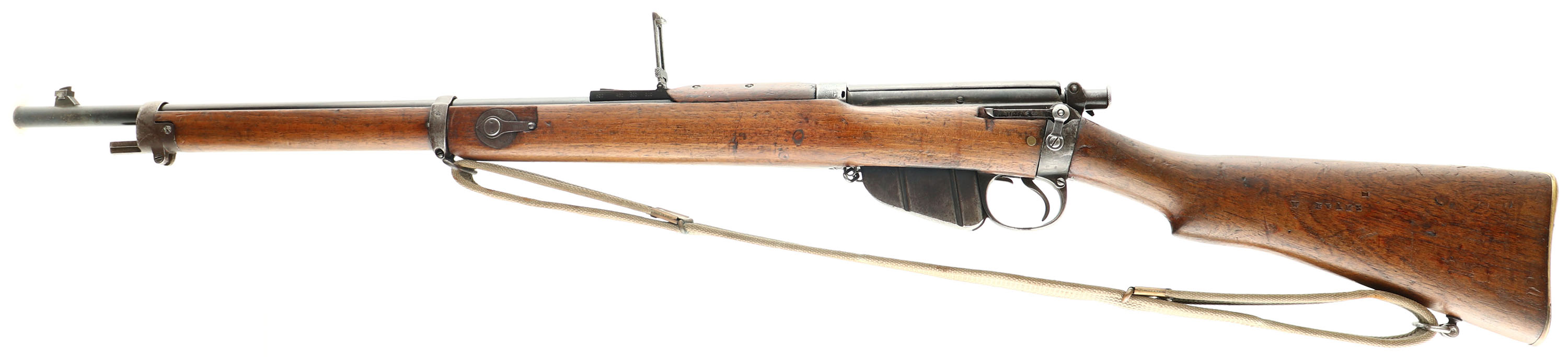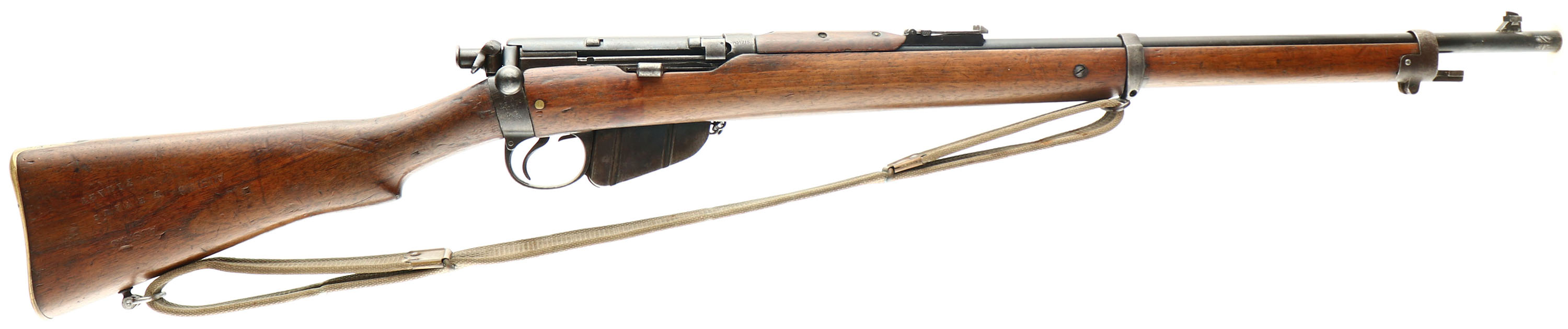 CONDITION: The two piece, semi-pistol grip walnut stock is very good with various nicks, dents, chips, & scratches. the left side of the forend, just in front of the mag has two 1/4'' wood plug repairs. The tip of the forend has a crack. The upper handguard had a 1 7/8'' section on the left front side chip off & was glued back together, repair is tight & looks professional, possible done by a arsenal. the right cheek of the stock is stamped ''W.EVANS''. The right cheek of the stock is stamped ''AUSTINS'', ''AUSTINS'', ''W.EVANS'', ''TIMARU''. Over the ''TIMARU'' stamp is the faint remains of the acceptance cartouche, under that is stamped ''II*'', marking is faded as well. The heel of the stock, just in front of the buttplate, has a faint ''S S'' with two broad arrows stamp which denotes it was sold out of military service. The stock appears to have been sanded & refinished when it was shortened into a club rifle with the Military markings being faded/worn & the other stamps still being intact. The metal has a old re-blue, unknown if its a arsenal or done when it was cut down. Spots of roughness/cleaned pitting under the finish The blued finish on the barrel rates 65% with scratches, spots of thinning & spots toning brown. The receiver has toned to a mix of gun metal gray & brown patina with some blue remaining in protected areas. The receiver dust cover retains a fair amount of its blue but has spots of wear that are toning brown. The left side of the receiver band is marked with a worn proof, stamped over that proof is the worn ''HG'' home guard stamp, just above that is a worn ''SA'' stamp. The top of the band is marked ''4161'', this is likely a rack number from its shooting club or home guard days. The right side of the band is marked with the S/N. The Knox form (the top of the chamber just in front of the receiver) is marked with three overlapping stamps, one is the ''E'' for Enfield rifling, one is the standard British nose-to-nose broad arrows stamp. & the last stamp is the ''S S'' stamp which denotes it was sold out of military service. Remains of red paint on the Knox form as well. The right side of the wrist band is marked with a crown over ''V.R.'', ''B.S.A.Co'', ''1901'', ''L.E.'', ''I*''. the upper tang of the buttplate is marked ''N.S.Z.'' over ''18067/1901'', with a arrow proof & another small British proof. The top of the barrel, just in front of the rear sight is marked ''S''. S/N Mismatched bolt. Rotary safety lever on back of bolt. The bore is very good. Its bright with light roughness. The barrel holds a square post front sight with a tangent/ladder V-notch rear sight marked 200 to 500 on the base & 6 to 18 on the ladder. The long range volley sights are intact on the rifle, front & rear. The stock carries a brass trapdoor buttplate, has some dings & patina. There is nothing inside the trap door. Rifle has both bottom sling swivels & comes with a British white canvas sling, brass hooks with no visible markings. The sling has the number ''302795'' handwritten in black ink. A Interesting rifle that has had a long life of service. FFL or C&R Req - Value: 500 to 1000