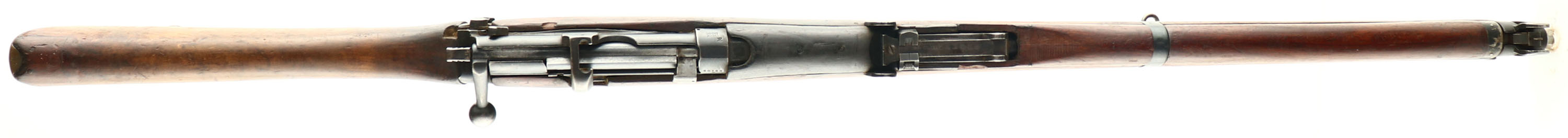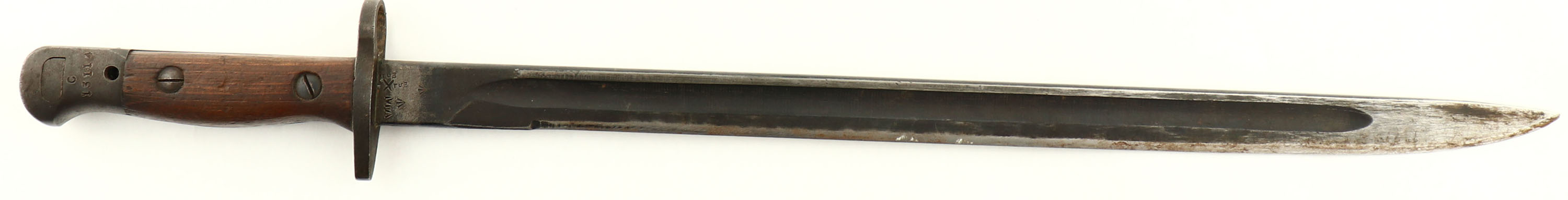ROF Fazackerley, Model: No.1 Mk.3 star SMLE, Cal: .303 British, MFG: Pre 1945, (1907-45), S/N: EC20125 (X serial block), Bolt action rifle, 25 barrel. The two piece, semi-pistol grip walnut stock is very good as being lightly sanded & refinished. Stock has a couple small nicks, dings & scratches from use. Arsenal repaired heel & toe with nail reinforcement. There is a 2 1/4'' tight crack on the left side of the forend, emanating from the wrist band. The right cheek of the stock has two roundel cartouches, one is worn illegible with only the outline visible, the other reads ''TDE'' over an arrow, over ''(W)'', marking is faded but still legible. This is an Indian stores or depot marking from the 1960s. the right cheek has ''410'' marked in white paint. Faint remains of crown proof marks on the bottom of the wrist. S/N marking on the bottom end of the forend, marking is worn but appears to match the rifle. The metal has an arsenal re-finish, done when it went through refurbishment at Fazackerley in 1949. The metal & metal parts have light roughness/cleaned pitting under the finish. The finish rates 90% overall with spots of thinning & brown patina. The right rear of the receiver is marked with import stamps. The receiver band is marked with three proof marks & the S/N. The rear of the receiver is marked with a couple proof. The left side of the wrist band is marked ''NO.1MK.III*'', ''FR49''. More small proof marks on other metal parts. S/N matching bolt. The bore is excellent. Bright & mirrorlike with minor wear. The barrel holds a square post front sight with protective ears, & a tangent U-notch marked 2 to 20. The stock carries a brass trapdoor buttplate that has dings & wear. Nothing inside trapdoor. The rifle both bottom sling loops. Rifle comes with the correct pattern 1907 Bayonet, dated 1942. Ricasso has been scrubbed & remarked, unknown mfg. mismatched S/N stamped into side of pommel. This rifle was produced pre 1945 & the orginal markings were scrubbed off when it was refubished. This rifle was sent to india some time after refubishment as it has a Indian cartouche from the 1960's on it. FFL or C&R Req. - Value: 300 to 600
