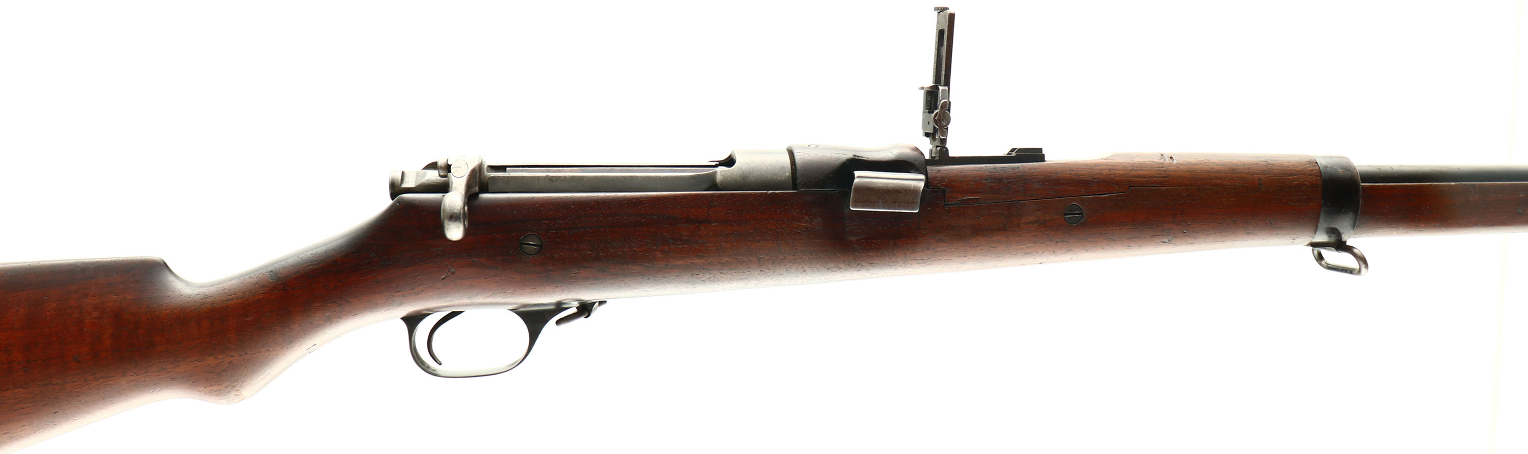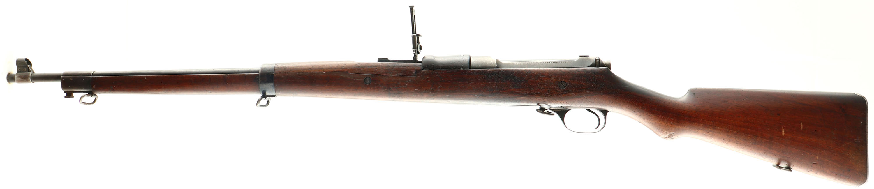 CONDITION: The semi-pistol grip walnut stock is very good with small nicks, dings, & scratches from use/wear. One larger chip in wood on the right cheek. The top of the wrist has darkened from hand oils. The bottom of the wrist is marked with two faded Canadian proofs, US flaming bomb, ''US'' & the S/N. The right cheek of stock is marked with line out regiment & unit markings that read ''A'', ''RCD'', ''131'', (RCD for the Royal Canadian Dragoons). A worn roundel cartouche that's reads ''QUEBEC'' on the bottom & ''D'' arrow ''C'' in the middle; the markings on the top of the roundel are illegible. To the right of the Roundel is the markings ''3*'' over ''II.'', ''362/1907'', ''U''. Further right of those markings are ''9MH/1'', ''2/13''. The S/N & MFG date for Ross rifles was stamped onto the stock & not on the metal. The blued metal finish on the barrel rates 80% with spots of thinning/ toning brown & scattered brown patina. The blued finish on the receiver has mostly worn away exposing gun gray & is starting to tone brown. some blue remains in protected areas. Thinned remains of case-hardened finish on the bolt. The left side of the receiver is marked ''ROSS RIFLE CO QUEBEC.CANADA.1905.'', ''PATENTED''. The rear of the bolt channel is marked with a worn crown proof. The bolt handle marked ''4392'' & with a couple proofs, & the bolt head is marked ''5202''. The bore is very good. Its bright & shiny with light roughness throughout. The barrel holds a hooded, square post front sight with a V-notch/aperture, flip up ladder rear sight. The stock carries a steel trapdoor buttplate. Has worn gray with spots of patina. Nothing inside trapdoor. Rifle has four sling swivels. FFL or C&R Req - Value: 1200 to 2400
