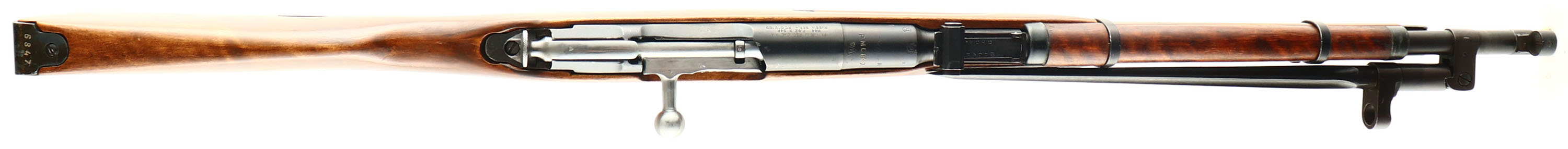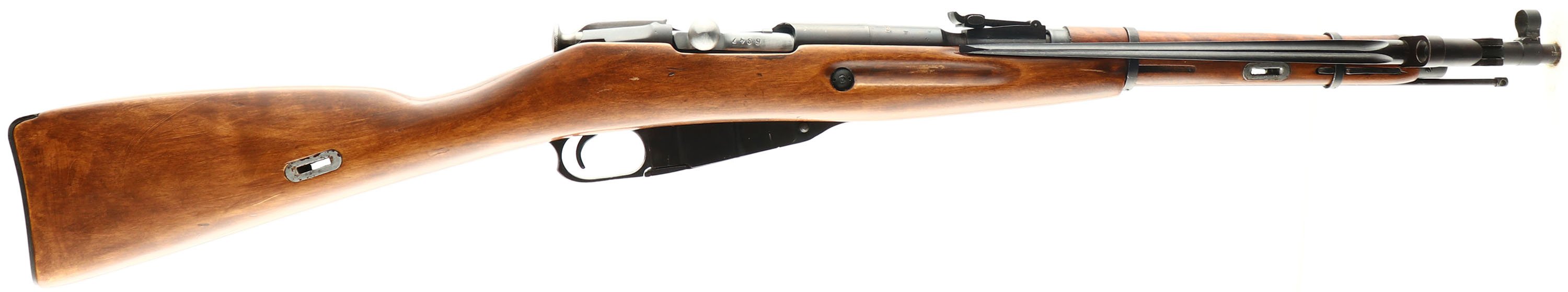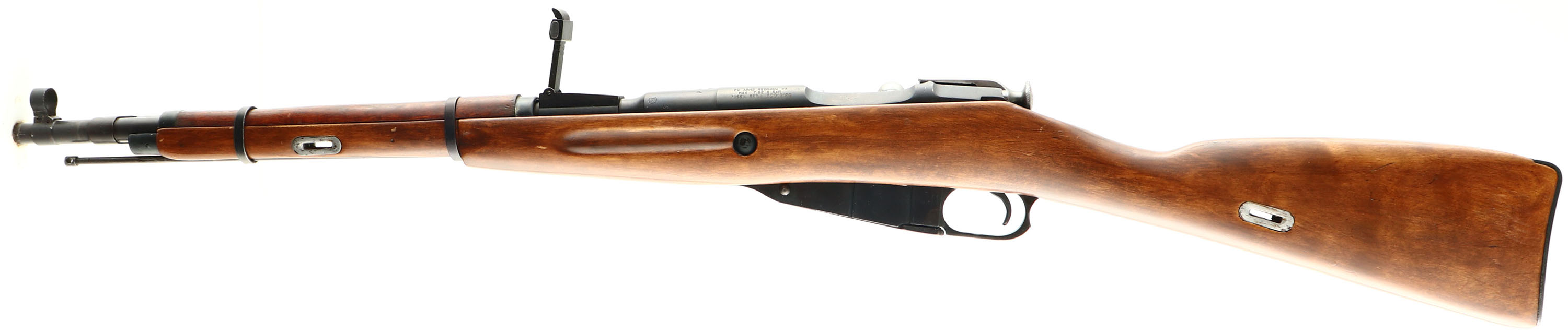 Izhevsk, Model: M44 Mosin carbine, Cal: 7.62x54mmR, MFG: 1945, S/N: RC012189 (Original barrel PM 6847), Bolt action rifle, 20'' barrel. The straight wrist wood stock is excellent as being Sanded & re-finished. Stock has a coupe, small scratches & scuffs. The rear barrel band spring is missing. No visible cartouches on stock. The metal has a arsenal re-finish. The blued metal finish on the barrel rates 97% with a couple scratches at the muzzle, & the metal is starting to tone plum. The receiver finish rates 94% with a few scratches, & the metal is toning plum. The magazine, bayonet & other small metal parts are starting to tone plum as well. The left side of the receiver is stamped with import markings. The top rear of the barrel is marked with a hammer & sickle in wheat wreath stamp, ''1945r', the original Russian S/N, arrow in triangle, & many other proof marks. The gun was refurbished after WW2 & many of the markings are faded from the re-finish job. More small proofs on other metal parts. S/N matching bolt, magazine floorplate & buttplate. The floorplate is forced matched with the old S/N crossed out. The S/N marked area on the bolt has buff marks & is likely forced matched as well. The back of the bolt cocking piece is scratched ''847''. The bore is very good. Bright with light roughness. Has been counter-bored. The barrel holds a post front sight with protective globe. The rear sight is a tangent U-notch marked 1 to 10. The stock carries a blued buttplate. Buttplate has light finish wear on the edges. Remains of the post WW2 refurb stock shellac on the upper tang of buttplate. The stock has both sling wells for use with leather ''dog collars''. Affixed folding cruciform bayonet. The rifle has a cleaning rod. FFL or C&R Req. - Value: 250 to 500