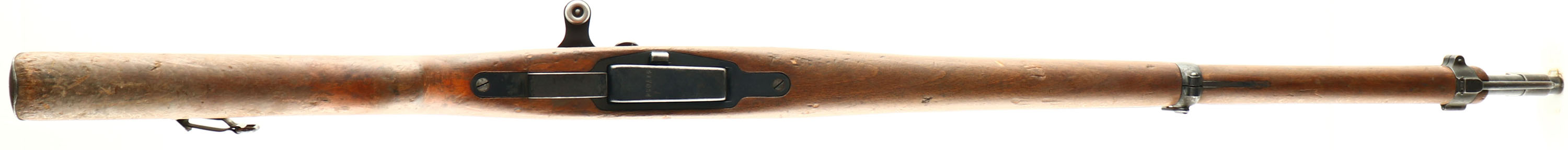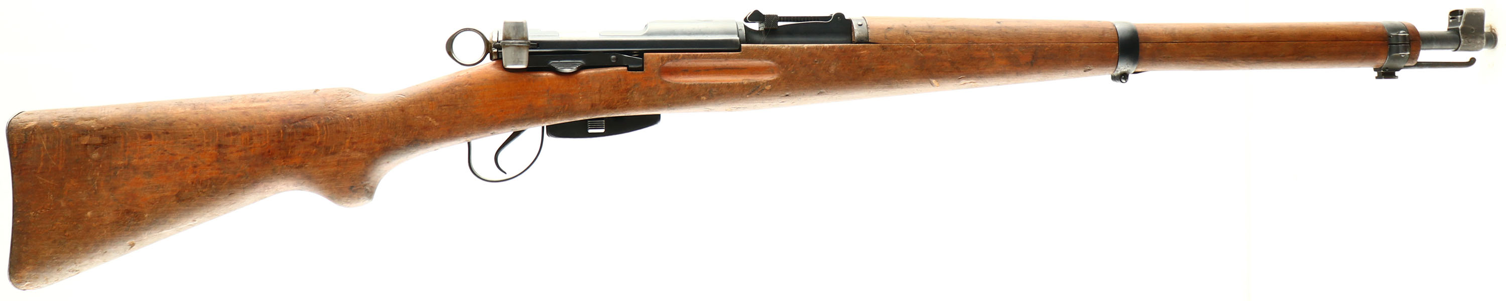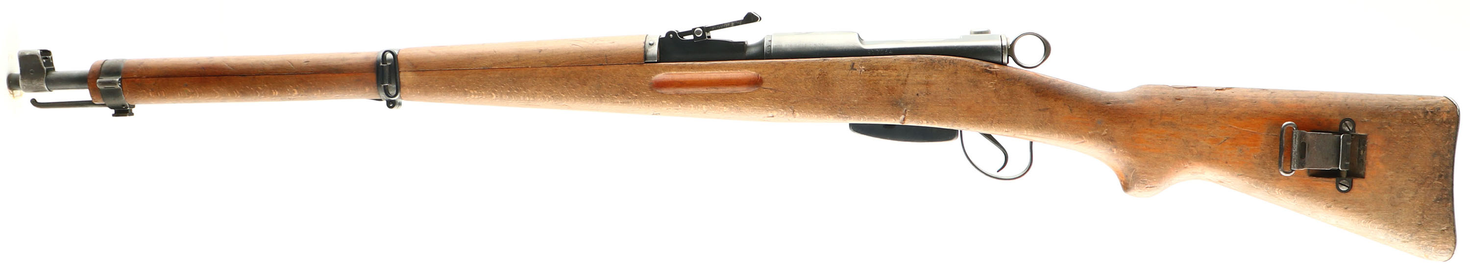 Waffenfabrik Bern (Swiss), Model: Kar.31 (K31), Cal: 7.5x55mm Swiss, MFG: 1948, S/N: 917054, Bolt action straight pull rifle, 26'' barrel. The semi-pistol grip beech wood stock is very good with nicks, dents, chips, scratches, & stains from use/age. There is a crack on the tip of the forend, between the stacking rod & barrel. Stock has no visible cartouches. Under the buttplate the stock is marked ''VII 48''. The blued metal finish retains almost full coverage with a few scratches/scuffs & spots of thinning. Overall finish rates 85%. The left side of the receiver is marked with the S/N. The left side of the receiver band is stamped with import marks. The top of the receiver band has the Swiss crest. The top of the barrel, right where it meets the receiver is marked with the last 3 digits of the S/N, backwards ''B'' spliced with ''P'' proof, & two more Swiss proofs. S/N matching bolt, barrel, & magazine. The bore is excellent. Bright & mirrorlike with little to no visible wear. The barrel holds a squared blade front sight with protective wings, with a tangent U-notch rear sight marked 1 to 15. The stock carried a steel buttplate, left in the white & has speckled patina. No id tag under the buttplate. The rifle has bolt left side sling mounts. Comes with sling clasp on rear sling bar. The Swiss K31 is the last iteration of the Schmidt-Rubin series of rifles & was the last bolt action the Swiss military adopted. Replaced in 1958 by the SIG Stgw.57, it was used by certain units up till the 1970s making it one of the last Bolt actions that was still used by a military. Praised for their accuracy & smooth actions this rifle here would make a fine shooter to add to any collection. FFL or C&R Req. - Value: 350 to 700