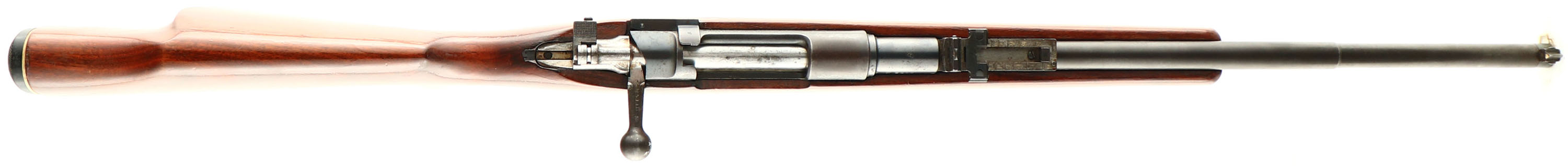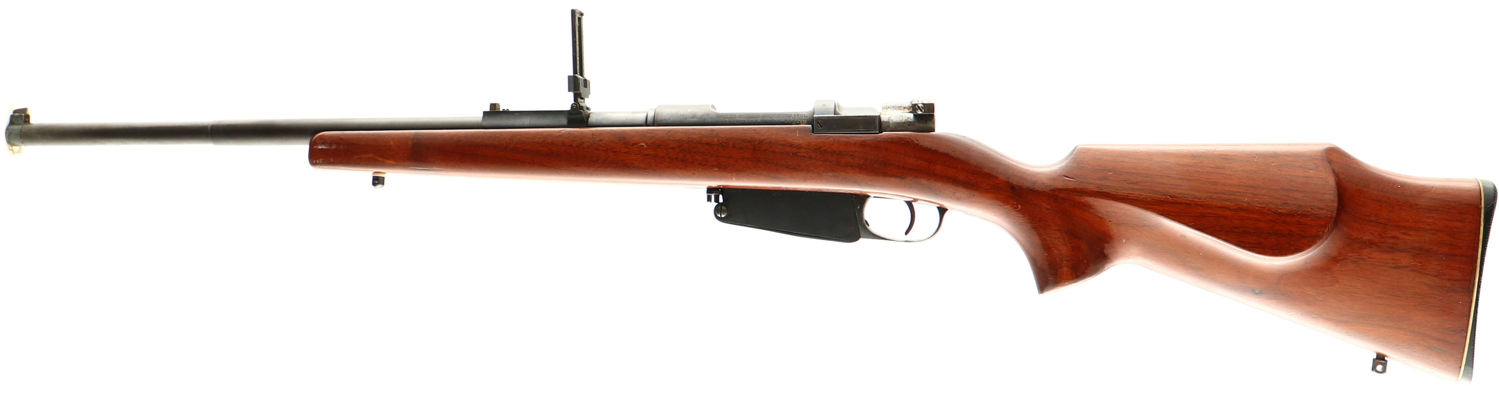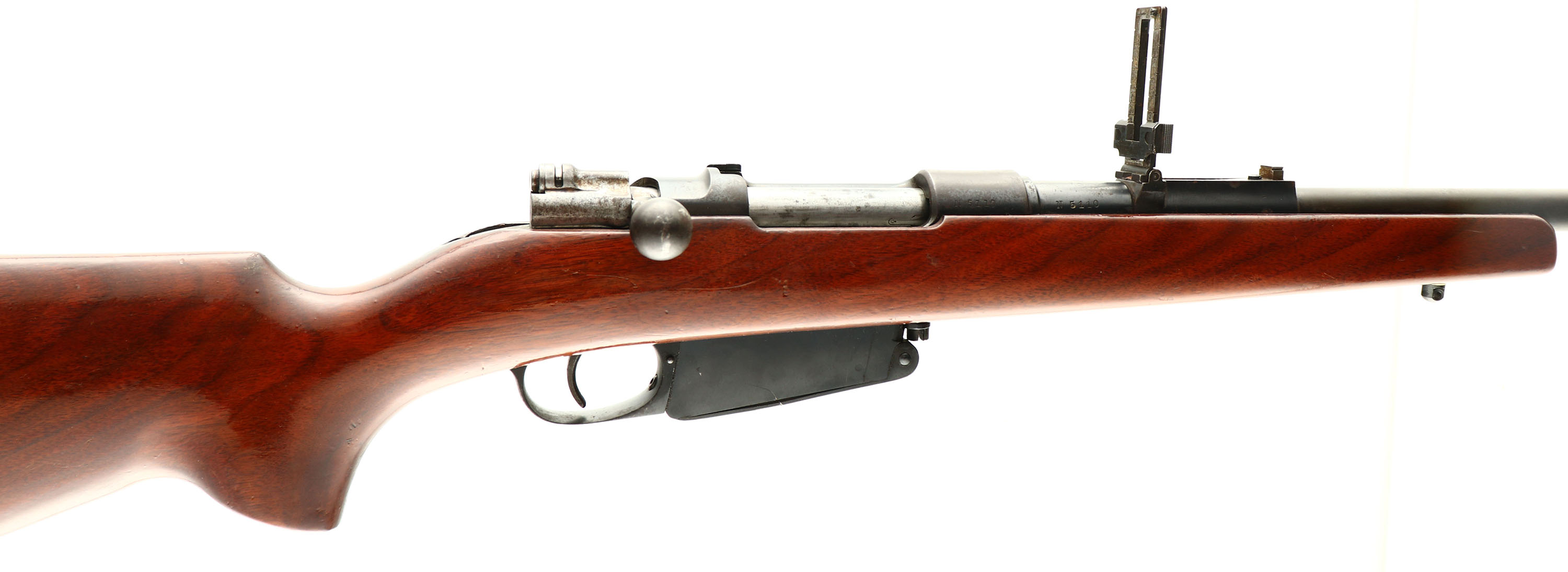 Ludwig Loewe & Co., Model: 1891 Argentino Mauser, Cal: 7.65x53mm Mauser, MFG: 1896, S/N: N 5110, Bolt action rifle, 19 7/8'' barrel. The aftermarket pistol griped, cheeked Montecarlo stock is very good near excellent, with a few minor scuffs & scratches. The blued metal finish on the barrel rates 75% with about full coverage but is starting to thin & tone to a brown patina. some deep bluing remains on the stock line & around the chamber. The blued metal finish on the receiver rates 70% with scattered spots of patina & the top of the receiver ring where the crest was buffed off is completely toned brown. S/N matching bolt, barrel, & magazine. The bore is very good. Its bright with strong rifling but roughness. The barrel holds a barleycorn front sight with white paint, & a flip up ladder V-notch rear sight marked 4 to 20. The stock carries a plastic buttplate. Rifle has both sling studs. Last year of Ludwig Loewe Co. production before they merged into DWM later in 1896. Antique, No FFL Req. - Value: 200 to 400