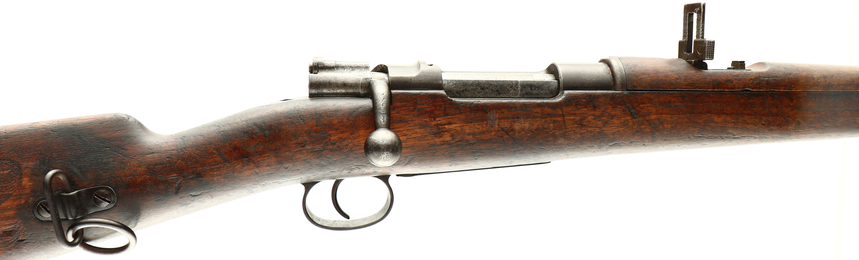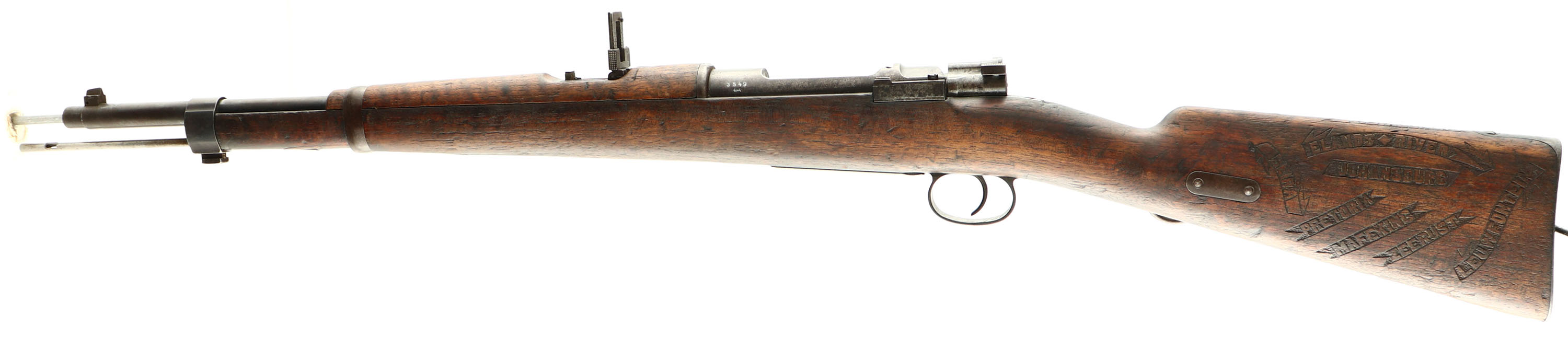 CONDITION: The straight wrist walnut stock is very good with various nicks, dings, scuffs, & scratches. The bottom of the stock, by the front barrel band retention spring, has a few small crack/chip repairs. The left cheek & the top of the comb of the stock is hand carved battle locations the owner of the rifle fought in (locations listed above). The right cheek of the stock was also hand carved but has been mostly worn/scraped away with remains around the edges. The blued metal finish has mostly toned to a brown patina with some spots worn gray. Original blue remains around the stock line & under the wood is beautifully preserved original blue. The Metal finish on the barrel rates 60%, & 5% on the receiver. The left side of the receiver is marked with the S/N, a small German proof, ''MOD. MAUSER 1896.'', ''LUDW. LOEWE & CO. BERLIN''. The rear of the barrel is marked with the S/N & another German proof. All visible parts have matching S/Ns. The bore is fair. Its bright but has consistent roughness/pitting with worn, but still visible rifling. The barrel holds a barleycorn front sight with a flip-up ladder, V-notch rear sight marked 4 to 14. The adjustable sight moves without pushing the button. Sight block is still held tight with friction. The stock carries a blued steel buttplate. Buttplate is toning to a brown patina & has roughness/light pitting in spots. The rifle has both right side sling mounts, & the rear loop has a saddle ring on it. Rifle has a cleaning rod. a very interesting & unique Mauser that shows a more personal, artistic side of the soldier that carried it. Antique, No FFL Req - Value: 1000 to 3000