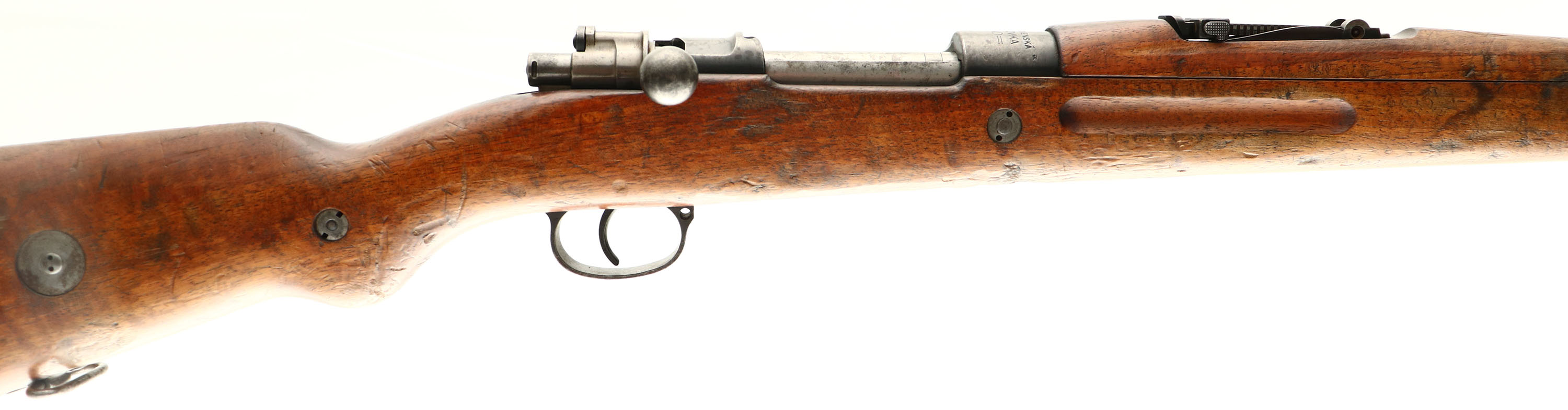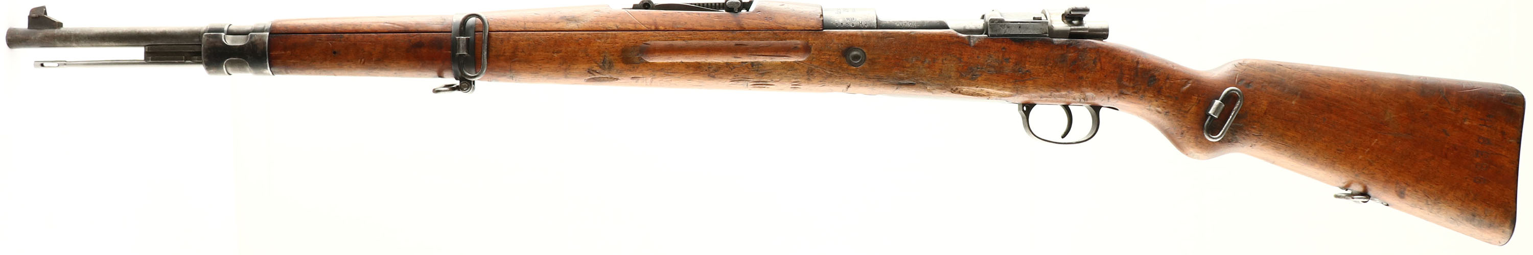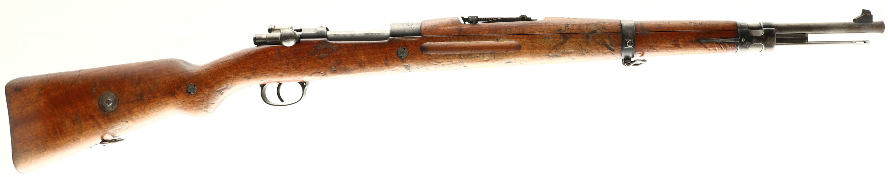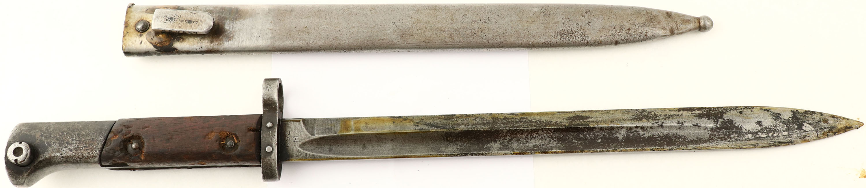 Zbrojovka Brno (Czech), Model: VZ-24, Cal: 7.92x57mm (8mm Mauser), MFG: 1929, S/N: 6839H2, Bolt action rifle, 23 1/2'' barrel. The semi-pistol grip wood stock is very good with nicks, dings, dents, small chips, & wear from use/age. The S/N is stamped into the left cheek of stock. The bottom of the wrist is stamped with three small markings that read ''P'', ''D'', ''3''. Unmarked unit disc embedded into right cheek of stock. The blued metal finish has mostly worn to a gun metal gray with thinned remains of the original finish in protected areas. The overall finish rates 20%. The left side of the receiver is marked ''VZ.24''. the left side of the receiver band is marked with the S/N, a proof ''E'' lion ''29''. The top of the receiver band is marked ''CESKOSLOVENSKA'', ''ZBROJOVKA'', ''BRNO''. All parts S/N matching. The bore is very good. its bright with light roughness throughout & one more concentrated spot of light roughness about 3'' from the muzzle. the barrel holds a barleycorn front sight with a checkered base. Rear sight is a tangent V-notch thats marked 3 to 20. The stock carries a steel buttplate that was left in the white & is starting to tone to a brown patina. The rifle has a cleaning rod. has both bottom & side sling loops. Rifle comes with correct bayonet & sheath. A nice all numbers matching Czech made Mauser thats seen plenty of love. FFL or C&R Req. - Value: 400 to 800
