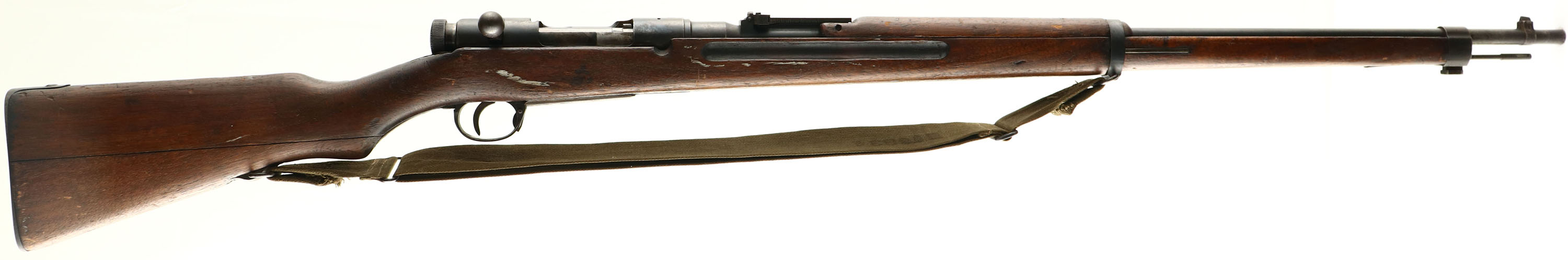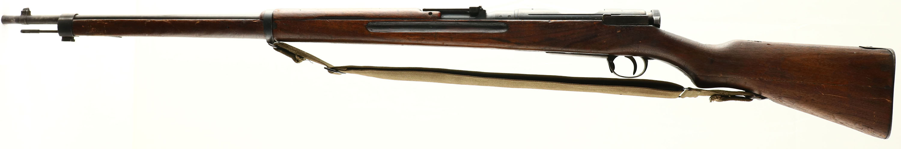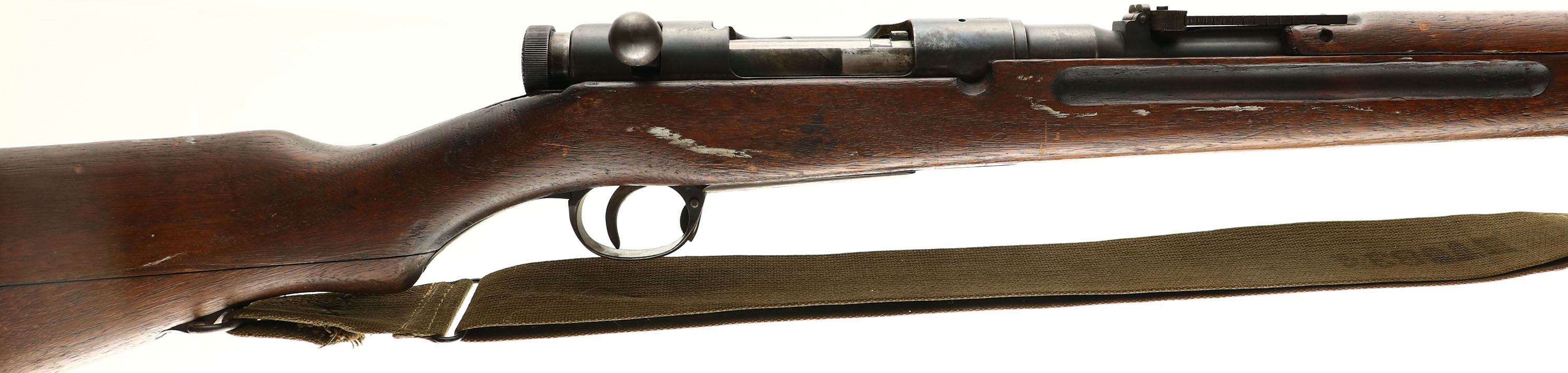 Tokyo Artillery Arsenal, Model: Type 38, Cal: 6.5x50mmSR, MFG: 1906-23, S/N: 986144, Bolt action rifle, 31 1/4'' barrel. The semi-pistol grip Japanese Walnut stock is good. Has various nicks, dings, gouges, vice marks, & scratches from use/age. Japanese style two-piece buttstock. Right side of stock has spots of white paint. Glue has been added to the left side of the joint between the two-piece buttstock. The upper handguard has a couple small cracks & grain pops. The blued metal finish on the receiver rates 75% with spots of thinning & brown patina. The blued metal finish on the barrel rates 80% with wear/thinning at the muzzle & spots of brown patina. Left side of the receiver is marked with the S/N, Tokyo Arsenal logo, & two small inspector stamps. The top of the receiver band is marked with a fully intact chrysanthemum, & ''TYPE 38'' in Japanese. The rear receiver bridge is marked with a small triangle in circle stamp & a small circle stamp. The left side of the barrel is marked with a small triangle in circle stamp, & ''S''. S/N mismatched bolt & marked parts. The bore is very good. Has strong rifling with roughness. The barrel holds a barleycorn front sight with a flip up ladder, V-notch rear sight marked 5 to 24. The stock carries a blued steel buttplate with worn finish around the edges. Rifle has a cleaning rod & both bottom sling loops. Rifle comes US Vietnam era green canvas carry strap that was converted into a sling. a nice example of a non ground Mum Arisaka. FFL or C&R Req. - Value: 250 to 500