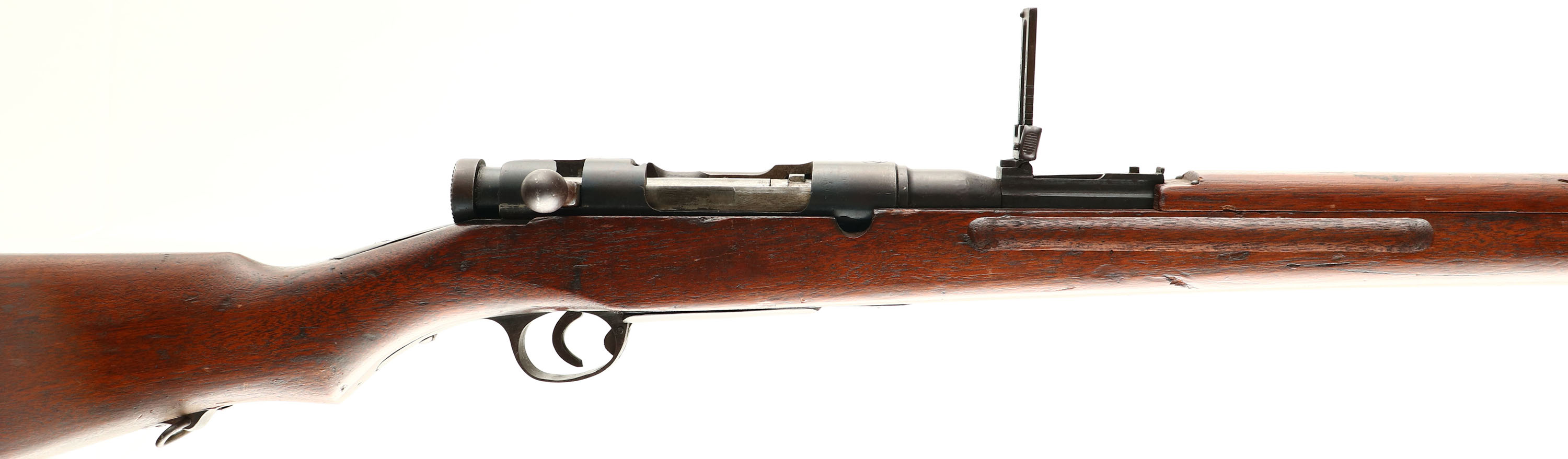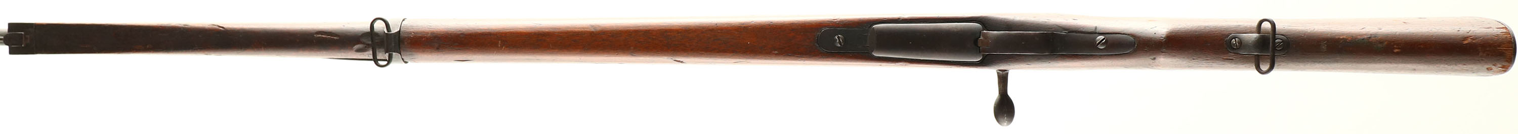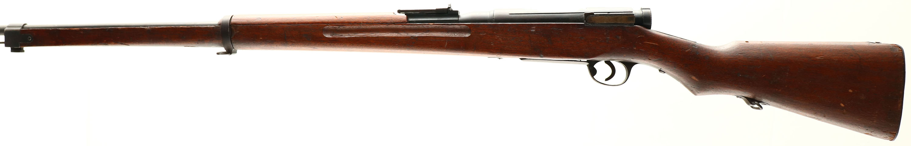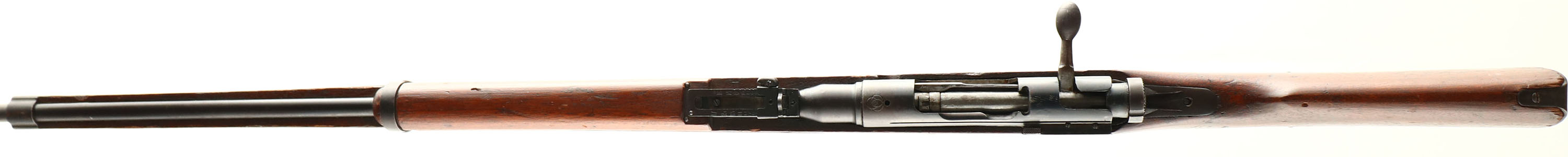 CONDITION: the semi-pistol grip wood stock is very good with various nicks, dings, dents, scratches from use/age. The blue metal finish rates 80% on the receiver with areas of thinning & spots toning to a brown patina. The metal finish rates 93% on the barrel is a few light scratches. The top of the receiver is marked with the Nippon Special Steel Company logo, three intertwined circles with a ''#'' symbol in the middle. The number ''7233'' is stamped on the barrel under the stock. The bore is, the barrel holds barley corn front sight with a flip up ladder aperture rear sight marked 3 to 17. The stock carries a blued steel buttplate with spots of wear & patina. Tape on buttplate. The rifle has a cleaning rod & both bottom sling swivels. A Excellent example of a Japanese School trainer rifle. WARNING, THESE RIFLES WERE DESIGNED & PROOFED TO FIRE BLANKS & SPECIAL LOW PRESSURE GALLERY AMMO, DO NOT FIRE STANDARD BALL AMMO OUT OF THIS RIFLE. FFL or C&R Req - Value: 100 to 400