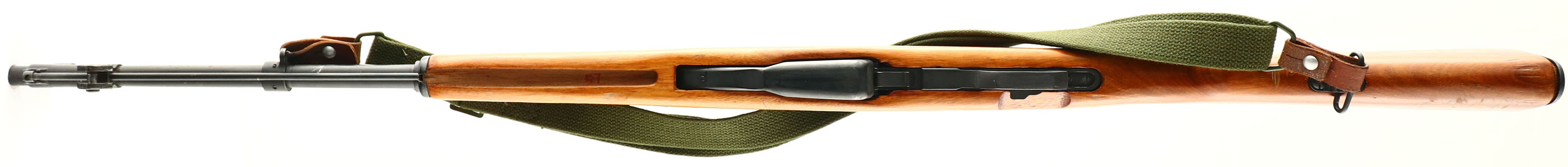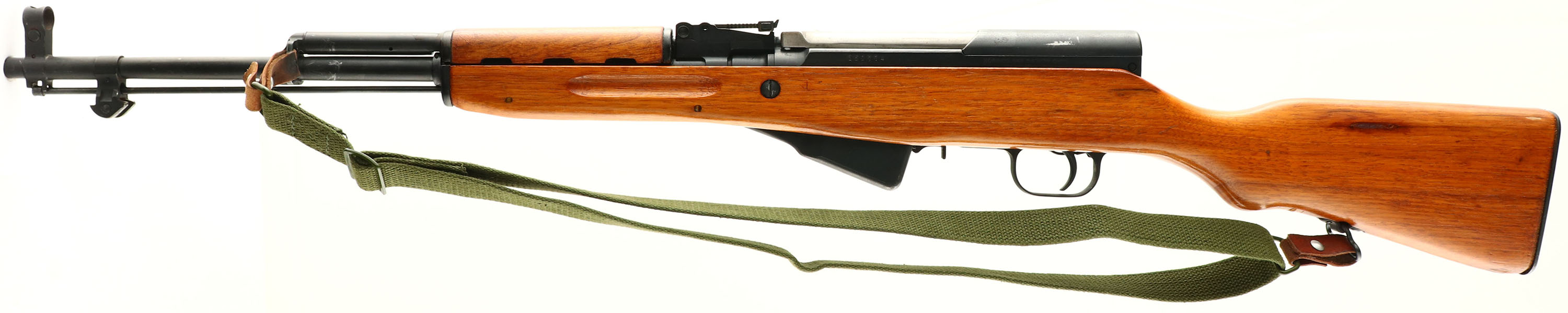 Norinco (China), Model: Type 56 SKS, Cal: 7.62x39mm, MFG: 1990s, S/N: 150774, Semi-auto rifle, 20 '' barrel. The semi-pistol grip wood stock is excellent with some minor scuffs, nicks, & scratches. The rear of the gas tube has over applied stock varnish on it. there is a ''Kill'' notch in the bottom of the stock just in front of the rear sling loop. The metal has been re-blued & rates 90 % overall with scratches, spots of thinning & spots of light patina. The left side of the receiver is marked with the S/N, & import markings. The front of the receiver & the rear of the barrel are marked with proofs. The Bolt carrier, receiver cover, magazine & trigger guard, all have had the S/N ground/buffed off. The remains of the Bolt carrier & receiver cover S/Ns show they are mismatched. The bore is excellent, bright & mirrorlike with little to no visible wear. Chrome lined bore. The barrel holds a post front sight with a round protective hood, with a tangent U-notch rear sight marked 1 to 10 with a battle zero marked ''n''. The stock carries a steel trapdoor buttplate with a complete original cleaning kit inside. They bayonet has been removed but still has the bayonet lug & screw. Rifle has cleaning rod. Comes with surplus Chinese SKS, green canvas sling. A Beautiful example of a type 56 SKS. FFL Req. - Value: 400 to 800