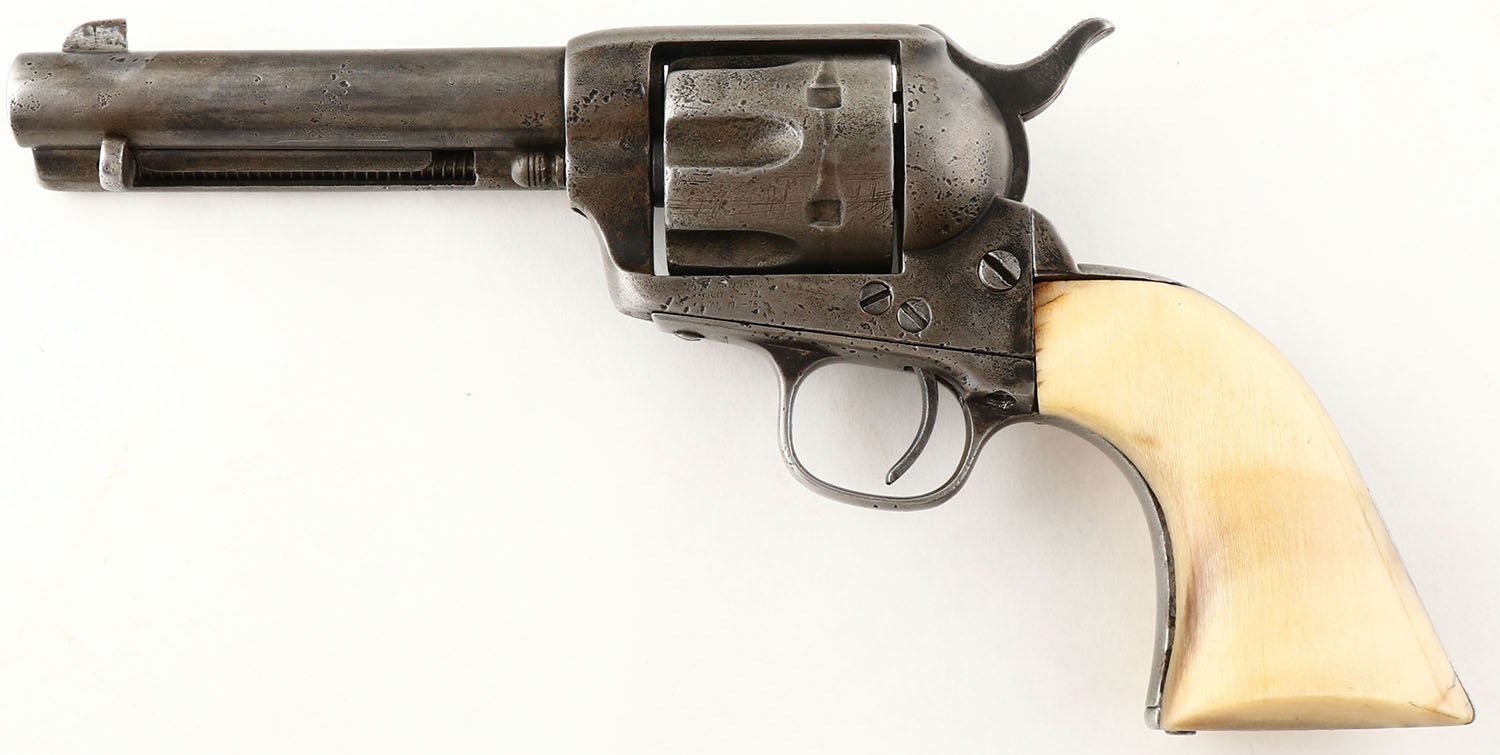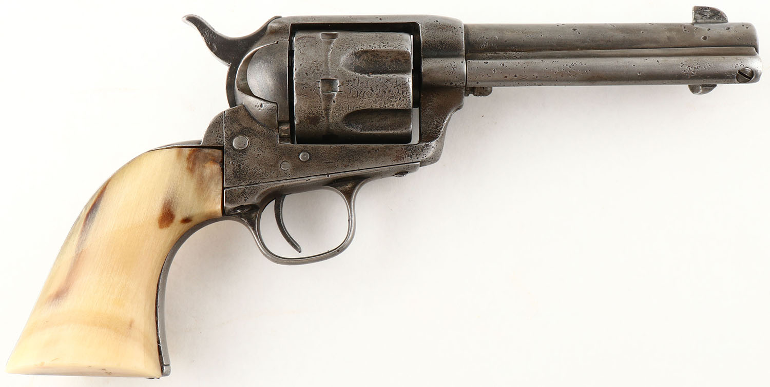 UNIQUE SET, Colt 1873 Single Action Army, CAL: 44, MFG: 1883, SN: 88482?, Single Action Revolver, 4 3/4'' barrel. The top barrel address has worn smooth & is not visible. The left side of the barrel is faintly marked ''44 COLT''. The left side of the frame is marked with the standard three line patent dates. The Rampant Colt logo is not visible. The left side of the trigger guard is faintly marked ''44 CAL''. Partially legible, all matching SN on the frame, trigger guard & butt. The cylinder is marked ''4706''. The polished bone grips are exellent. There are a few minor cracks around the edges. The original metal finishes have fully worn to gun metal gray. There are remnants of applied finish, thin brown patina & intermittent pitting throughout. Bore is poor, dark & rough, with consistent pitting. V-notch integral rear sight & blade front sight. This revolver is accompanied by a early 1900's Connolly Bro's tooled ammo belt & matching double looped holster. Connolly opened it's first shop in Klamath Falls, OR in the late 1800's, closed the doors in 1900, then re-opened a couple shops in Butte & Billings, MT before permanently closing the doors in 1927. This set is from the Billings location. The belt carries a black Jack Sap, a pair of unmarked handcuffs (with functional key) & an unmarked knife sheath that holds an unmarked blade with bone handle. The belt is decorated with a badge marked ''WABASH RY.CO 831 POLICE''. Another neat custom Old West set. Antique, No FFL Req. - Value: 2000 to 4000