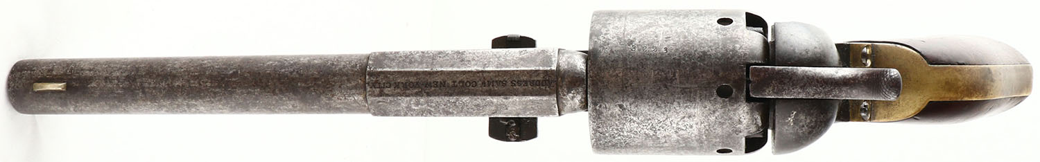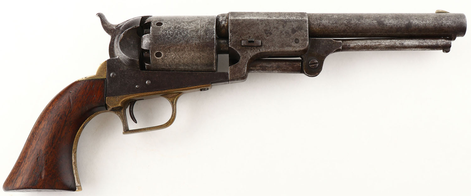 RARE & FANTASTIC, Colt, Model Dragoon 1st Model, CAL: .44, MFG: 1848-50 SN: 3223, Single Action Percussion Revolver, 7 1/2'' barrel. The Colt Dragoon 1st Model, a .44 caliber percussion revolver, was a popular firearm during the 1850s & 1860s, particularly among U.S. Dragoons & civilian pioneers. It was known for its robust construction & reliability in the harsh conditions of the frontier. The 1st Model featured a shortened barrel & cylinder compared to earlier models, making it more manageable & easier to carry. Key features of the Colt Dragoon 1st Model: Caliber: .44, Barrel Length: 7 1/2 inches, Cylinder: 6-shot, Trigger Guard, Square back, brass, Frame: Color case-hardened steel, Grip: One-piece walnut, Loading Lever Catch: A simple spring catch under the barrel to prevent the lever from falling during firing. The 1st Model Dragoon was issued to the U.S. Mounted Rifles (USMR), also known as the Dragoons, in the antebellum era & during the Civil War. Until some Colt M-1851 Navy revolvers were ordered in 1855, the Dragoon remained the only revolver in significant numbers to be in use with the US military. There are portraits of Confederate & Union cavalrymen with various Dragoon models. The Dragoon was a favorite among Texas Rangers & 49ers during the California Gold Rush. The Dragoon's rugged design & reliability made it well-suited for frontier use. Colts Dragoons experienced some of the harshest conditions the mid-19th century had to offer, & it is amazing that any survived, in any condition. This pistol was designed for use by horse-mounted rifleman, & it is so much pistol that you will want a horse to carry it for you because of its significant weight. Colt only produced about 7,000 of these 1st models from 1848-50, with this pistol being produced the first year (1848) & just one year after the Walkers. The wood grips are very good, displaying numerous minor contusions, rubs & nicks, all of which have smoothed with age & use. The case-hardened metal finish has worn to a mix of gun metal gray & brown patina. The brass trigger guard/grip display fantastic age & patina. The cylinder displays the faint remains of Texas Ranger & Indian fight scene. Stamped ''ADDRESS SAML COLT NEW YORK CITY'' along the top of the barrel. Left side of frame stamped ''COLT PATENT U.S.''. Matching SN visible on the barrel, frame, trigger guard, & back strap. Bore is very good. The barrel features a German silver blade front sight & hammer notch rear sight. Cylinder slips on advancement as it has a missing or broken hand-spring. A rarely seen Dragoon survivor & one with strong authentic eye appeal. Own the original! This is a legitimate antique & not a reproduction. Antique, No FFL Req. - Value: 6000 to 10000
