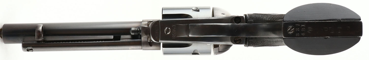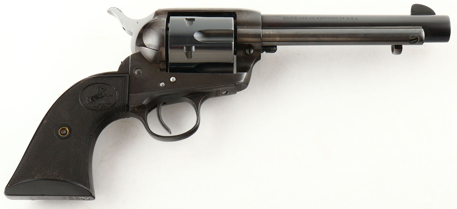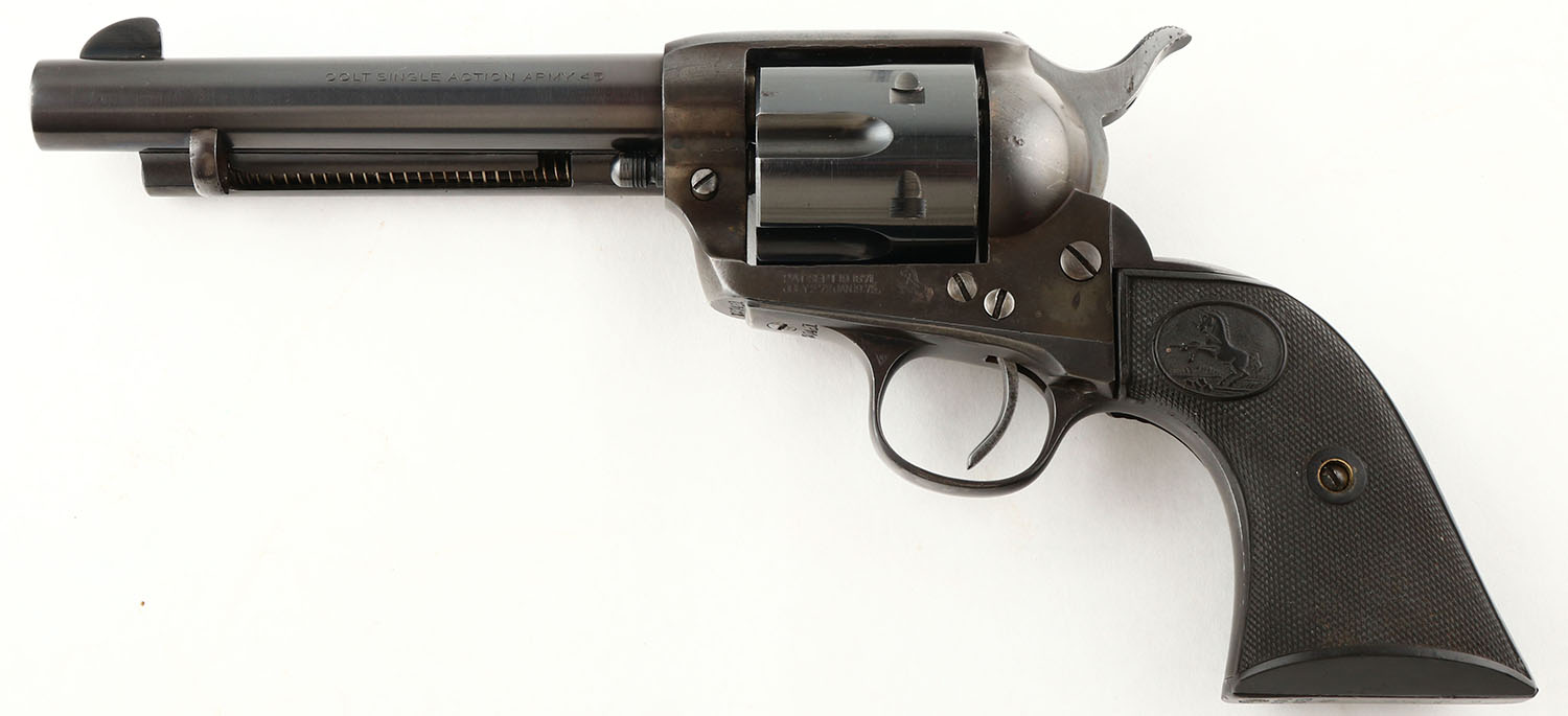DESCRIPTION UPDATE 5/19/25: Colt, 1873 Single Action Army, CAL: 45, MFG: 1913, SN: 327481, Single Action Revolver, 5 3/8'' barrel. The checkered hard rubber grips with Rampant Colt logo are very good. There is light overall wear. The original metal blue finish on the barrel rates 90%, the cylinder rates 90% & the trigger guard has toned to a brown patina. The case-hardened frame has fully toned to a brown patina, with some outlines of shadowing remaining from the case-colors. Bore is excellent, with some light scarring. V-notch rear sight & dorsal fin blade front sight. The butt of the gun has a double stamped ''P'' & ''PETE'' stamped into the butt. Update: The cylinder appears to be a replacement. It has a good amount of play when the hammer is both down & fully cocked. This firearm needs to inspected by a licensed gunsmith before use. SOLD AS IS NO RETURNS. Price was adjusted & bidding restarted on 5/19/25. FFL or C&R Req. - Value: 1500 to 2500