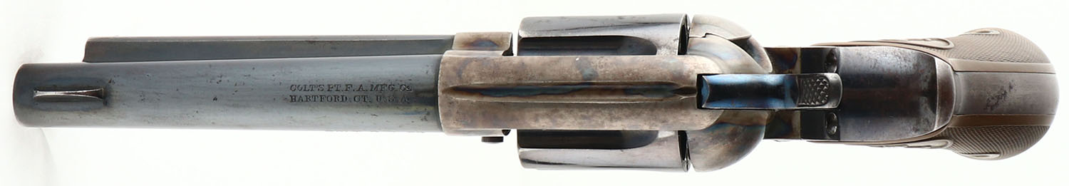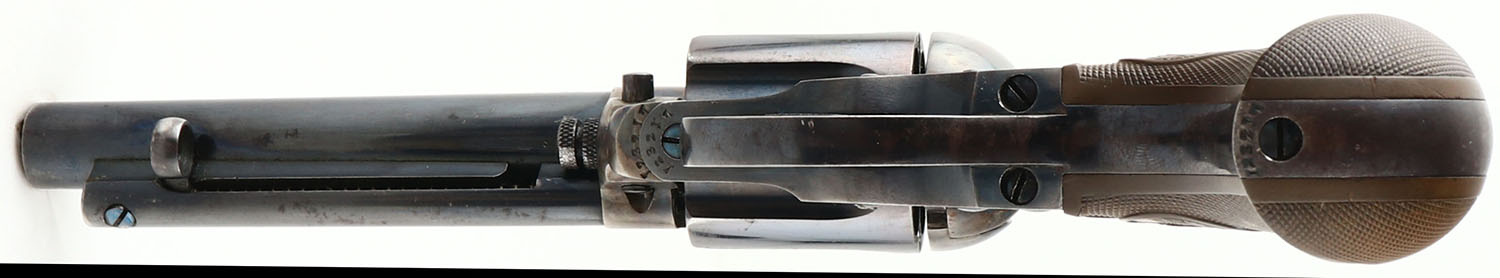 Colt, 1877 ''Lightning'', CAL: 38, MFG: 1901, SN: 123217, Double Action Revolver, 4 1/2'' round barrel. The top of the barrel is stamped in two lines ''COLTS PT.F.A MFG. CO HARTFORD, CT. U.S.A''. The left side of the frame is marked with the standard three line patent dates, next to the circled Rampant Colt logo. The full SN can be found on the frame, trigger guard & butt. The original checkered brown hard rubber grips with Rampant Colt are excellent. There is a small spot on both grips where the checkering is worn smooth & some minor contusions, otherwise excellent. The original metal blue finish on the barrel rates 90%, with concentrated holster wear to the muzzle & ejecotor rod housing. The cylinder rates 85% & the trigger guard rates 50-60%, with concentrated loss to the straps, with areas beginning to tone to a brown patina. The case-hardned frame is excellent, retaining vivid case-colors. Bore is very good, with intermittent roughness & a couple spots of pitting, concentrated to the top of the bore. Small v-notch rear sight & large blade front sight. An excellent example of an all original 1877. FFL or C&R Req. - Value: 1400 to 2000