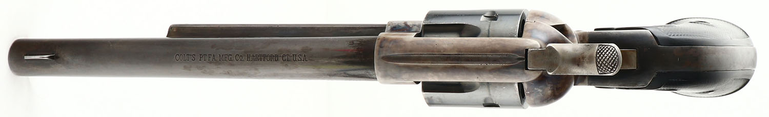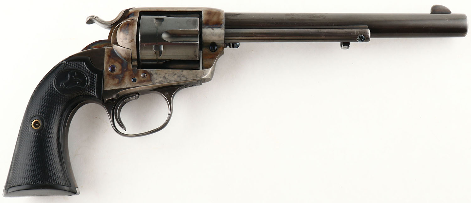 Colt Bisley, CAL: 38 WCF, MFG: 1904, SN: 258881, Single Action Revolver, 7 1/2'' barrel. The pistol carries an ampersand ''&'' mark used by Colt to indicate a revolver having been returned to the factory for adjustment, repair or refinishing. The checkered & Rampant Colt hard rubber grips are very good, with a couple of minor nicks or contusions, & smoothing of checkering from use. The metal blue finish rates 70% overall toning grayish/brown as it thins & ages. The cylinder bright blue rate 85%. The case-hardened frame displays strong case colors. Bore is excellent, bright with proud rifling. Matching SN on the frame, trigger guard & bottom strap. The top of the barrel is stamped ''COLTS PT.F.A MFG. CO HARTFORD, CT. U.S.A''. The left side of the barrel is marked ''(Bisley Model) 38 Special''. Left side of frame is stamped with the two line patent dates. Action & cylinder timing function properly. FFL or C&R Req. - Value: 1200 to 2500