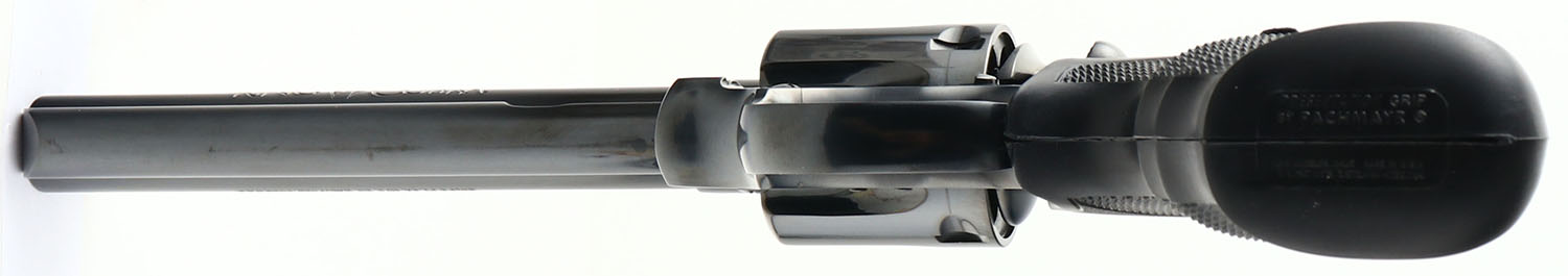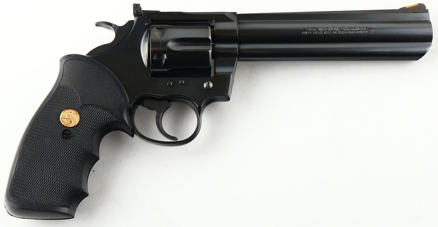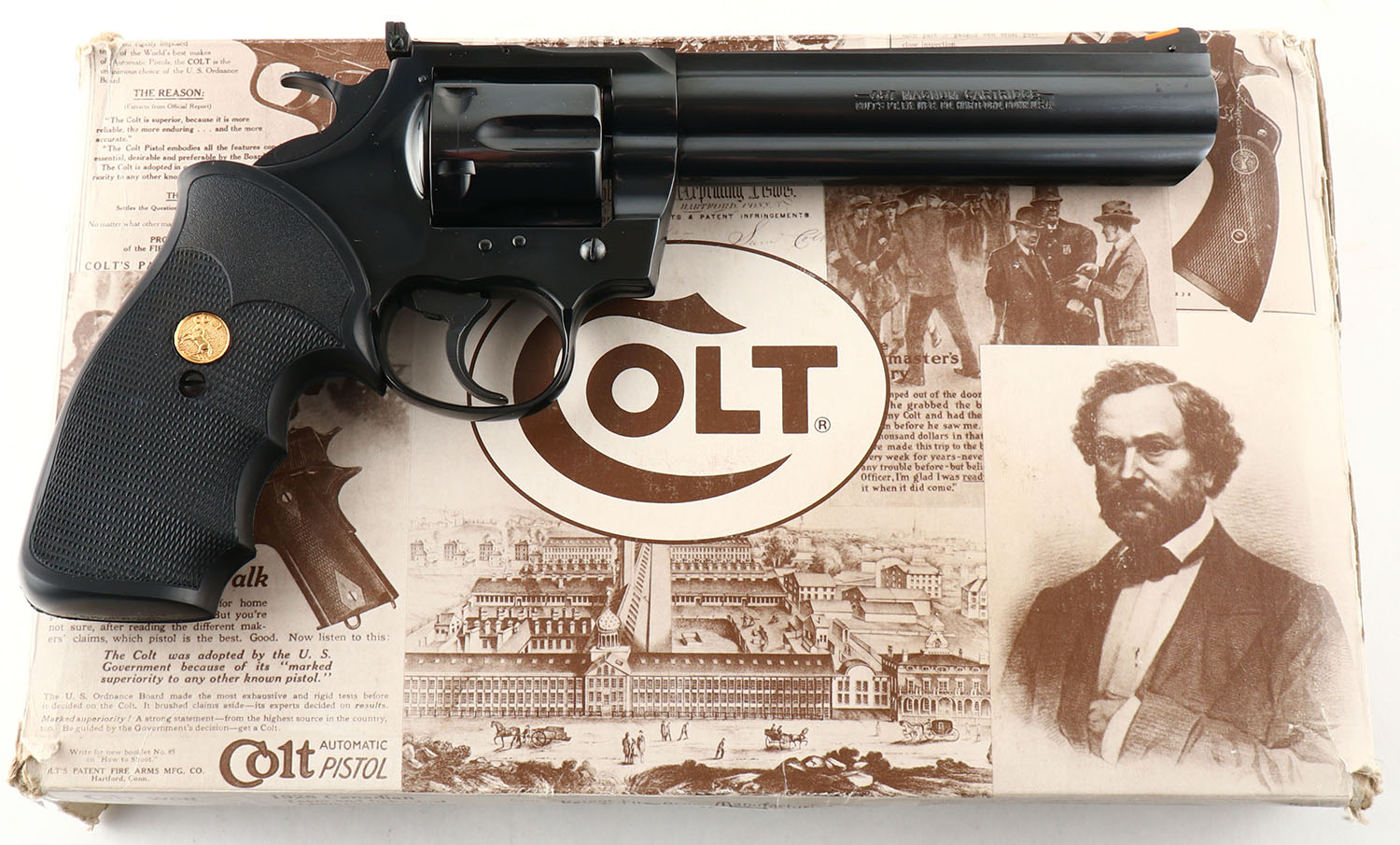 BOX & CASED, Colt, Model KING COBRA, (AA3660), CAL: 357 MAGNUM, MFG: 1992, SN:VK1234, Double Action Revolver, 6''' barrel. First introduced in 1986, the Colt King Cobra is a medium ''V'' frame double-action revolver made of very hi-grade carbon steel & featuring a six round cylinder. The bright blue finish of the initial offering in both 4'' & 6'' lengths were offered from 1986-1992. It was marketed to both aw enforcement agencies & civilian firearms enthusiasts. Two subsequent offerings of this model were later produced, however collectors gravitate to these early production models, which subsequently demand a higher collector value. The left side of barrel is stamped ''KING COBRA''. The right side ''357 MAGNUM CARTRIDGE''. They came with Colt gold medallion Pachmayr black checkered rubber grips, with finger grooves. The grips on this example are excellent. The high polish blue finish is 99%, excellent. Bore is excellent. The solid rib barrel holds a screw height adjusting white ''U'' notch rear sight & front blade, with the serrated orang insert. This gun comes with original blue plastic case, in the original numbers matching outer sleeve box, with hang tag, packaging & instruction manual. Excellent overall & highly collectible. FFL Req. - Value: 1500 to 2500
