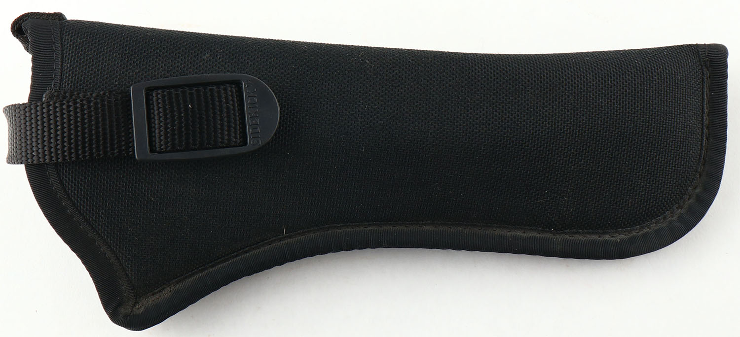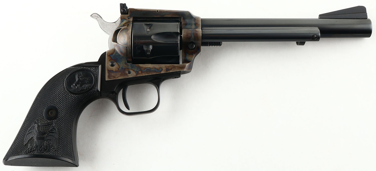 Colt, New Frontier .22, CAL: .22LR, MFG: 1976, SN: G194185, Single Action Revolver, 6'' barrel. The Rampant Colt & E.Pluribus Unum checkered hard rubber grips are excellent, with minor handling marks. The metal blue finish rates 98% overall. The case-hardened frame displays excellent case-colors. Bore is excellent. Square notch adjustable rear sight & long serrated blade front sight. Comes with a Uncle Mike's holster. FFL or C&R Req. - Value: 350 to 550