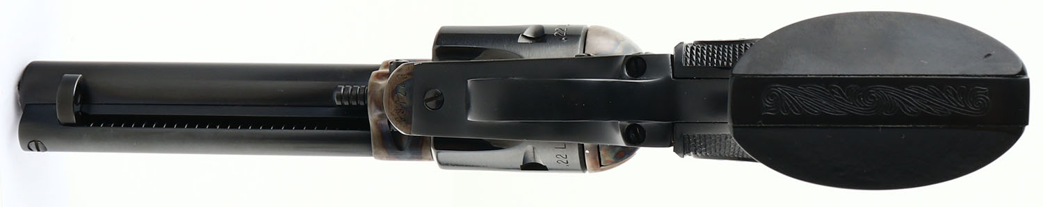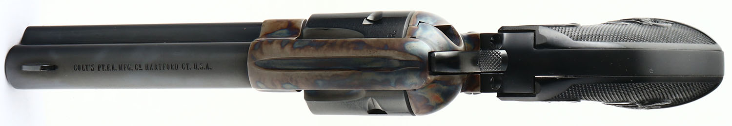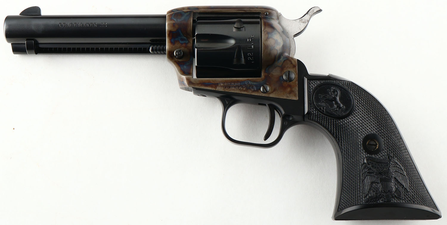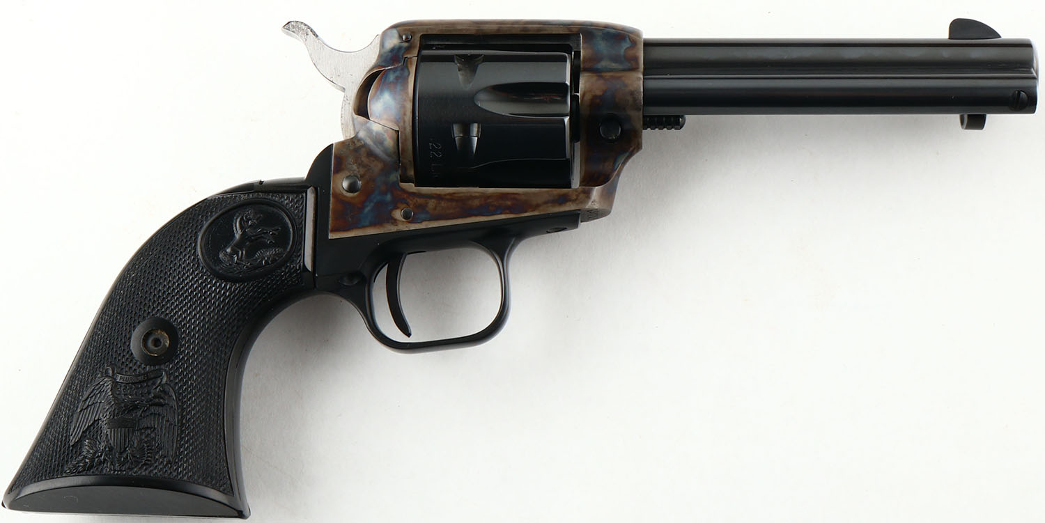 BOXED, Colt, Peacemaker .22 Dual Cylinder, CAL: .22LR/.22 MAG, MFG: 1974, SN: G97243, Single Action Revolver, 4 3/8'' barrel. The top of the barrel is marked ''COLTS PT. F.A. MFG. Co. HARTFORD, CT. U.S.A.'', the left side is marked ''PEACEMAKER .22'', the left side of the frame is marked with the two line patent date & Rampant Colt logo. The Rampant Colt & E. Pluribus Unum checkered grips are excellent. The metal blue finish on the barrel, cylinder & trigger guard rates 99% & the case-hardened frame has excellent case-colors. Bore is excellent. Integral square notch rear sight & small blade front sight. Comes in original SN matching wood grain box, with extra .22 MAG cylinder, related paperwork. This example has the more desireable 4.4'' barrel, which people pay a premium for. A collectible Colt revolver. FFL or C&R Req. - Value: 800 to 1100