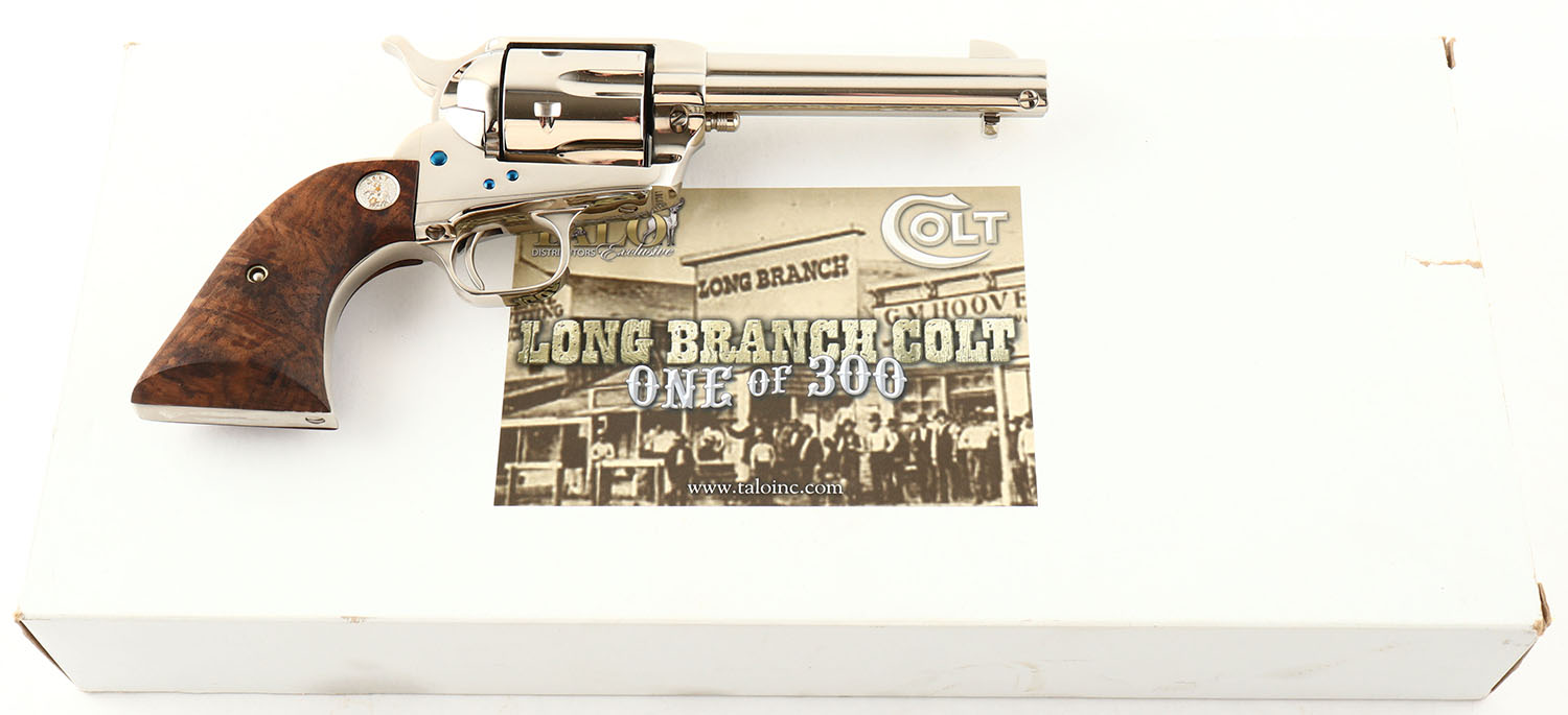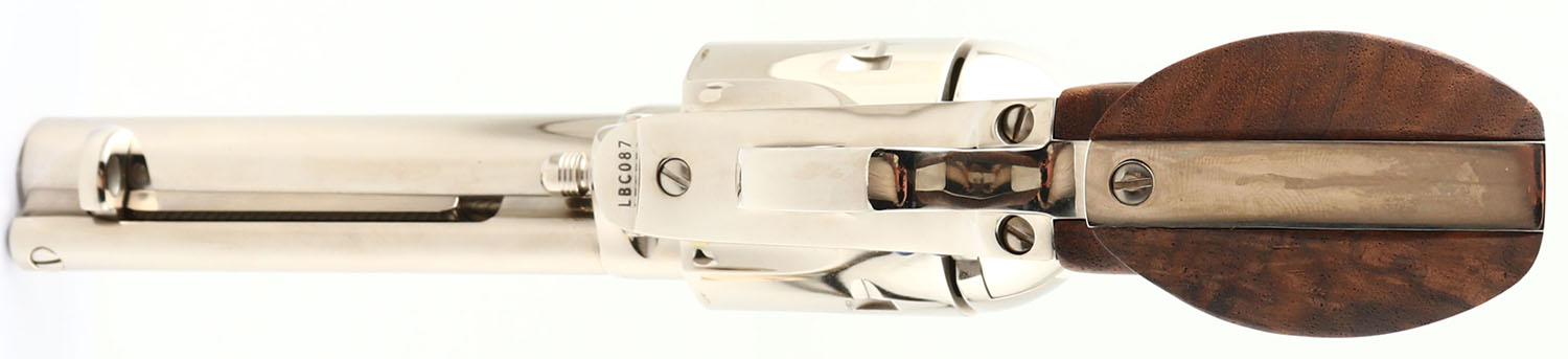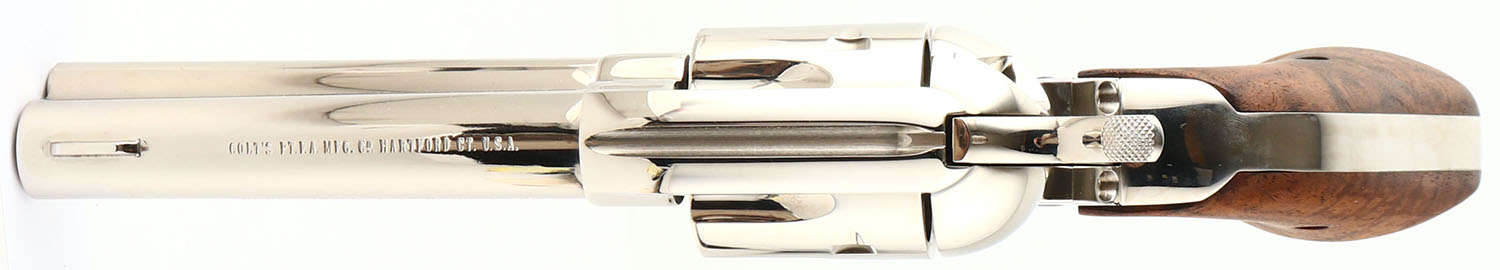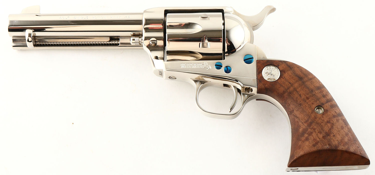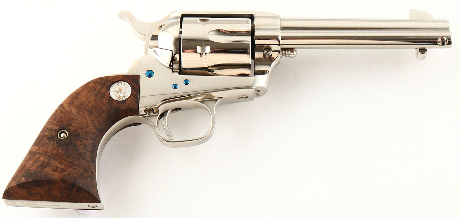 Colt, Single Action Army - 3rd Gen, CAL: 45 LC, MFG: Modern, SN: LCB087, Single Action Revolver, 4 3/4'' barrel. The top of the barrel is marked ''COLTS PT. F.A. MFG. Co. HARTFORD, CT. U.S.A.'' & the left side of the barrel is marked ''COLT SINGLE ACTION ARMY 45''. The left side of the frame is marked with the standard two line patent dates & Rampant Colt logo. The Colt logo medallion walnut grips are excellent. The original nickel finish is excellent. The fire blue finish on the screws are excellent. Bore is excellent. Square notch rear sight & blade front sight. FFL Req. - Value: 1500 to 2200