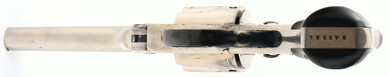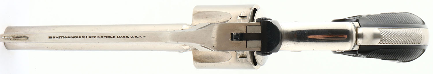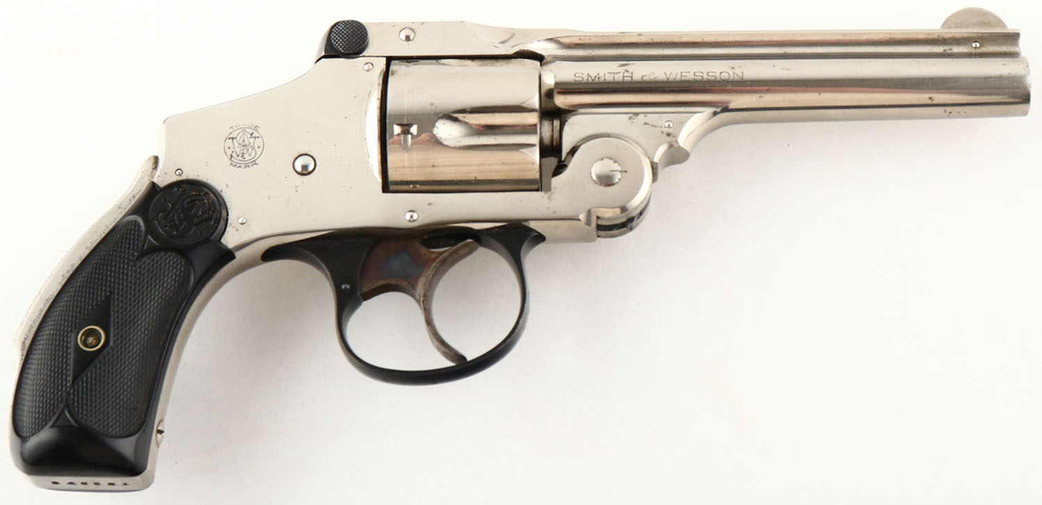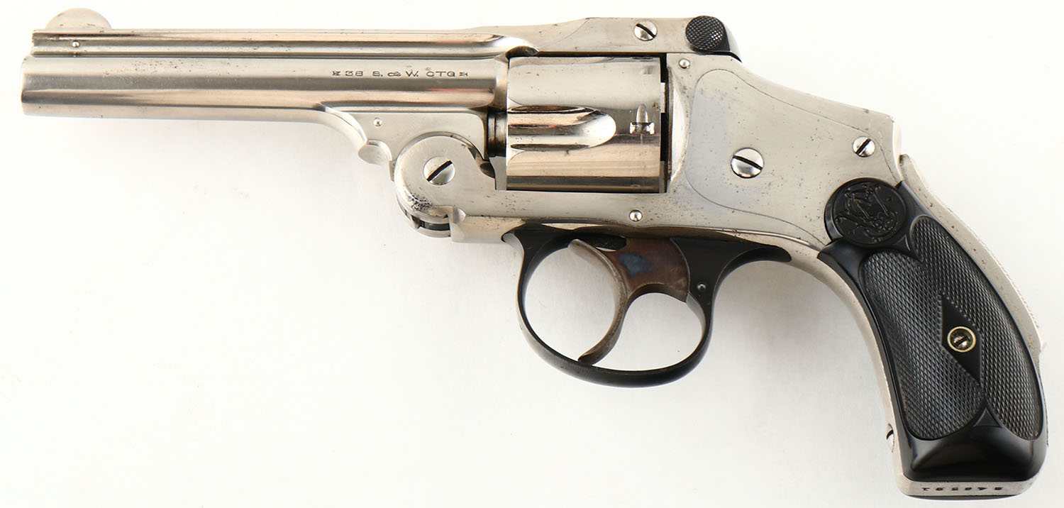 Smith & Wesson, .38 Safety Hammerless, CAL: 38 S&W, MFG: 1907-40, SN: 246321, Double Action Revolver, 4'' barrel. The top of the barrel is marked ''SMITH & WESSON SPRINGFIELD MASS USA''. The left side of the barrel is marked ''+38 S&W CTG+'', the right side of the barrel was marked ''SMITH & WESSON''. The right side of the frame is marked with the S&W trademark logo. The S&W monogram checkered hard rubber grips are excellent. The original nickel finish rates 95% overall, with visible brush strokes & intermittent light speckling. Case-colored trigger retains visible case-colors. Bore is excellent. Fixed notch rear sight & pinned blade front sight. A nice original example of a .38 Safety Hammerless. FFL or C&R Req. - Value: 600 to 1000