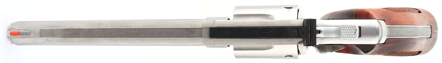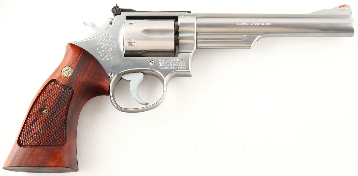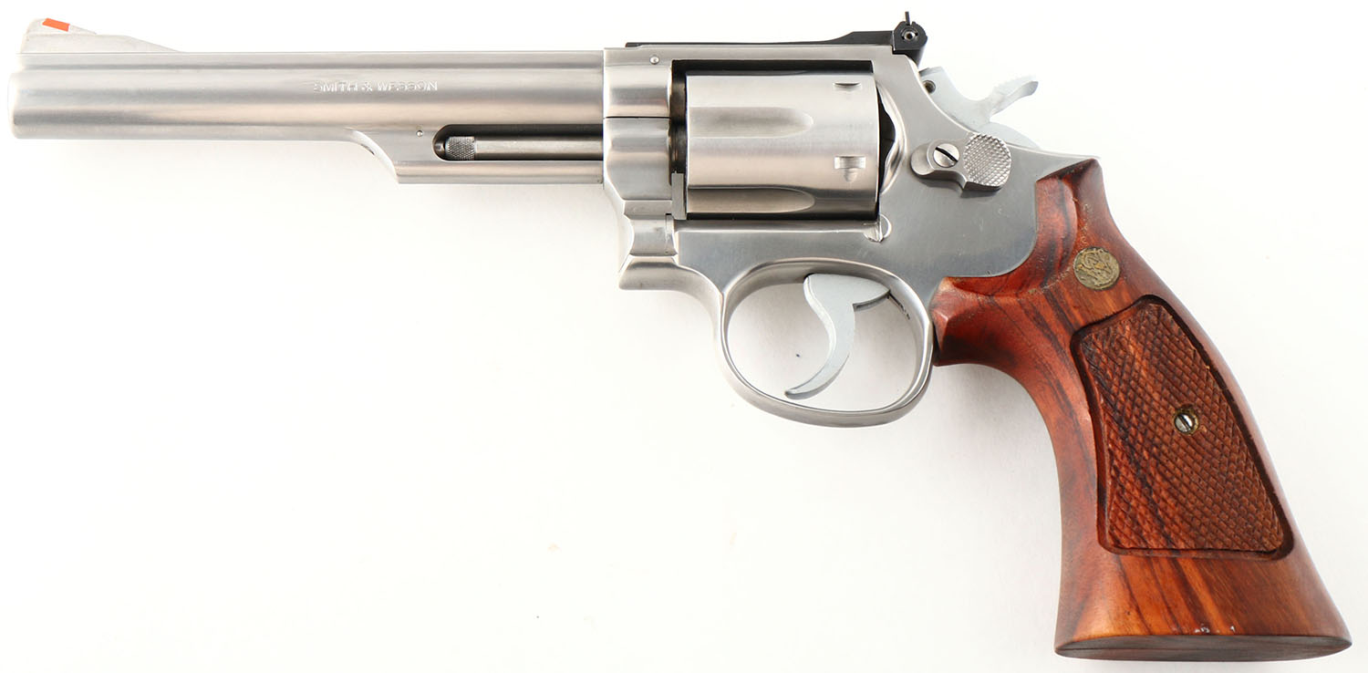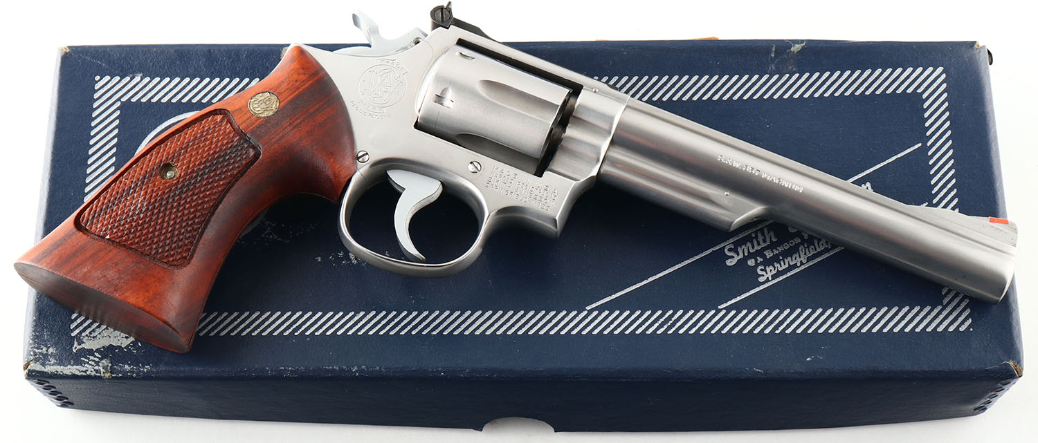 BOXED, Smith & Wesson, Model 66-1, CAL: 357 MAG, MFG: 1980, SN: 59K9688, Double Action Revolver, 6'' barrel. The left side of the barrel is marked ''SMITH & WESSON''. The right side of the barrel is marked ''S&W.357 MAGNUM''. The left side of the frame is marked with the standard four line address stamp & a large S&W trademark logo above the grip. The original S&W medallion checkered wood grips are excellent. The original stainless steel finish is excellent. Bore is excellent. Adjustable rear sight & elevated serrated blade front sight with orange insert. Comes in factory SN matching box, with related paperwork, cleaning rod/tips & wax paper. FFL Req. - Value: 500 to 700