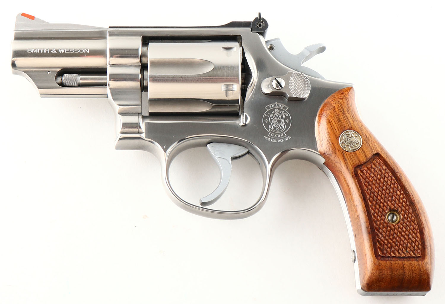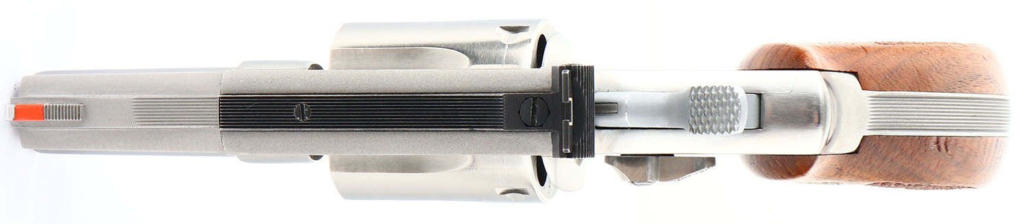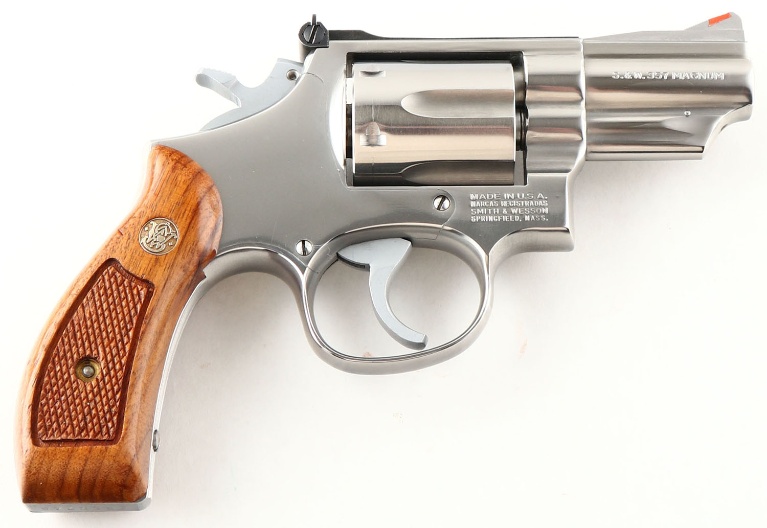 BOXED, Smith & Wesson, Model 66-2, CAL: 357 MAG, MFG: 1982, SN: 251K746, Double Action Revolver, 2 1/2'' barrel. The left side of the barrel is marked ''SMITH & WESSON''. The right side of the barrel is marked ''S&W.357 MAGNUM''. The left side of the frame is marked with the standard four line address stamp. The right side of the frame has a large S&W trademark logo above the grip. The original S&W medallion checkered wood grips are excellent. The original stainless steel finish is excellent. Bore is excellent. Adjustable rear sight & elevated serrated blade front sight with orange insert. Comes in factory SN matching box, with wax paper. FFL Req. - Value: 500 to 800