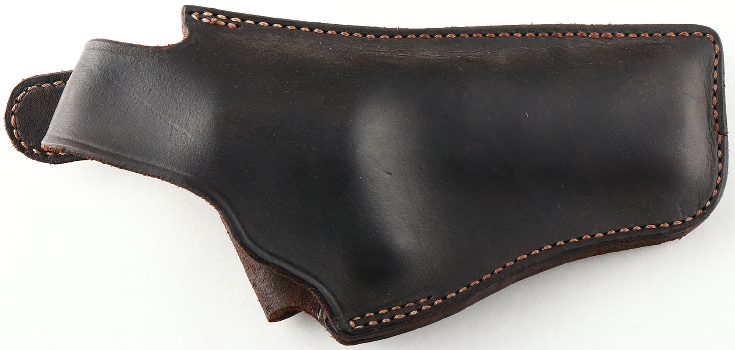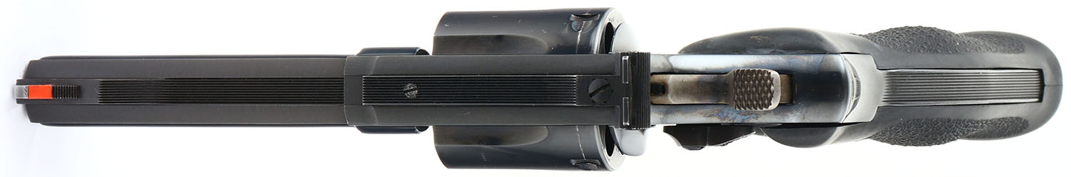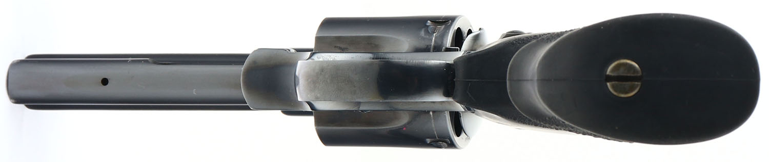 Smith & Wesson, Model 586, CAL: 357 MAG, MFG: 1981-85, SN: AAF1000, Double Action Revolver, 4'' barrel. The Hogue Monogrip stippled rubber grips are excellent. The original metal blue finish rates 97% on the barrel & 98% on the frame. The trigger & hammer retain excellent case-colors. Bore is excellent. Adjustable rear sight & elevated serrated blade front sight. Comes with a unmarked leather holster. FFL Req. - Value: 550 to 950