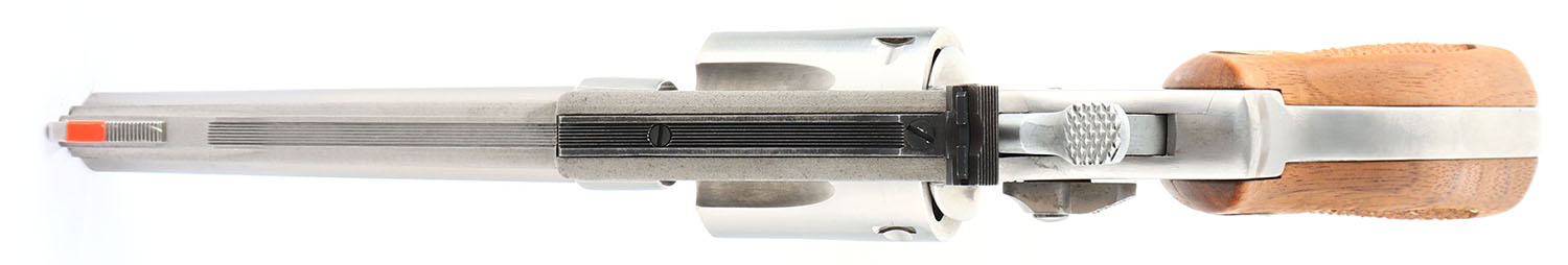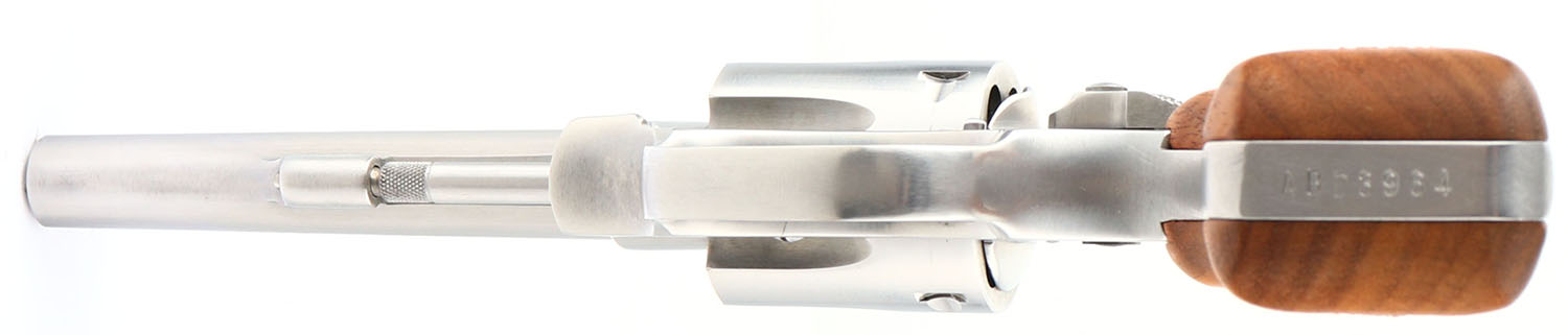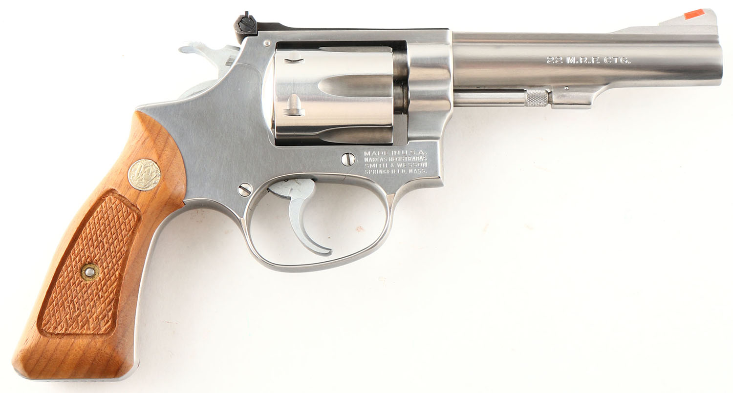 BOXED, Smith & Wesson, Model 651, CAL: 22 RF MAG, MFG: Modern, SN: ABD3964, Double Action Revolver, 4'' barrel. The S&W logo medallion checkered wood grips are excellent. The stainless steel finish is excellent. Bore is excellent. Adjustable rear sight & elevated serrated blade front sight with orange insert. Comes in factory SN matching box, with related paperwork, cleaning rod/tips & wax paper. FFL Req. - Value: 800 to 1300
