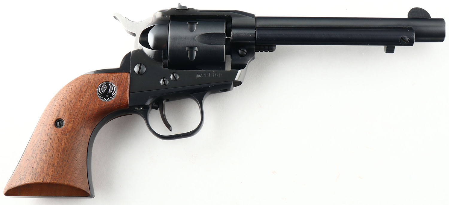Ruger, Single-Six, CAL: 22LR, MFG: 1968, SN: D499860, Single Action Revolver, 5 1/2'' barrel. The top of the barrel is marked with the standard address stamp. The left side of the frame is marked in two lines ''RUGER .22CAL/ SINGLE SIX'' & Ruger Pheonix logo. The right side of the frame has the full SN. The Ruger logo medallion wood grips are excellent. The original metal blue finish rates 98% overall. Bore is excellent. Fixed square notch rear sight & round blade front sight. Comes with .22 MAG cylinder. This revolver is unique in the sense that the ''D'' prefix in the SN is actually a stamp meaning ''Duplicate Serial Number''. Duplicate Ruger Single Six serial numbers are rare but have occurred in the past, typically due to errors in production or storage. An excellent example of an original Single Six. FFL or C&R Req. - Value: 350 to 500