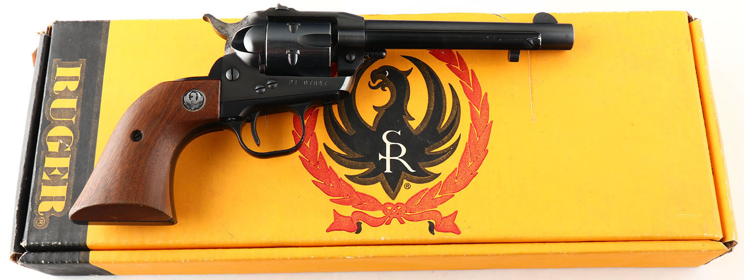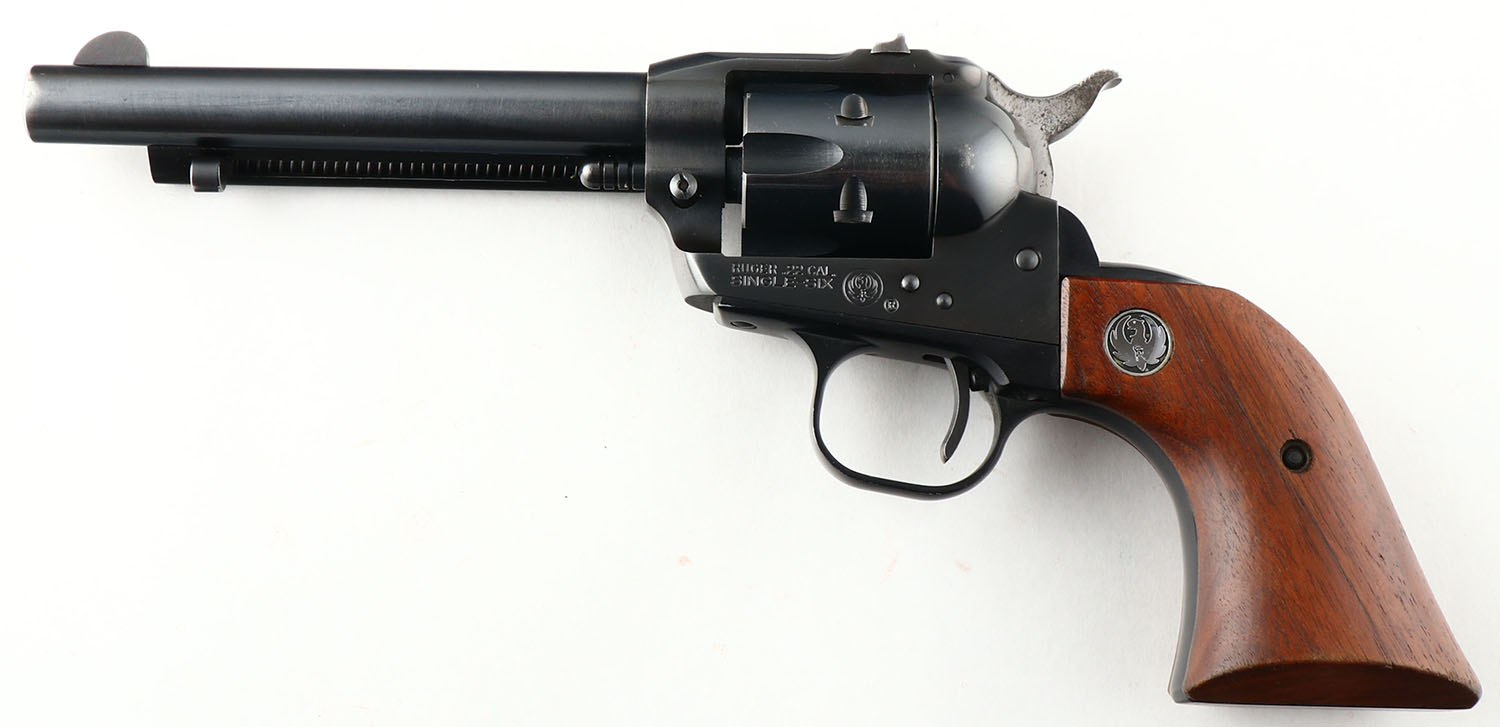 Ruger, Single-Six, CAL: 22LR, MFG: 1971, SN: 21-07847, Single Action Revolver, 5 1/2'' barrel. The top of the barrel is marked with the standard address stamp. The left side of the frame is marked in two lines ''RUGER .22CAL/ SINGLE SIX'' & Ruger Pheonix logo. The right side of the frame has the full SN. The Ruger logo medallion wood grips are excellent. The original metal blue finish rates 97% on the barrel & 99% on the frame. Bore is excellent. Fixed square notch rear sight & round blade front sight. Comes with .22 MAG cylinder in red velvet pouch. FFL or C&R Req. - Value: 300 to 450
