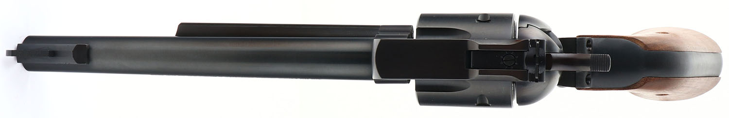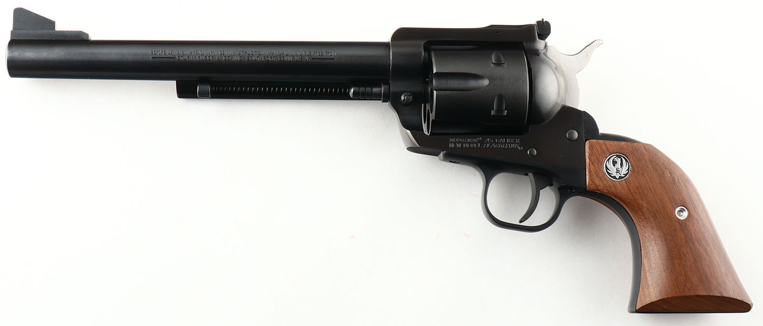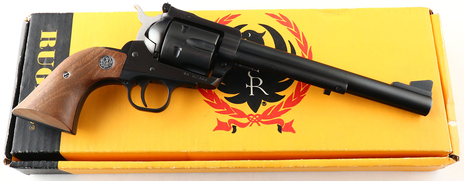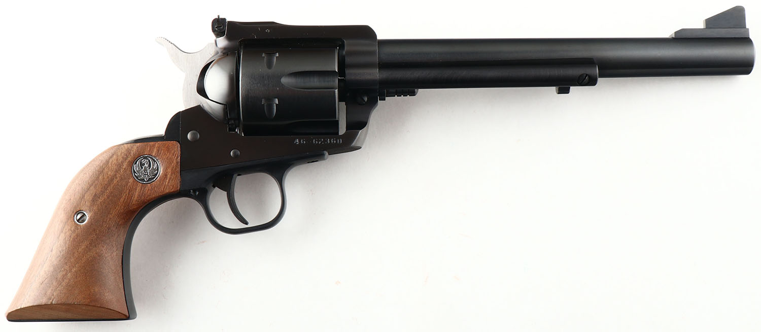 NEW BOXED, Ruger, New Model Blackhawk, CAL: 45LC/45ACP, MFG: 1980, SN: 46-62360, Single Action Revolver, 7 1/2'' barrel. The left side of the barrel is marked with the standard warning & address stamp. The left side of the frame is marked ''RUGER .45 CALIBER/NEW MODEL BLACKHAWK''. The SN is marked on the right side of the frame. The Ruger logo medallion wood grips are mint. The blued metal finish rates 100%. Bore is mint. Adjustable rear sight & elevated serrated blade front sight. Comes in factory box, with .45 ACP cylinder in original box & related paperwork. FFL Req. - Value: 500 to 650