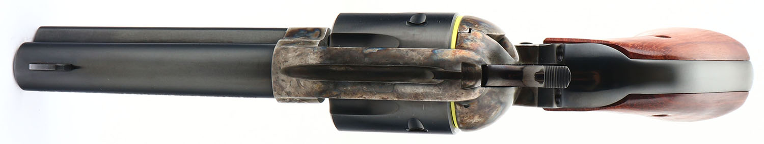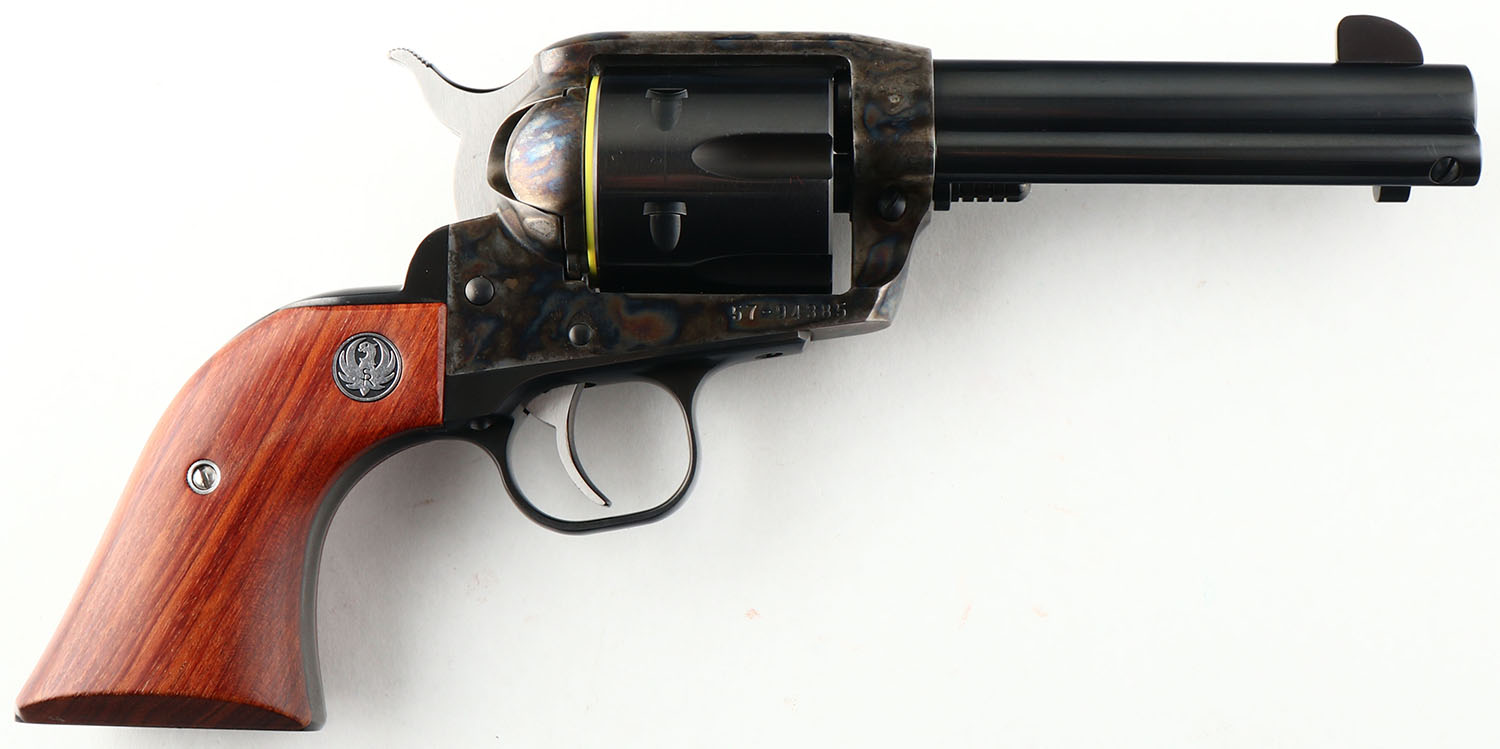 Ruger, Vaquero, CAL: 44 MAG, MFG: 1994, SN: 57-94385, Single Action Revolver, 4 5/8'' barrel. The left side of the barrel is marked with the standard warning & address stamp. The left side of the frame is marked ''RUGER VAQUERO/ .44 MAG CAL''. SN on the right side of the frame. The Ruger logo medallion smooth rosewood grips are excellent. The original blued finish on the barrel, cylinder & grip frame rates 99%. The cylinder has only a faint drag line. The case-colored frame is excellent. Bore is excellent. Square notch rear sight & round blade front sight. FFL Req. - Value: 600 to 800