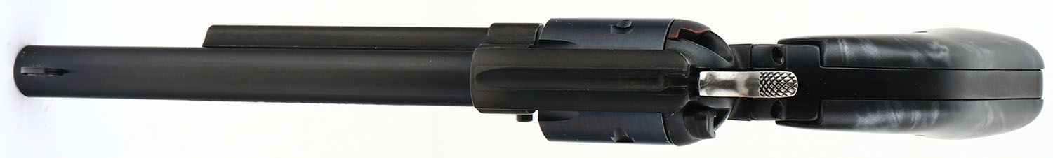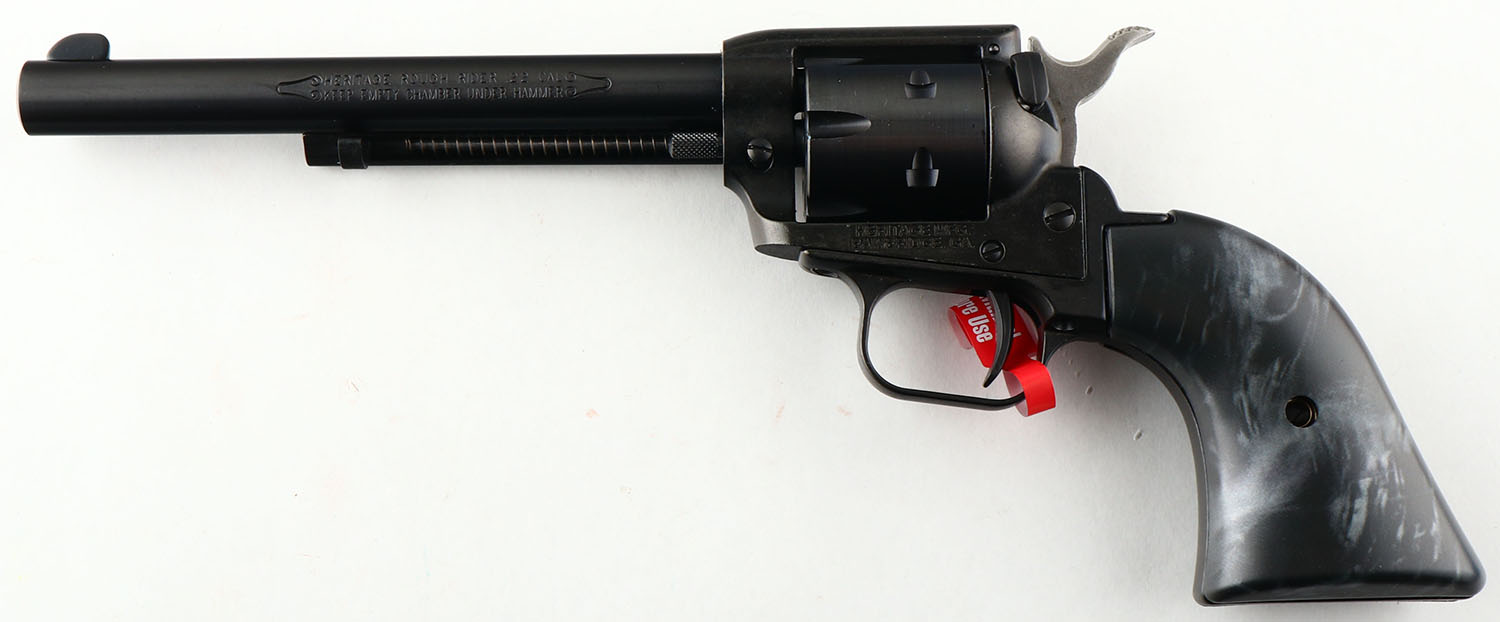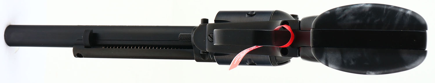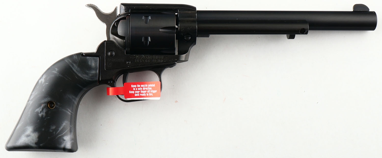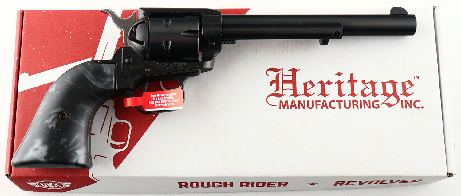 NEW BOXED, Heritage, Rough Rider - Black Pearl , CAL: 22LR, MFG: Modern, SN: 3PH058020, Single Action Revolver, 6 1/2'' barrel. The synthetic black pearl grips are excellent. The metal blue finish on the barrel & cylinder rates 99%. Frame has factory matte black finish, with spotting underneath. These types of finishes are typical amongst most all Heritage products. Bore is excellent. Integral square notch rear sight & blade front sight. Factory hang tag still attached, hammer safety bar & plastic cylinder disc still present. Comes in original box, with related paperwork & lock. NIB. FFL Req. - Value: 120 to 170