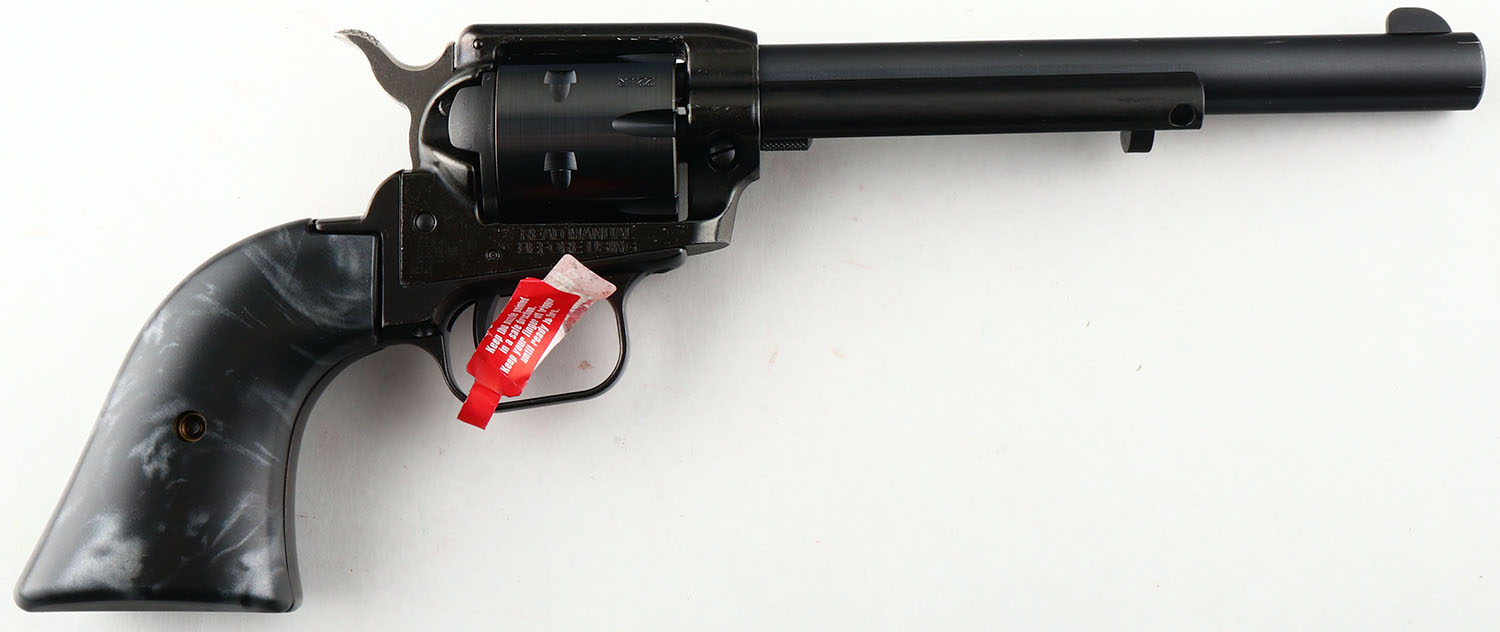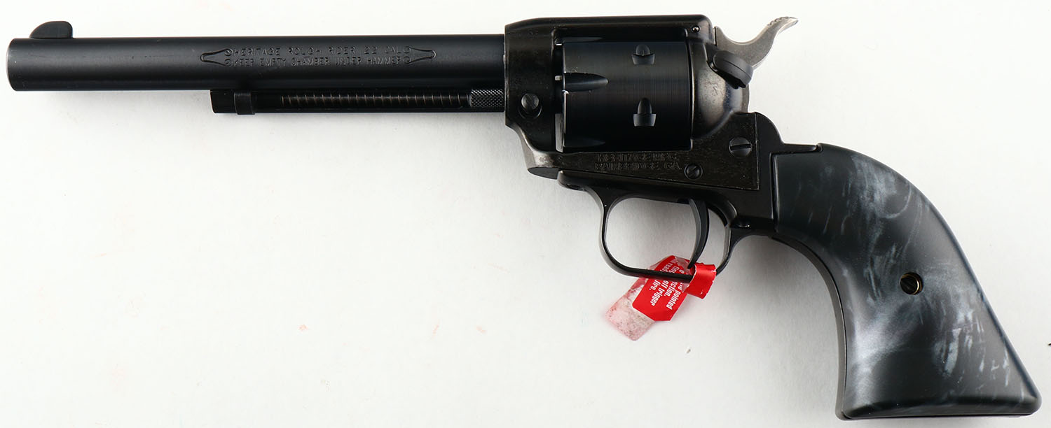 NEW BOXED, Heritage, Rough Rider - Black Pearl , CAL: 22LR, MFG: Modern, SN: 1BH434908, Single Action Revolver, 6 1/2'' barrel. The synthetic black pearl grips are excellent. The metal blue finish on the barrel & cylinder rates 99%. Frame has factory matte black finish, with spotting underneath. These types of finishes are typical amongst most all Heritage products. Bore is excellent. Integral square notch rear sight & blade front sight. Factory hang tag still attached, hammer safety bar & plastic cylinder disc still present. Comes in original box, with related paperwork & lock. NIB. FFL Req. - Value: 120 to 170
