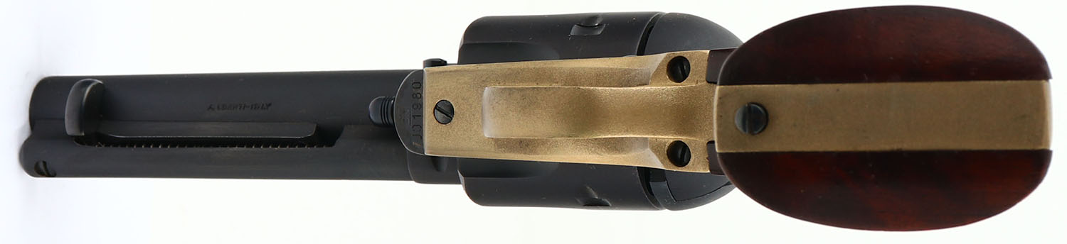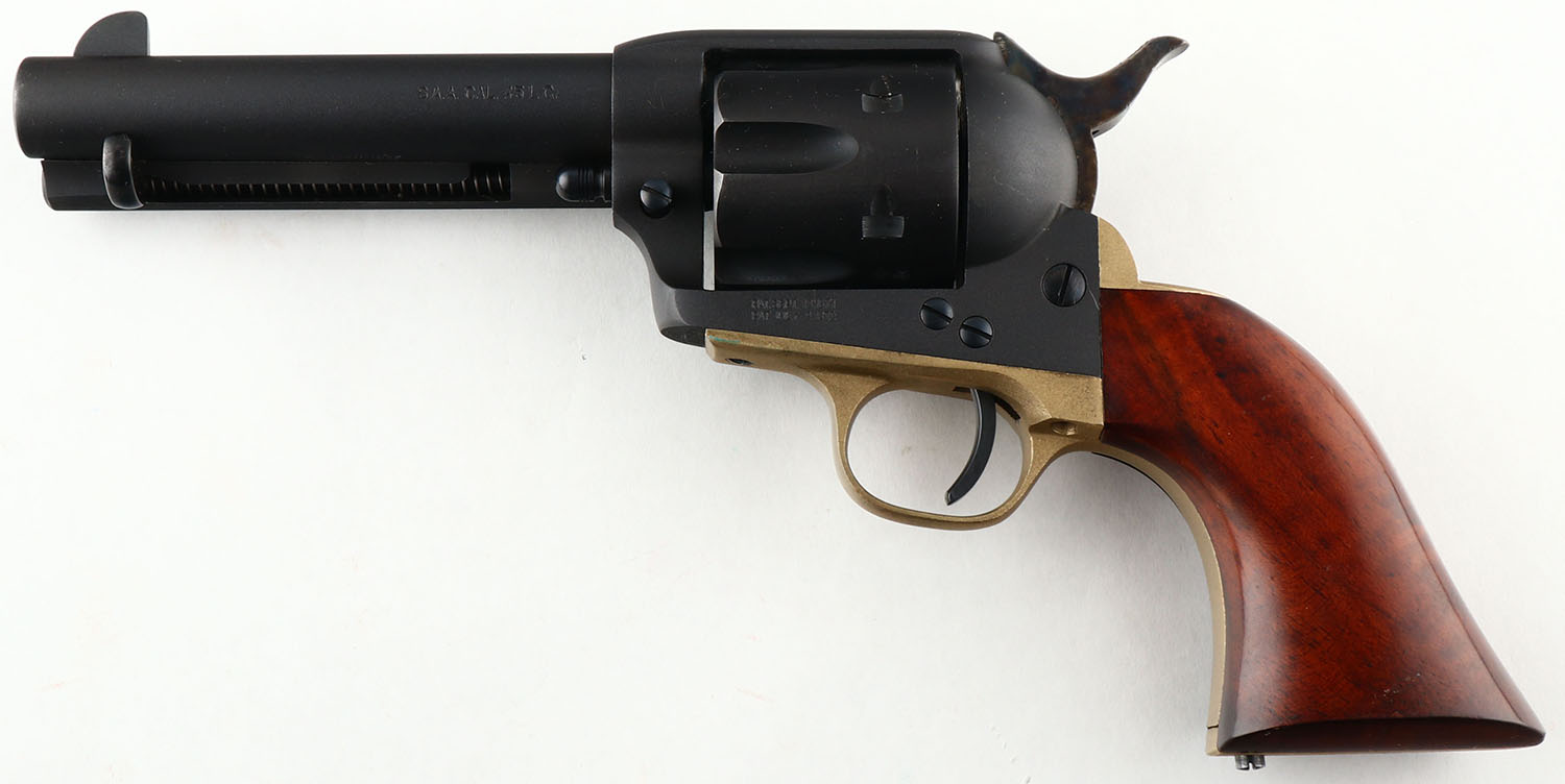 Cabela's (Uberti), 1873 Cattleman (Hombre), CAL: 45 LC, MFG: Modern, SN: J01980, Single Action Revolver, 4 3/4'' barrel. The smooth wood grips are excellent. The matte finish on the barrel, frame & cylinder is excellent overall. The brass grip frame is excellent, with minor wear marks. Bore is excellent. Integral rear sight & blade front sight. Comes with S&W leather holster. FFL Req. - Value: 350 to 500