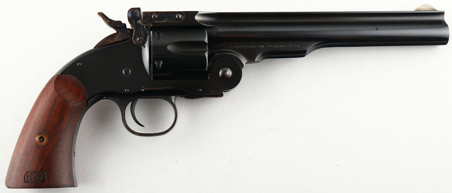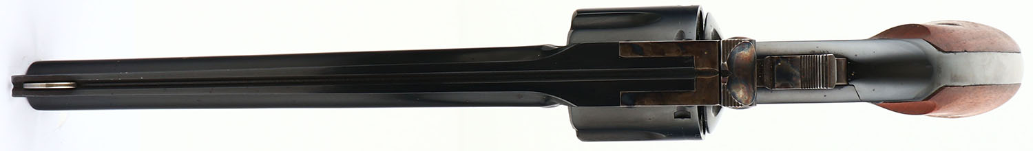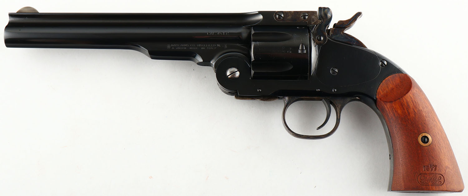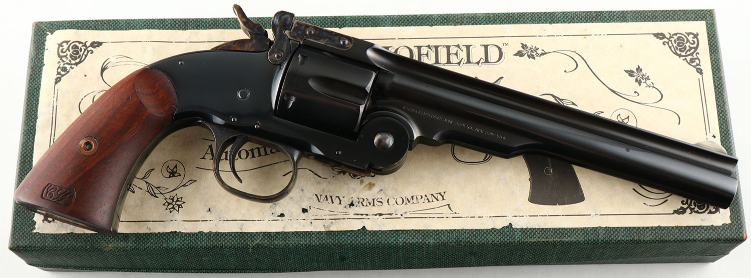 BOXED, Navy Arms (Uberti) 1875 Schofield No. 45 Auto Ejector, CAL: 45 COLT, MFG: Modern, SN: 3611, Single Action Revolver, 7'' barrel. Standard address, caliber & patent dates. The blued finish rates 98% overall, with a few small areas of speckling. The case-hardened trigger guard, hammer & top break lever all have vivid case-colors. Bore is excellent. Integral notch rear sight & round blade front sight. Comes in factory box, with instructions on the lid & a safety pamphlet. Box condition is very good. There is some corner/edge wear & the top label is beginning to peel in the corners, FFL Req. - Value: 700 to 1100