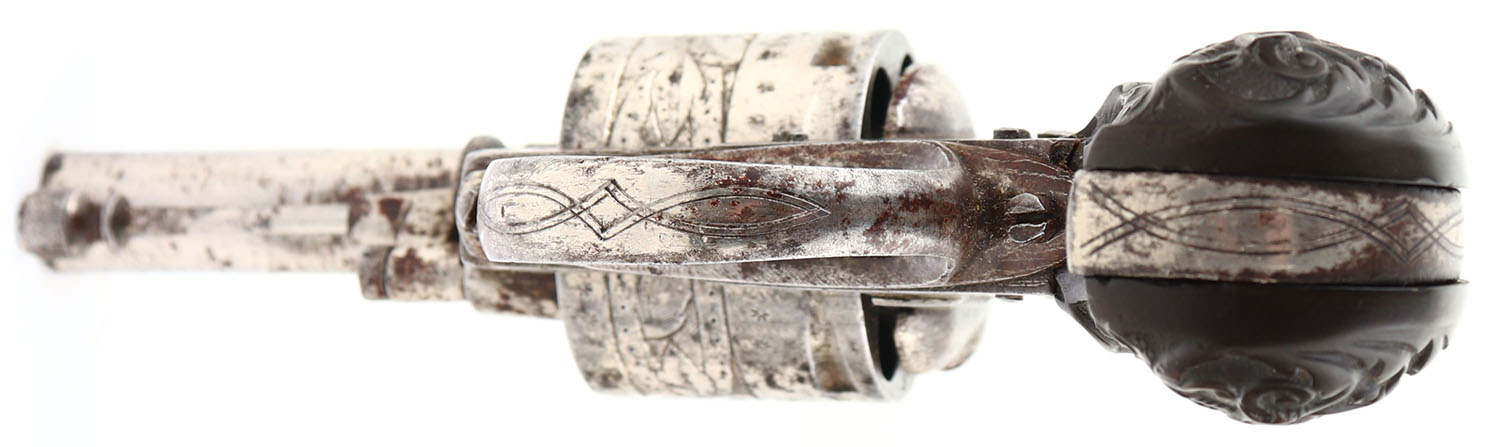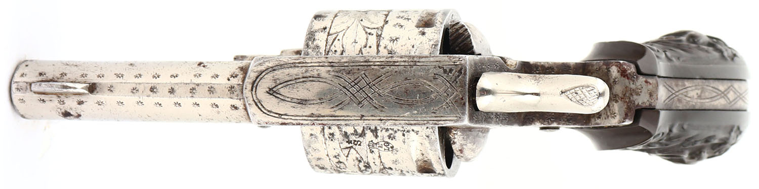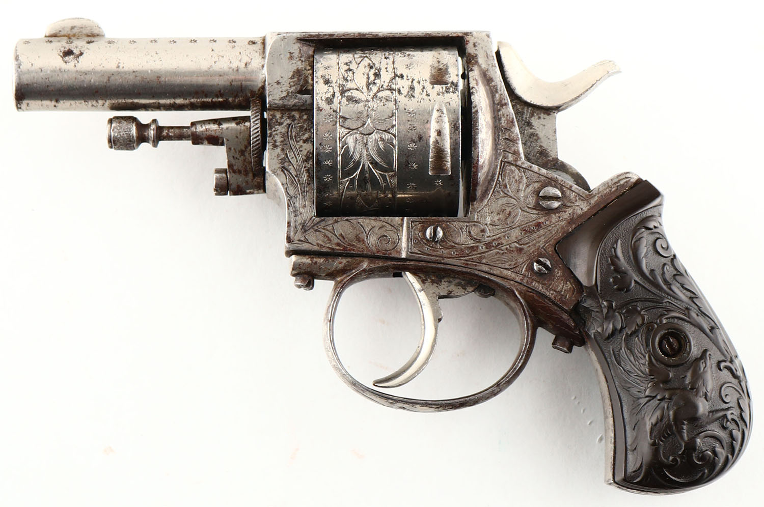 Belgian Bulldog, CAL: 38, MFG: 1890's-1920's, SN: 3335 (under right grip), Double Action Revolver, 2 1/2'' barrel. The right side of the frame is marked with two proofs ''Crown/R'' & ''Star/S''. The cylinder is marked ''Star/S'' & Leige ''ELG in Crown''. The entirety of the revolver is hand engraved with ornamental/floral scroll. The carved hard rubber grips are very good. The left grip has a small edge chip, alongside some other minor dings. The nickel finish rates 85% on the barrel, 75% on the frame & 85% on the cylinder, with consistent spotting toned to a brown patina. Bore is fair, dark & rough. Blade front sight. FFL or C&R Req. - Value: 300 to 600