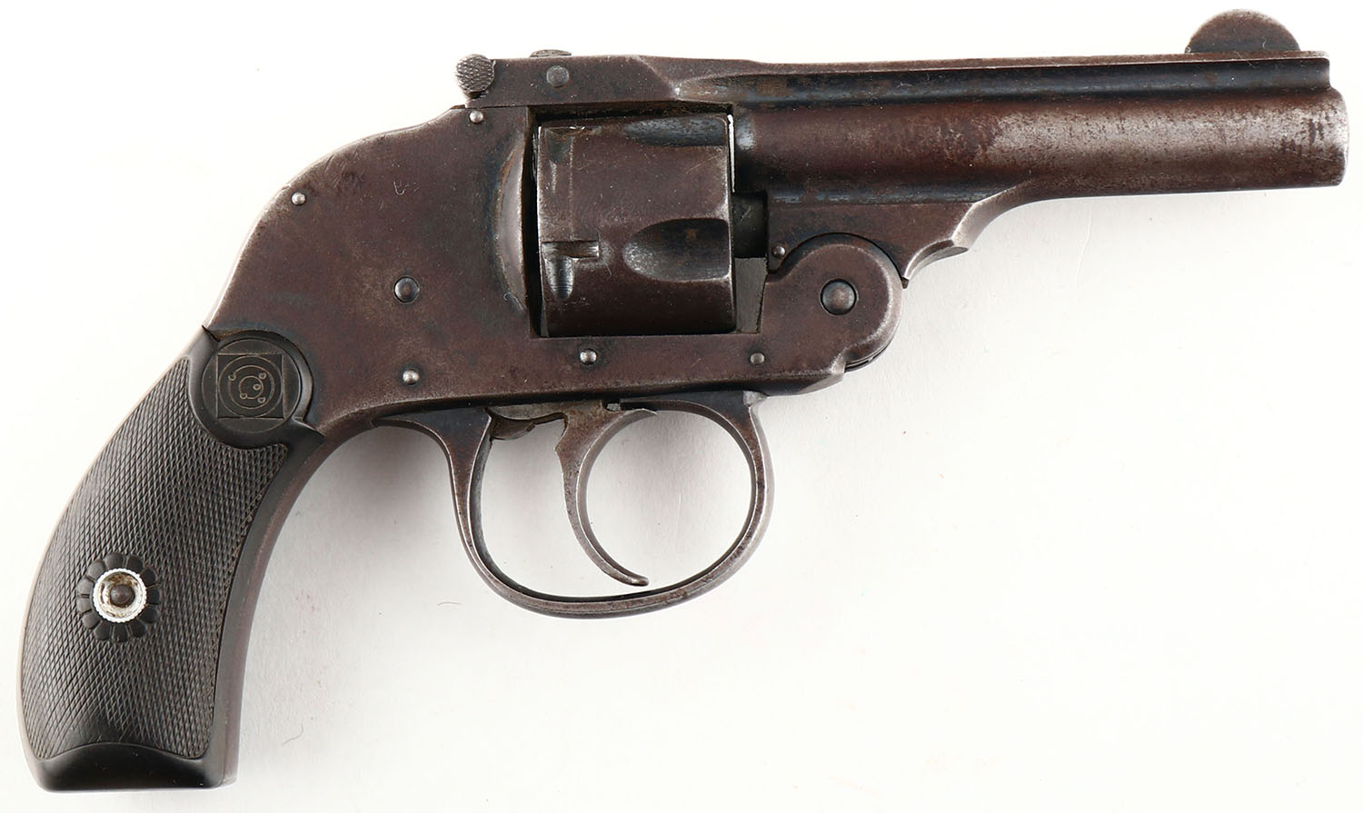 Harrington & Richardson, .32 Hammerless Top Break -Second Model, First Variation, CAL: 32 S&W SHORT, MFG: 1905-06, SN: 102788, Double Action Revolver, 3'' barrel. The Target monogram checkered hard rubber grips are very good & solid. There is consistent handling wear & smooth checkering. The original blued finish has almost fully worn to metal gray & toned to a dark brown patina, with remnants of original blue in protected areas. Bore is good & bright, with spotting, roughness & bulge @ 1 1/4''. Fixed rear sight & blade front sight. FFL or C&R Req. - Value: 50 to 200