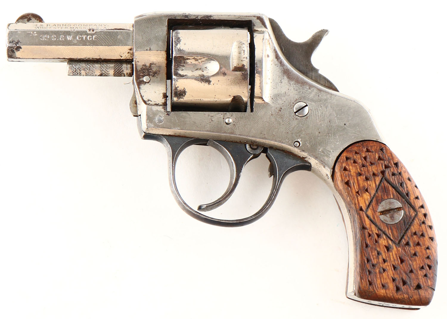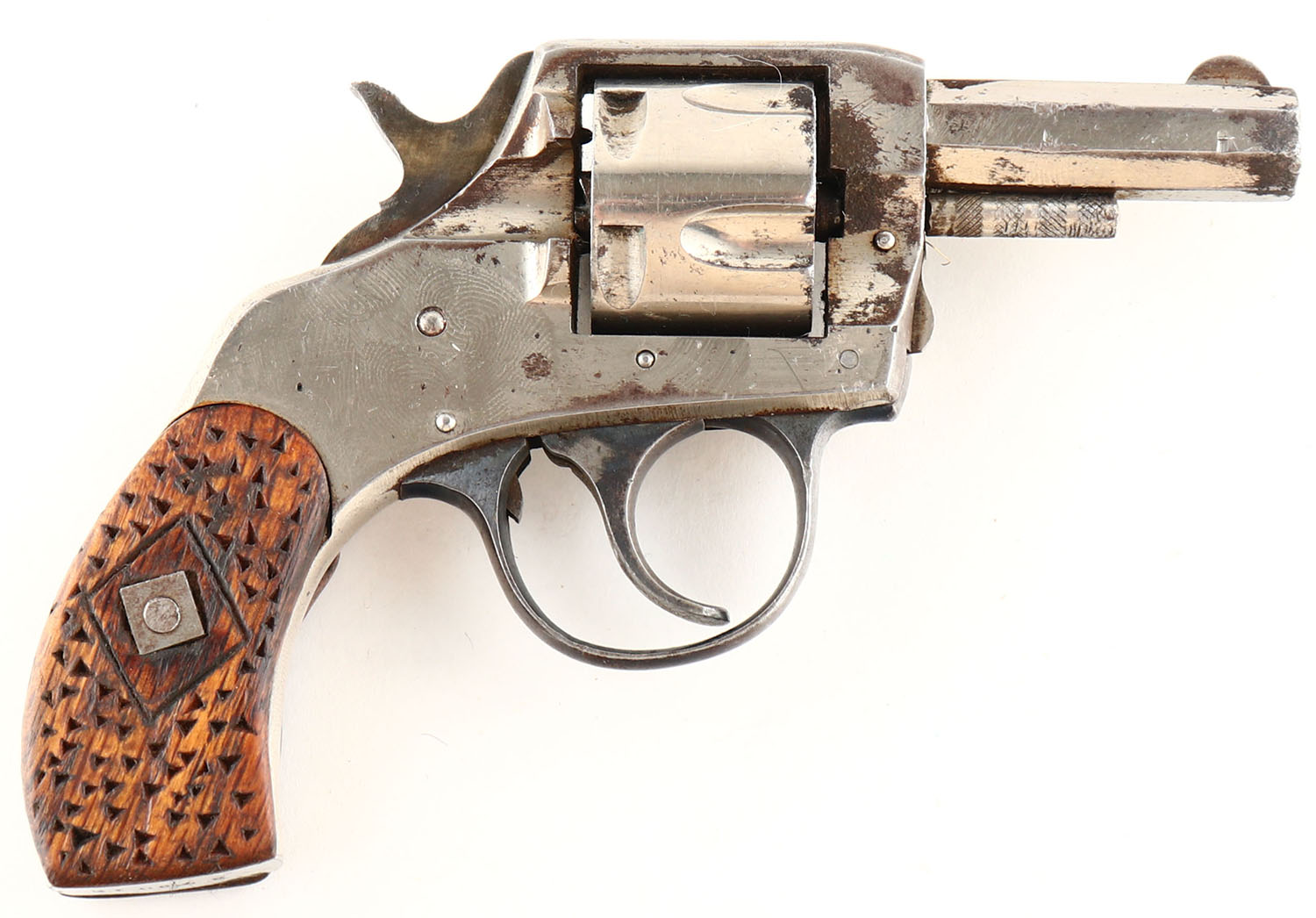 Harrington & Richardson, Young America D.A 1st Model - Third Variation, CAL: 32 S&W, MFG: 1905-41, SN: 273015, Double Action Revolver, 2'' barrel. The wood grips are very good & solid, having been customized with a triangular punch dot motif & hand cut diamonds around the replacement screw. The nickel finish rates 75% overall, with areas worn to metal gray & spots of corrosion. Bore is good & bright, with spots roughness. Half moon blade front sight. Hammer & cylinder function properly. Great little compact carry revolver. FFL or C&R Req. - Value: 60 to 200