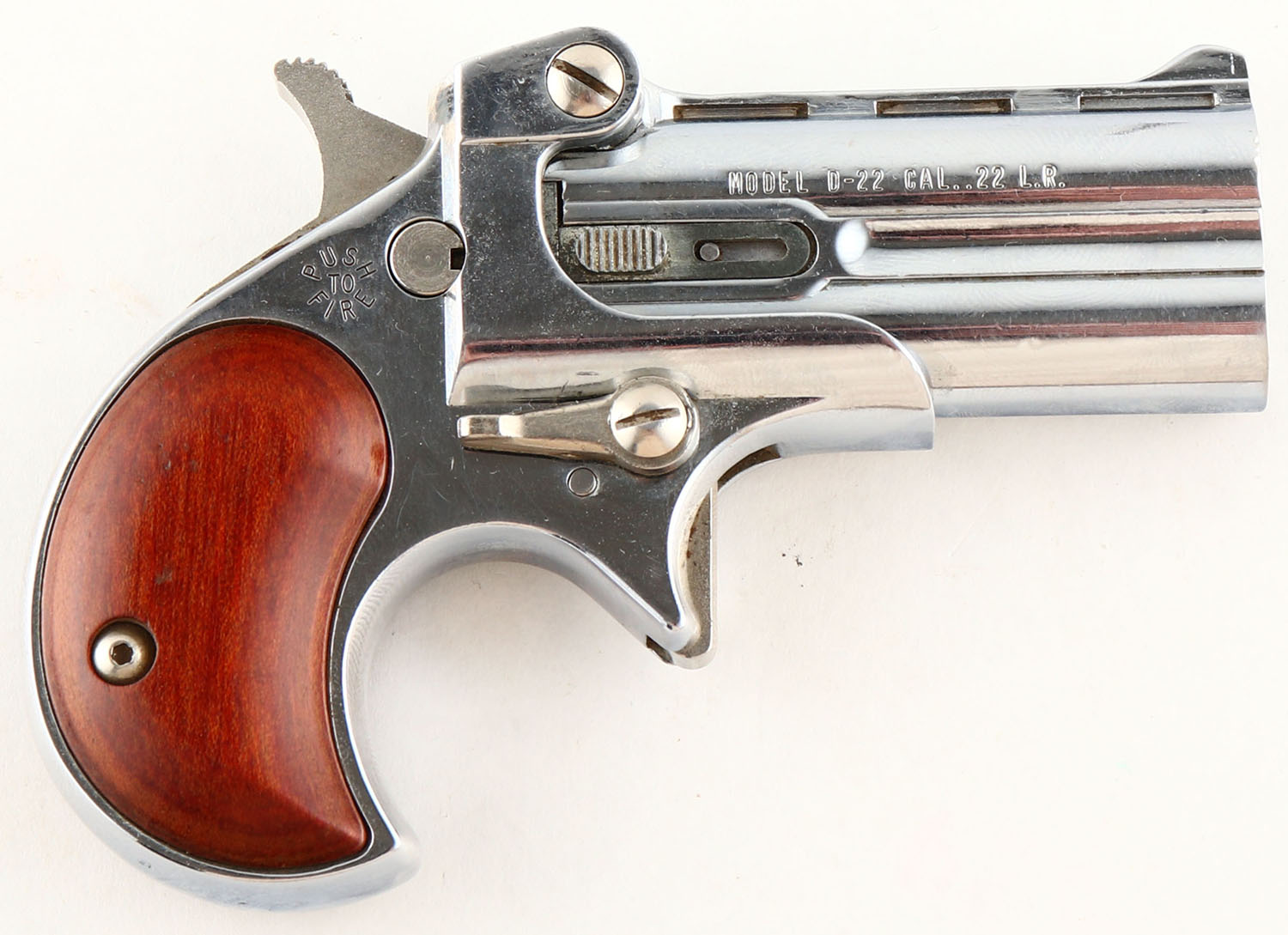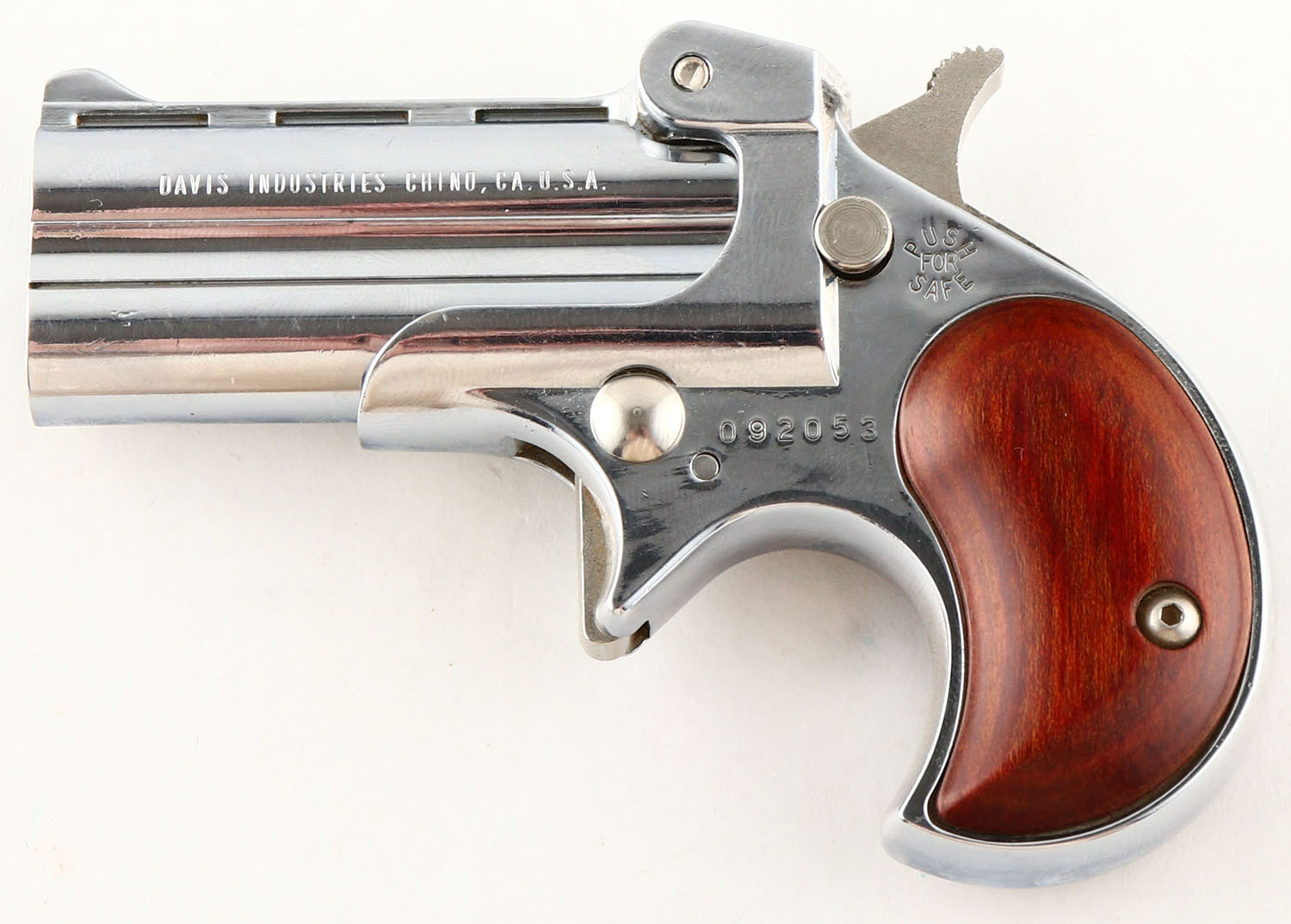 Davis Industries, D-22, CAL: 22LR, MFG: Modern, SN: 092053, Single Action O/U Pistol, 2 3/8'' barrel. Standard factory markings. The wood grips are excellent. The nickel finish is very good overall. There are numerous thin brush lines & minor spotting. Bores are excellent. Notch rear sight & blade front sight. FFL Req. - Value: 150 to 250