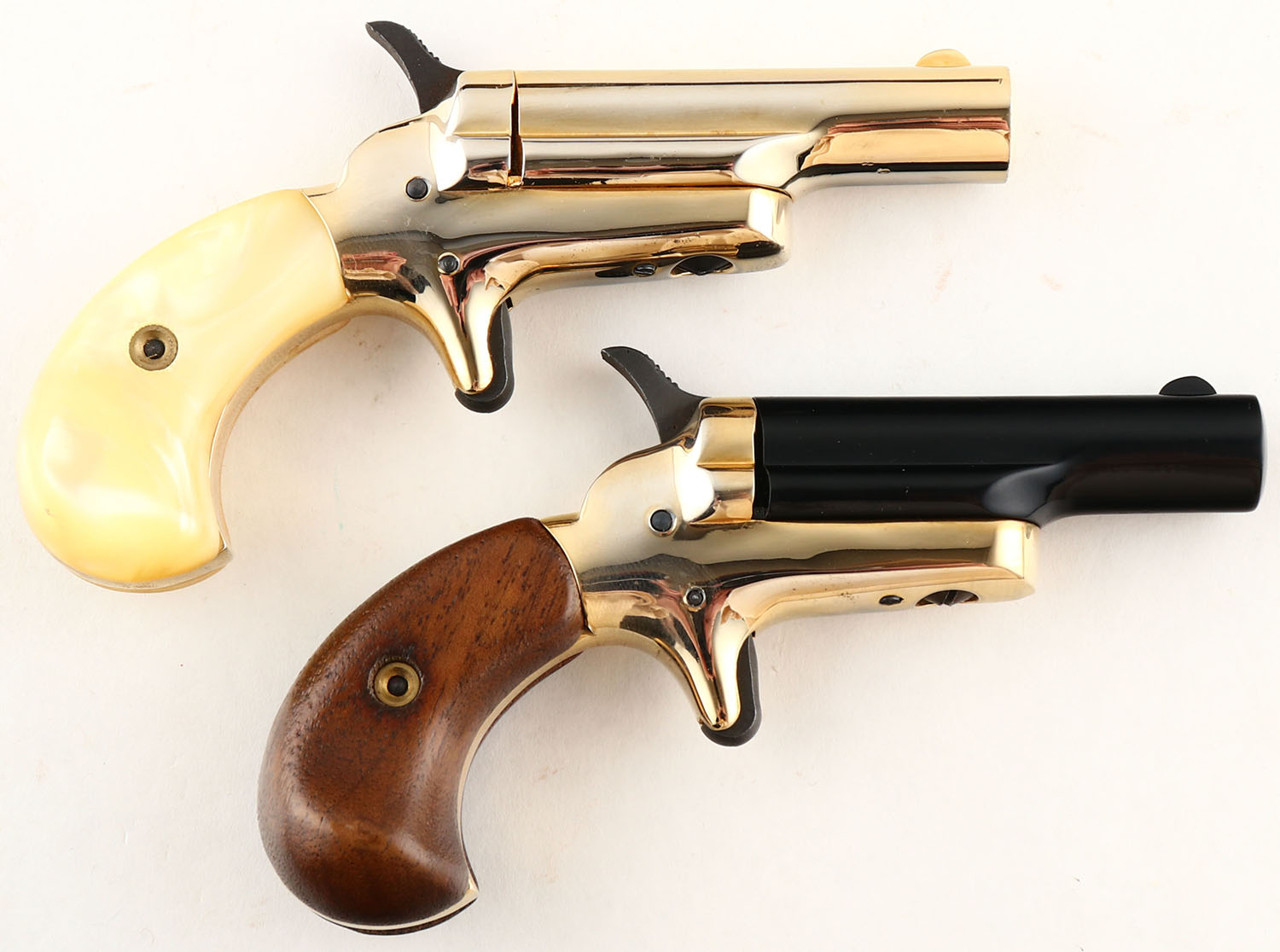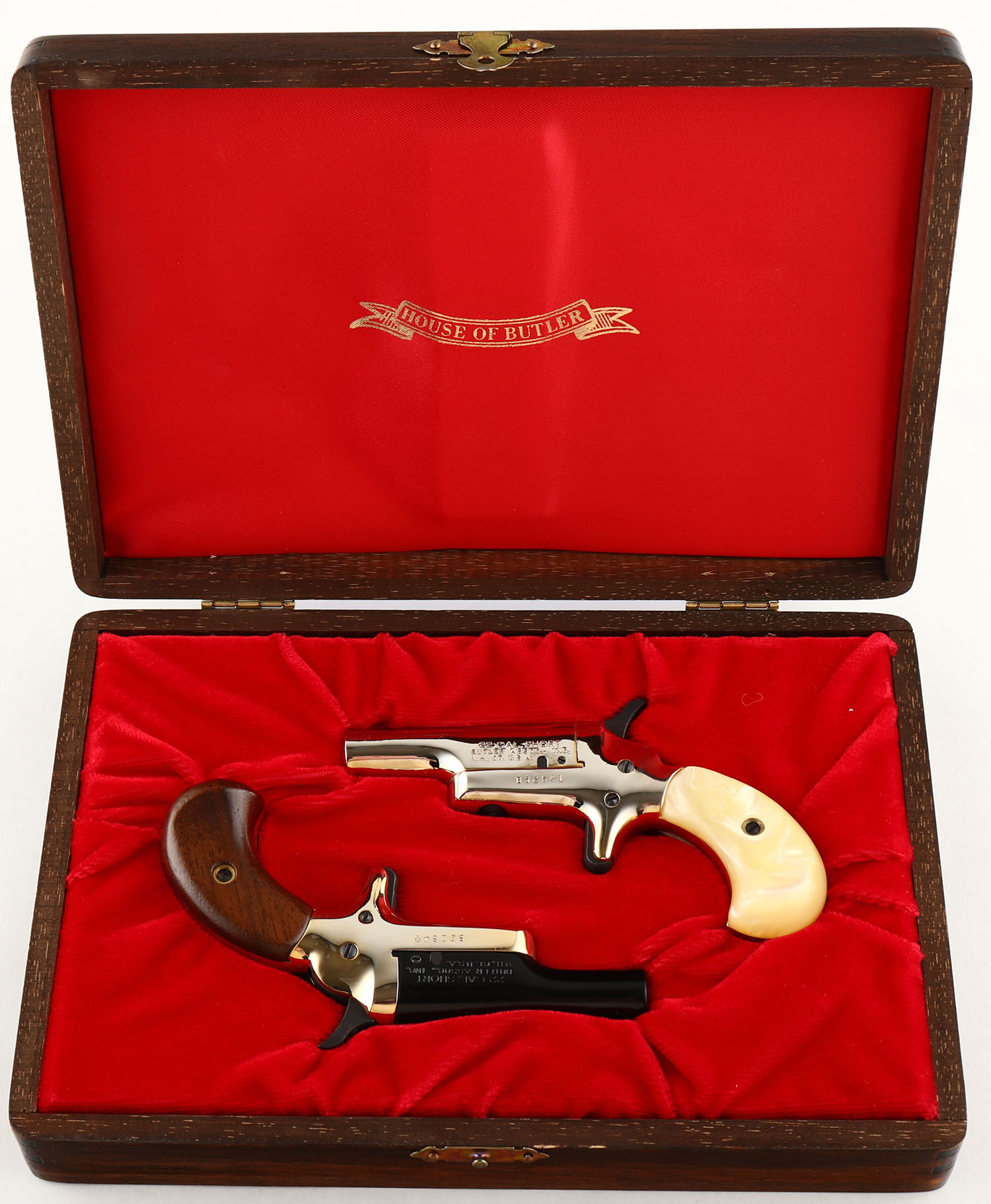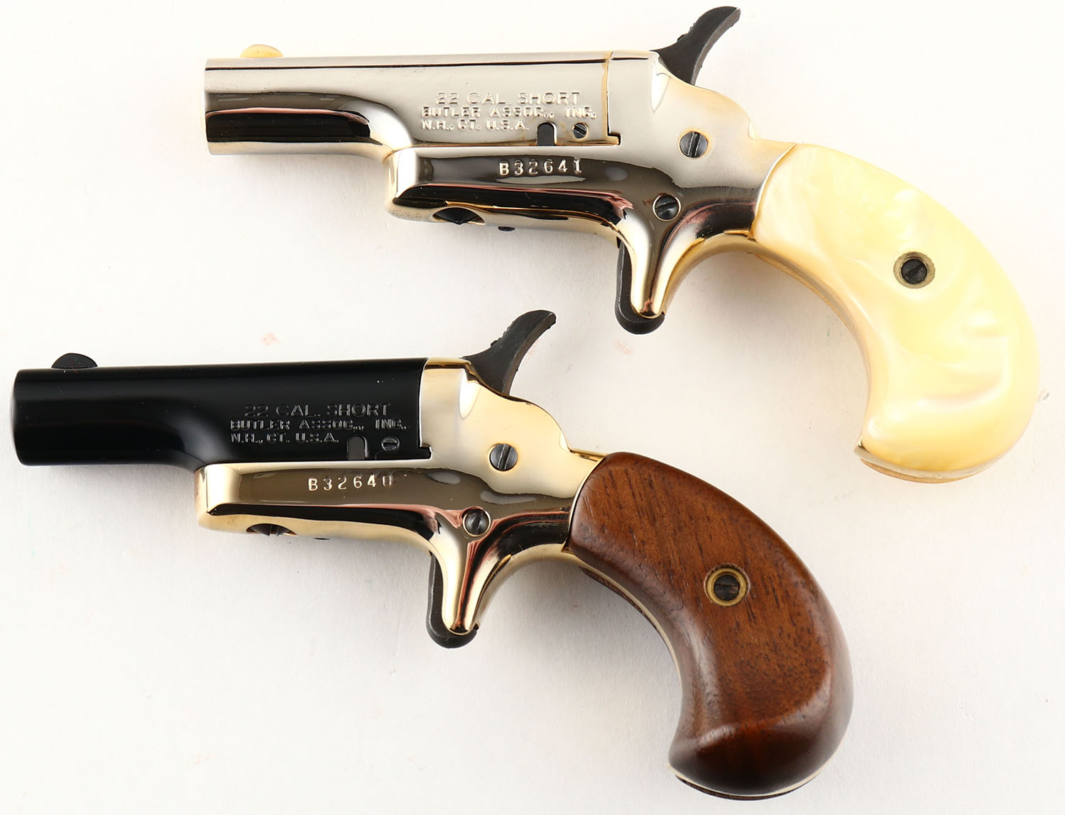 CASED PAIR, Butler Assoc. Inc., US Bicentennial Derringer Set, CAL: 22 S, MFG: Modern, SN: B32640/B32641, Single Shot Pistols, 2 3/8'' barrels. 1) The birds head wood grips are excellent. The black finish on the barrel rates 99% & the high polish gold tone frame is excellent. Bore is very good, with some haze & roughness. Small blade front sight. 2) The faux pearl grips are excellent. The high polish gold tone finish on the barrel rates 98% & the frame rates 99%+. Bore is very good, with some haze & roughness. Small blade front sight. This pair comes in a commemorative wood case. The top of the lid is marked ''U.S BICENTENNIAL 1776 * 1976''. Case condition is excellent. Also comes with outer cardboard box. FFL Req. - Value: 200 to 400