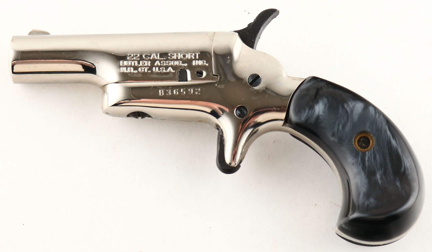 BOXED, Butler, Derringer, CAL: 22 SHORT, MFG: Modern, SN: B36592, Single Action Pistol, 2 3/8'' barrel. The black/silver grips are excellent. The high polish silver finish rates 99% overall. Bore is very good. Blade front sight. Comes in factory box. Internal parts issues, non-functional. Needs to see gunsmith before use. FFL Req. - Value: 100 to 200